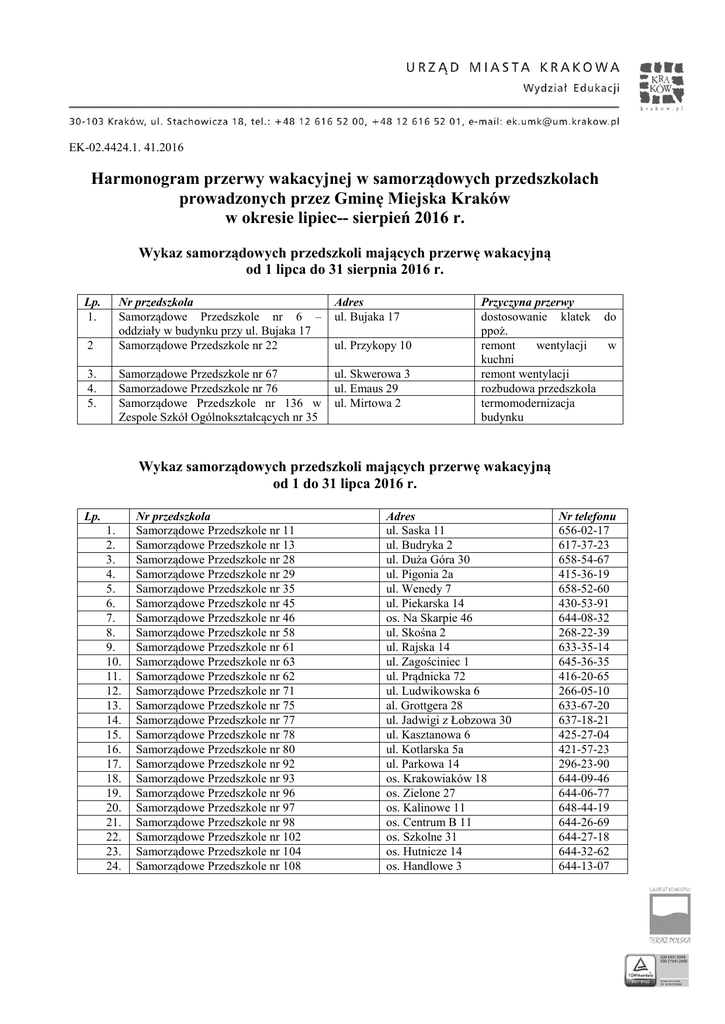 EK-02.4424.1. 41.2016 Harmonogram przerwy wakacyjnej w samorządowych przedszkolach prowadzonych przez Gminę Miejska Kraków w okresie lipiec-- sierpień 2016 r. Wykaz samorządowych przedszkoli mających przerwę wakacyjną od 1 lipca do 31 sierpnia 2016 r. Lp. 1. 2 3. 4. 5. Nr przedszkola Samorządowe Przedszkole nr 6 – oddziały w budynku przy ul. Bujaka 17 Samorządowe Przedszkole nr 22 Adres ul. Bujaka 17 Samorządowe Przedszkole nr 67 Samorzadowe Przedszkole nr 76 Samorządowe Przedszkole nr 136 w Zespole Szkół Ogólnokształcących nr 35 ul. Skwerowa 3 ul. Emaus 29 ul. Mirtowa 2 ul. Przykopy 10 Przyczyna przerwy dostosowanie klatek do ppoż. remont wentylacji w kuchni remont wentylacji rozbudowa przedszkola termomodernizacja budynku Wykaz samorządowych przedszkoli mających przerwę wakacyjną od 1 do 31 lipca 2016 r. Lp. 1. 2. 3. 4. 5. 6. 7. 8. 9. 10. 11. 12. 13. 14. 15. 16. 17. 18. 19. 20. 21. 22. 23. 24. Nr przedszkola Samorządowe Przedszkole nr 11 Samorządowe Przedszkole nr 13 Samorządowe Przedszkole nr 28 Samorządowe Przedszkole nr 29 Samorządowe Przedszkole nr 35 Samorządowe Przedszkole nr 45 Samorządowe Przedszkole nr 46 Samorządowe Przedszkole nr 58 Samorządowe Przedszkole nr 61 Samorządowe Przedszkole nr 63 Samorządowe Przedszkole nr 62 Samorządowe Przedszkole nr 71 Samorządowe Przedszkole nr 75 Samorządowe Przedszkole nr 77 Samorządowe Przedszkole nr 78 Samorządowe Przedszkole nr 80 Samorządowe Przedszkole nr 92 Samorządowe Przedszkole nr 93 Samorządowe Przedszkole nr 96 Samorządowe Przedszkole nr 97 Samorządowe Przedszkole nr 98 Samorządowe Przedszkole nr 102 Samorządowe Przedszkole nr 104 Samorządowe Przedszkole nr 108 Adres ul. Saska 11 ul. Budryka 2 ul. Duża Góra 30 ul. Pigonia 2a ul. Wenedy 7 ul. Piekarska 14 os. Na Skarpie 46 ul. Skośna 2 ul. Rajska 14 ul. Zagościniec 1 ul. Prądnicka 72 ul. Ludwikowska 6 al. Grottgera 28 ul. Jadwigi z Łobzowa 30 ul. Kasztanowa 6 ul. Kotlarska 5a ul. Parkowa 14 os. Krakowiaków 18 os. Zielone 27 os. Kalinowe 11 os. Centrum B 11 os. Szkolne 31 os. Hutnicze 14 os. Handlowe 3 Nr telefonu 656-02-17 617-37-23 658-54-67 415-36-19 658-52-60 430-53-91 644-08-32 268-22-39 633-35-14 645-36-35 416-20-65 266-05-10 633-67-20 637-18-21 425-27-04 421-57-23 296-23-90 644-09-46 644-06-77 648-44-19 644-26-69 644-27-18 644-32-62 644-13-07 25. 26. 27. 28. 29. 30. 31. 32. 33. 34. 35. 36. 37. 38. 39. 40. 41. 42. 43. 44. 45. 46. 47. 48. 49. 50. 51. 52. 53. 54. 55. 56. 57. 58. Samorządowe Przedszkole nr 111 Samorządowe Przedszkole nr 116 Samorządowe Przedszkole nr 121 Samorządowe Przedszkole nr 122 Samorządowe Przedszkole nr 123 Samorządowe Przedszkole nr 124 Samorządowe Przedszkole nr 125 Samorządowe Przedszkole nr 129 Samorządowe Przedszkole nr 131 Samorządowe Przedszkole nr 132 Samorządowe Przedszkole nr 137 Samorządowe Przedszkole nr 138 Samorządowe Przedszkole nr 139 Samorządowe Przedszkole nr 140 Samorządowe Przedszkole nr 142 Samorządowe Przedszkole nr 143 Samorządowe Przedszkole nr 145 Samorządowe Przedszkole nr 151 Samorządowe Przedszkole nr 152 Samorządowe Przedszkole nr 154 Samorządowe Przedszkole nr 162 Samorządowe Przedszkole nr 163 Samorządowe Przedszkole nr 175 Samorządowe Przedszkole nr 178 Samorządowe Przedszkole nr 179 Samorządowe przedszkole nr 185 Samorządowe Przedszkole nr 39 Szkolno-Przedszkolnym nr 2 Samorządowe Przedszkole nr 21 Szkolno-Przedszkolnym nr 3 Samorządowe Przedszkole nr 55 Szkolno-Przedszkolnym nr 4 Samorządowe Przedszkole nr 64 szkolno-Przedszkolno nr 5 Samorządowe Przedszkole nr 19 szko0lno-Przedszkolnym nr 9 Samorządowe Przedszkole nr 27 Szkół nr 2 Samorządowe Przedszkole nr 25 Szkół Ogólnokształcących nr 53 Samorządowe Przedszkole nr 100 w Zespole os. Na Stoku 21 os. Jagiellońskie 16 ul. Stachiewicza 21 ul. Fiołkowa 13 ul. Miechowity 4 ul. Zwycięstwa 22 os. Tysiąclecia 12 ul. Wielicka 76b os. Złotego Wieku 13 ul. Merkuriusza Polskiego 6 ul. Na Błonie 15c ul. Krowoderskich Zuchów 15a ul. Generała Bema 21 ul. Słomiana 8 os. Przy Arce 4 os. Kościuszkowskie 8 ul. Poronińska 7 os. Niepodległości 4 os. Piastów 10 ul. Kurczaba 19 ul. Kazimierza Odnowiciela 4 ul. Podedworze 2a ul. Siewna 23c ul. Sudolska 3 ul. Sanocka 4 os. Dywizjonu 303 49 ul. Porzeczkowa 3 645-14-80 649-81-14 637-43-02 411-85-62 411-29-07 414-37-42 648-26-10 296-67-43 648-30-48 654-73-04 637-55-54 633-02-42 411-05-47 266-10-02 649-00-30 648-00-02 264-91-27 648-58-29 648-03-89 658-26-38 411-04-08 658-27-76 415-64-54 412-71-90 655-46-18 648-37-44 415-47-08 w Zespole ul. Miodowa 36 421-28-56 w Zespole ul. Urzędnicza 65 633-04-58 w Zespole os. Oświecenia 30 649-77-73 w Zespole os. Wyciąże 645-08-87 w Zespole ul. Goszczyńskiego 44 653-27-93 w Zespole ul. Stawowa 179 637-09-50 os. Urocze 15 644-36-85 Wykaz samorządowych przedszkoli mających przerwę wakacyjną od 1 do 31 sierpniu 2016 r. Lp. 1. 2. 3. 4. 5. 6. 7. 8. 9. 10. 11. 12. Nr przedszkola Samorządowe Przedszkole nr 1 Samorządowe Przedszkole nr 2 Samorządowe Przedszkole nr 4 Samorządowe Przedszkole nr 5 Samorządowe Przedszkole nr 6 - oddziały Samorządowe Przedszkole nr 9 Samorządowe Przedszkole nr 10 Samorządowe Przedszkole nr 12 Samorządowe Przedszkole nr 14 Samorządowe Przedszkole nr 20 Samorządowe Przedszkole nr 33 Samorządowe Przedszkole nr 36 Adres ul. Kopernika 16 ul. Twardowskiego 90 ul. Piekarska 12 ul. Zachodnia 6a ul. Bujaka 15 ul. Mlaskotów 2a ul. Strąkowa 7 ul. Miechowity 11 ul. Młyńska Boczna 4 ul. Ułanów 38 ul. Rżącka 1 ul. Okólna 18 Nr telefonu 422-61-42 266-14-39 430-52-93 269-60-11 659-43-11 422-95-57 269-31-43 411-35-02 411-74-30 411-16-78 658-45-64 658-43-20 13. 14. 15. 16. 17. 18. 19. 20. 21. 22. 23. 24. 25. 26. 27. 28. 29. 30. 31. 32. 33. 34. 35. 36. 37. 38. 39. 40. 41. 42. 43. 44. 45. 46. 47. 48. 49. 50. 51. 52. 53. 54. 55. 56. 57. 58. 59. 60. Samorządowe Przedszkole nr 38 Samorządowe Przedszkole nr 43 Samorządowe Przedszkole nr 44 Samorządowe Przedszkole nr 49 Sa