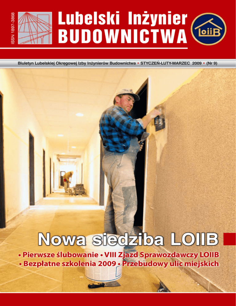 ISSN 1897-3868 Lubelski Inżynier BUDOWNICTWA Biuletyn Lubelskiej Okręgowej Izby Inżynierów Budownictwa • STYCZEŃ-LUTY-MARZEC 2009 • (Nr 9) Nowa siedziba LOIIB • Pierwsze ślubowanie • VIII Zjazd Sprawozdawczy LOIIB • Bezpłatne szkolenia 2009 • Przebudowy ulic miejskich Lubelski Inżynier BUDOWNICTWA 5 PREZYDIUM OKRĘGOWEJ RADY LOIIB Zbigniew Mitura – przewodniczący Tadeusz Cichosz – I wiceprzewodniczący Janusz Iberszer – II wiceprzewodniczący Joanna Gieroba – III wiceprzewodniczący Wojciech Szewczyk – skarbnik Mariusz Bartkowiak – zastępca skarbnika Zbigniew Szcześniak – sekretarz Jan Ludwik Ziółek – zastępca sekretarza SKŁAD OKRĘGOWEJ RADY LOIIB Jerzy Adamczyk Jakub Błażukiewicz Wiesław Bocheńczyk Leszek Boguta Zbigniew Czopik Piotr Dańko Antoni Dzięgielewski Jan Kukiełka Andrzej Mroczek Grzegorz Szpringer Jerzy Szymczyk Tadeusz Wagner Leszek Wiśliński Janusz Wójtowicz Franciszek Ząbek Wiesław Zdańkowski SKŁAD OKRĘGOWEJ KOMISJI KWALIFIKACYJNEJ Bolesław Horyński – przewodniczący Anna Halicka – wiceprzewodnicząca Kazimierz Bonetyński – wiceprzewodniczący Edward Wilczopolski – wiceprzewodniczący Wiesław Nurek – sekretarz Andrzej Adamczuk – członek Janusz Daniel – członek Lech Dec – członek Jerzy Ekiert – członek Jerzy Kamiński – członek Jerzy Kasperek – członek Maria Kosler – członek Andrzej Pichla – członek Stanisław Plechawski – członek Edward Woźniak – członek SKŁAD OKRĘGOWEJ KOMISJI REWIZYJNEJ Wojciech Budzyński – przewodniczący Tomasz Kłyż – wiceprzewodniczący Ewa Błazik-Borowa– sekretarz Bogumiła Błaszczyk – członek Bartłomiej Cieślik – członek Janusz Fronczyk – członek Andrzej Szkuat – członek SKŁAD OKRĘGOWEGO SĄDU DYSCYPLINARNEGO Władysław Król– przewodniczący Elżbieta Komor – wiceprzewodnicząca Zbigniew Adamczuk – członek Zbigniew Dobrowolski – członek Ryszard Dołgan – członek Mieczysław Hryciuk – członek Maria Elżbieta Klimek – członek Kazimierz Kostrzanowski – członek Tomasz Lis – członek Wanda Sierpień – członek Sławomir Smoliński – członek Katarzyna Trojanowska-Żuk– członek Iwona Żak – członek OKRĘGOWY RZECZNIK ODPOWIEDZIALNOŚCI ZAWODOWEJ Andrzej Leniak Henryk Korczewski Krzysztof Miechówka Zenon Misztal Roman Nowak Anna Ostańska Kazimierz Stelmaszczuk CZŁONKOWIE LOIIB WE WŁADZACH KRAJOWYCH POLSKIEJ IZBY INŻYNIERÓW BUDOWNICTWA Joanna Gieroba – członek Prezydium Krajowej Rady PIIB Zbigniew Mitura – członek Krajowej Rady PIIB Edward Woźniak – członek KKK PIIB Mieczysław Król – członek KKK PIIB Tadeusz Cichosz – członek Krajowej Komisji Uchwał i Wniosków LUBELSKA OKRĘGOWA IZBA INŻYNIERÓW BUDOWNICTWA 20-150 Lublin, ul. Bursaki 19 tel./fax 081 534-78-12, 081 532-76-31 www.lub.piib.org.pl e-mail: [email protected] Biuletyn Informacji Publicznej: www.bip.piib.org.pl Biuro czynne: poniedziałek, środa, czwartek, piątek w godz. 8-16; wtorek w godz. 9-17 Konto LOIIB: PEKAO SA 36124054971111000050101920 Przewodniczący Okręgowej Rady tel. 081 534-78-11 Skład biura: Dyrektor biura – tel. 081 534-78-13 Sekretariat biura – tel. 081 534-78-12 Sekcja księgowości – tel. 081 534-78-14 Sekcja ewidencji członków Izby – tel. 081 534-78-16 Sekcja szkoleń – tel. 081 534-78-17 Sekcja uprawnień budowlanych – tel. 081 534-78-17 Sekcja organów Izby – tel. 081 532-76-31 Obsługa prawna i porady – tel. 081 534-73-39 Biuro terenowe w Białej Podlaskiej 21-500 Biała Podlaska, ul. Narutowicza 10 (Dom Technika NOT Oddział Regionalny), pok. nr 2 (I piętro) Terminy dyżurów: w poniedziałki i czwartki w godz. 11-14; w środy w godz. 9-13 [email protected] tel. 083 343-62-05; fax 083 343-60-08 Biuro terenowe w Chełmie 22-100 Chełm, ul. Kopernika 8 (Dom Technika NOT) Terminy dyżurów: we wtorki i czwartki w godz. 15-18; w środy w godz. 15-19 [email protected]; tel. 082 565-69-84 Biuro terenowe w Zamościu 22-400 Zamość, ul. Rynek Wielki 6 (Dom Technika NOT) Terminy dyżurów: w poniedziałki i środy w godz. 13-16; w piątki w godz. 12-16 [email protected]; tel. 084 638-58-08 Dyżury 2009 Członkowie Prezydium Okręgowej Rady LOIIB: – we wtorki w godz. 14-16 Wiceprzewodniczący inż. Tadeusz Cichosz – 27.01; 12.05; 8.09 Wiceprzewodniczący mgr inż. Janusz Iberszer – 10.02; 09.06; 29.09 Wiceprzewodniczący mgr inż. Joanna Gieroba – 3.03; 14.07; 27.10 Sekretarz mgr inż. Zbigniew Szcześniak – 21.04; 30.06; 24.11 Skarbnik mgr inż. Wojciech Szewczyk – 24.03; 04.08; 11.12 Rzecznik Odpowiedzialności Zawodowej: w Lublinie, tel. 081 534-73-39 – pierwsza środa miesiąca godz. 15-16 2 Członkowie Okręgowej Komisji Kwalifikacyjnej: – w drugi wtorek miesiąca w godz. 16-17 dr inż. Bolesław Horyński – 13.01; 14.04; 11.08; 10.11 dr inż. Wiesław Nurek – 10.02; 12.05; 14.07; 8.12 mgr inż. Edward Wilczopolski – 10.03; 9.06; 8.09; 11.10 Radca Prawny: Lublin, tel. 081 534-73-39 – w każdą środę w godz. 9-13 – w każdy piątek w godz. 9-11 Lubelski Inżynier BUDOWNICTWA Lubelski Inżynier BUDOWNICTWA Biuletyn Lubelskiej Okręgowej Izby Inżynierów Budownictwa • STYCZEŃ-LUTY-MARZEC 2009 (Nr 9) • ISSN 1897-3868 Nr 1/2009 Nr R. Pr. 895/06 LOIIB w Lublinie Nakład: 5 700 egz. Wydawca Lubelska Okręgowa Izba Inżynierów Budownictwa 20-150 Lublin, ul. Bursaki 19 tel./fax 081 534-78-12 www.lub.piib.org.pl e-mail: [email protected] Dużo zdrowia, pogody ducha i radości z okazji Świąt Wielkanocnych oraz wszelkiej pomyślności w pracy zawodowej i społecznej życzą Okręgowa Rada, działacze i pracownicy Lubelskiej Okręgowej Izby Inżynierów Budownictwa oraz Rada Programowa „Lubelskiego Inżyniera Budownictwa” Redakcja 20-150 Lublin ul. Bursaki 19 tel. 081 534-73-36 e-mail: [email protected] Redaktor naczelna Urszula Kieller-Zawisza tel. 081 534-73-36 e-mail: [email protected] Rada programowa Janusz Iberszer – przewodniczą