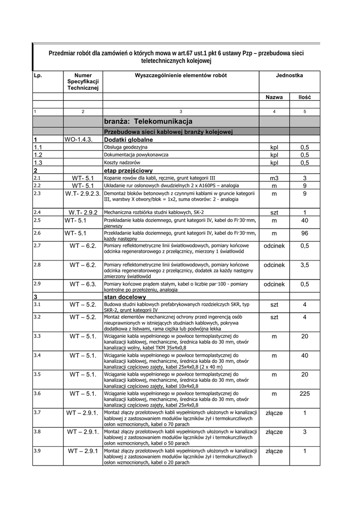 Przedmiar robót dla zamówień o których mowa w art.67 ust.1 pkt 6 ustawy Pzp – przebudowa sieci teletechnicznych kolejowej Lp. 1 Numer Specyfikacji Technicznej Wyszczególnienie elementów robót 2 3 Jednostka Nazwa Ilość 4 5 kpl kpl kpl 0,5 0,5 0,5 m3 m m 3 9 9 szt m 1 40 m 96 odcinek 0,5 branża: Telekomunikacja Przebudowa sieci kablowej branży kolejowej Dodatki globalne 1 1.1 1.2 1.3 2 WO-1.4.3. 2.1 WT- 5.1 WT- 5.1 W.T- 2.9.2.3. Kopanie rowów dla kabli, ręcznie, grunt kategorii III W.T- 2.9.2 WT- 5.1 Mechaniczna rozbiórka studni kablowych, SK-2 2.5 2.6 WT- 5.1 2.2 2.3 2.4 Obsługa geodezyjna Dokumentacja powykonawcza Koszty nadzorów etap przejściowy Układanie rur osłonowych dwudzielnych 2 x A160PS – analogia Demontaż bloków betonowych z czynnymi kablami w gruncie kategorii III, warstwy X otwory/blok = 1x2, suma otworów: 2 - analogia Przekładanie kabla doziemnego, grunt kategorii IV, kabel do Fi·30·mm, pierwszy Przekładanie kabla doziemnego, grunt kategorii IV, kabel do Fi·30·mm, każdy następny Pomiary reflektometryczne linii światłowodowych, pomiary końcowe odcinka regeneratorowego z przełącznicy, mierzony 1 światłowód 2.7 WT – 6.2. 2.8 WT – 6.2. Pomiary reflektometryczne linii światłowodowych, pomiary końcowe odcinka regeneratorowego z przełącznicy, dodatek za każdy następny zmierzony światłowód odcinek 3,5 2.9 WT – 6.3. Pomiary końcowe prądem stałym, kabel o liczbie par·100 - pomiary kontrolne po przełożeniu, analogia odcinek 0,5 Budowa studni kablowych prefabrykowanych rozdzielczych SKR, typ SKR-2, grunt kategorii IV Montaż elementów mechanicznej ochrony przed ingerencją osób nieuprawnionych w istniejących studniach kablowych, pokrywa dodatkowa z listwami, rama ciężka lub podwójna lekka szt 4 szt 4 3 stan docelowy 3.1 WT – 5.2. 3.2 WT – 5.2. 3.3 WT – 5.1. Wciąganie kabla wypełnionego w powłoce termoplastycznej do kanalizacji kablowej, mechaniczne, średnica kabla do 30 mm, otwór kanalizacji wolny, kabel TKM 35x4x0,8 m 20 3.4 WT – 5.1. Wciąganie kabla wypełnionego w powłoce termoplastycznej do kanalizacji kablowej, mechaniczne, średnica kabla do 30 mm, otwór kanalizacji częściowo zajęty, kabel 25x4x0,8 (2 x 40 m) m 40 3.5 WT – 5.1. Wciąganie kabla wypełnionego w powłoce termoplastycznej do kanalizacji kablowej, mechaniczne, średnica kabla do 30 mm, otwór kanalizacji częściowo zajęty, kabel 10x4x0,8 m 20 3.6 WT – 5.1. Wciąganie kabla wypełnionego w powłoce termoplastycznej do kanalizacji kablowej, mechaniczne, średnica kabla do 30 mm, otwór kanalizacji częściowo zajęty, kabel 25x4x0,8 m 225 3.7 WT – 2.9.1. Montaż złączy przelotowych kabli wypełnionych ułożonych w kanalizacji kablowej z zastosowaniem modułów łączników żył i termokurczliwych osłon wzmocnionych, kabel o 70 parach złącze 1 3.8 WT – 2.9.1. Montaż złączy przelotowych kabli wypełnionych ułożonych w kanalizacji kablowej z zastosowaniem modułów łączników żył i termokurczliwych osłon wzmocnionych, kabel o 50 parach złącze 3 3.9 WT – 2.9.1 Montaż złączy przelotowych kabli wypełnionych ułożonych w kanalizacji kablowej z zastosowaniem modułów łączników żył i termokurczliwych osłon wzmocnionych, kabel o 20 parach złącze 1 3.13 WT – 6.3. WT – 6.3 WT – 6.3 WT – 5.1. 3.14 WT – 5.1. 3.15 WT – 2.9.2. 3.10 3.11 3.12 3.16 Pomiary końcowe prądem stałym, kabel o liczbie par·70 Pomiary końcowe prądem stałym, kabel o liczbie par·50 Pomiary końcowe prądem stałym, kabel o liczbie par·20 Wyciąganie kabla w powłoce termoplastycznej z kanalizacji kablowej, otwór z 1-kablem, kabel do Fi·30·mm Wciąganie kabla w powłoce termoplastycznej do kanalizacji kablowej, mechaniczne, otwór wolny, średnica kabla do 30·mm, kabel OTK 8J Montaż skrzynek zapasów kabli światłowodowych, montaż w studni Montaż złączy końcowych kabli światłowodowych, kabel tubowy, przełącznica jeden światłowód kabel tubowy, Montaż złączystojakowa, końcowych kablispajany światłowodowych, odcinek odcinek odcinek m 0,5 1,5 0,5 240 m 1 200,00 szt 1 3.19 WT – 2.5 WT – 2.5 WT – 2.5 WT – 2.6 3.20 WT – 6.2 Pomiary reflektometryczne linii światłowodowych, pomiary końcowe odcinka regeneratorowego z przełącznicy, mierzony 1 światłowód odcinek 1 3.21 WT – 6.3. Pomiary reflektometryczne linii światłowodowych, pomiary końcowe odcinka regeneratorowego z przełącznicy, dodatek za każdy następny zmierzony światłowód odcinek 4 3.22 WT – 6.2 Pomiary tłumienności optycznej linii światłowodowych metodą transmisyjną, pomiar przeprowadzany razem z innymi pomiarami, mierzony 1 światłowód odcinek 1 3.23 WT – 6.3. Pomiary tłumienności optycznej linii światłowodowych metodą transmisyjną, pomiar przeprowadzany razem z innymi pomiarami, dodatek za każdy następny zmierzony światłowód odcinek 4 4.1 WT – 5.2. szt 1 4.2 WT – 5.2 Budowa studni kablowych prefabrykowanych rozdzielczych dwuelementowych, SK-2, grunt kategorii III Montaż elementów mechanicznej ochrony przed ingerencją osób nieuprawnionych w istniejących studniach kablowych, pokrywa dodatkowa z listwami, rama ciężka lub podwójna lekka szt 1 4.3 WT – 5.2 m 33 4.4 WT – 5.1. Budowa kanalizacji kablowej z rur DVR 110 w gruncie kategorii III, warstwy X rury/warstwa = 1x2, suma otworów: 2 Wciąganie kabla wypełnionego w powłoce termoplastycznej do kanalizacji kablowej, mechaniczne, średnica kabla do 30 mm, otwór kanalizacji wolny, kabel TKM 35x4x0,8 m 35 4.5 WT – 5.1. m 35 4.6 WT –2.9.1. Wciąganie kabla wypełnionego w powłoce termoplastycznej do kanalizacji kablowej, mechaniczne, średnica kabla do 30 mm, otwór kanalizacji częściowo zajęty, kabel 15x4x0,8 Montaż złączy przelotowych kabli wypełnionych ułożonych w kanalizacji kablowej z zastosowaniem modułów łączników żył i termokurczliwych osłon wzmocnionych, kabel o 70 parach złącze 1 4.7 WT – 2.9.1.