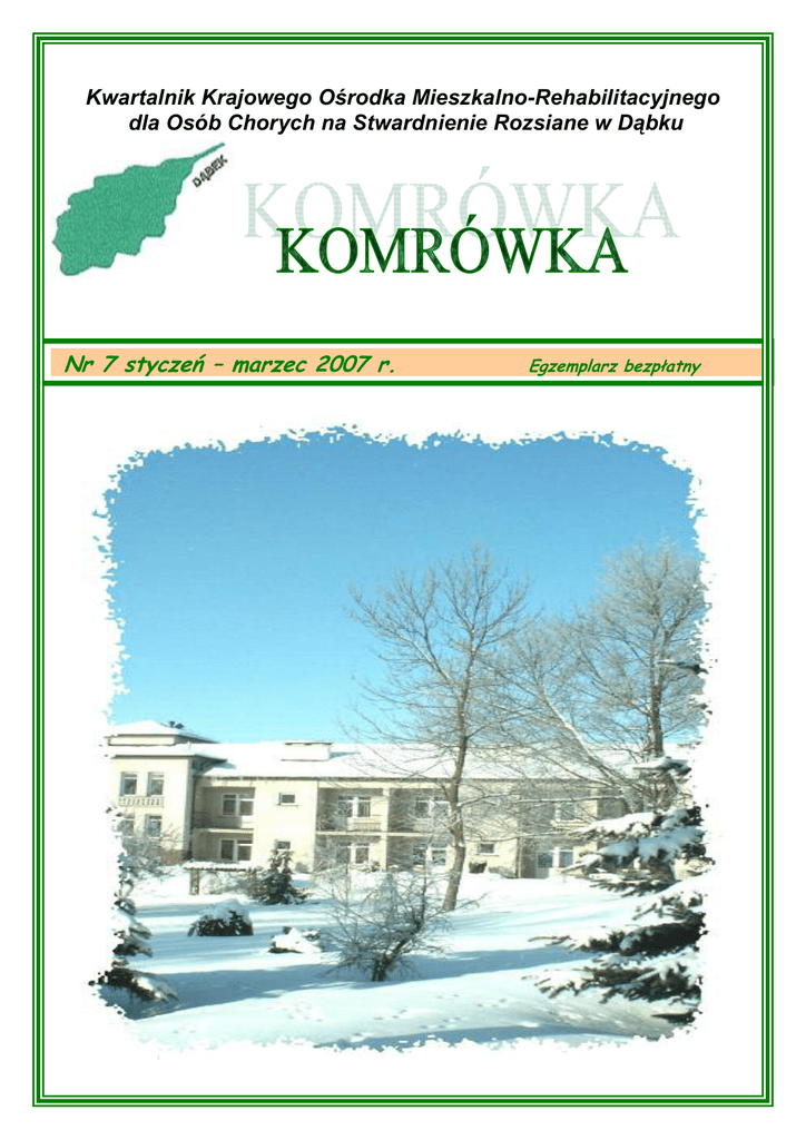 Kwartalnik Krajowego O rodka Mieszkalno-Rehabilitacyjnego dla Osób Chorych na Stwardnienie Rozsiane w D bku Nr 7 stycze – marzec 2007 r. Egzemplarz bezp atny Warto wiedzie%... Kto choruje na SM? Gdyby przyczyna stwardnienia rozsianego by a znana, a przebieg w pe ni zrozumia y, mo na powiedzie , kto mo e sta si ofiar tej choroby. Neurolodzy s zdania, e jak dot d, pomimo pewnych eksperymentalnych przes anek, specjalistyczne badania krwi nie mog jednoznacznie wykaza podatno#ci na SM. Badania naukowe dostarczaj interesuj cych danych, które wskazuj na pewne schematy. Stwardnienie rozsiane jest, niestety, chorob ludzi m odych. Jego objawy pojawiaj si najcz #ciej mi dzy okresem pó)nego dzieci*stwa, a wiekiem pi dziesi ciu kilku lat, przy czym najwi ksze nasilenie zachorowa* wyst puje mi dzy dwudziestym dziewi tym a trzydziestym trzecim rokiem ycia. Przy u yciu specjalnych technik badawczych, jak rezonans magnetyczny, mo na rozpozna stwardnienie rozsiane jeszcze w dzieci*stwie. Wraz z wiekiem maleje ryzyko zapadni cia, na SM, niemniej w rzadkich przypadkach mo liwe jest pojawienie si objawów w wieku lat sze# dziesi ciu kilku. Kobiety choruj cz #ciej; na dwóch m czyzn z SM przypadaj trzy kobiety. Zwykle te objawy wyst puj u nich w m odszym wieku. Ca y #wiat mo na podzieli na strefy o ró nym stopniu ryzyka zachorowania. Im bli ej równika lub biegunów, tym przypadki SM s rzadsze. Najwi cej zachorowa* notuje si w pasie pomi dzy 40. a 60. stopniem szeroko#ci geograficznej. Na pó kuli pó nocnej ten pas obejmuje #rodkow i pó nocna Europ , Islandi , Kanad i pó nocne stany USA. Na po udniowej – Now Zelandi , Tasmani , a tak e po udniow cz # Australii. Ludzie urodzeni w strefie „wysokiego ryzyka”, którzy w pó)niejszym wieku przeprowadzili si w inne rejony, s nadal w wi kszym stopniu podatni na SM. Istnieje równie zale no# w przeciwn stron . Ludzie, którzy sp dzili dzieci*stwo w strefie „niskiego ryzyka”, zwykle nie choruj na SM. Stwardnienie rozsiane znacznie cz #ciej wyst puje u ludzi bia ych ni u innych ras. Nie spotyka si go w plemieniu Bantu, w#ród Eskimosów i Indian. Rzadko wyst puje u Chi*czyków i Japo*czyków, u których stwierdzono jednak specyficzn odmian tej, choroby. C.d.n. Poznaj swoje prawa ... Twoje marzenie to wózek elektryczny lub komputer? Pomo e Ci je spe ni Pa*stwowy Fundusz Rehabilitacji Osób Niepe nosprawnych i kolejna edycja programu PEGAZ 2003. W ramach tego programu osoby z dysfunkcj r k i/lub nóg mog uzyska dofinansowanie na zakup wózka elektrycznego, oprzyrz dowania do samochodu oraz sprz tu komputerowego. Termin sk adania wniosków mija 28 lutego 2007r. Zg o+ si, do w a+ciwego oddzia u PFRON-u lub Powiatowego Centrum Pomocy Rodzinie - tam otrzymasz szczegó owe informacje i druki wniosków. O w waanniiee ooddbbiioorrnniikkóów Opp aattyy zzaa uu44yyw rraaddiioow wiizzyyjjnnyycchh wyycchh ii tteelleew Z op at za u4ywanie odbiorników radiowych i telewizyjnych zwolnione s5: osoby zaliczone do I grupy inwalidów; osoby z orzeczeniem o znacznym stopniu niepe nosprawno#ci; osoby ca kowicie niezdolne do pracy i samodzielnej egzystencji; osoby o trwa ej lub okresowej ca kowitej niezdolno#ci do pracy w gospodarstwie rolnym, którym przys uguje dodatek piel gnacyjny; Poznaj swoje prawa... osoby, które sko*czy y 75 lat; osoby, które otrzymuj #wiadczenie piel gnacyjne z w a#ciwego organu realizuj cego zadania w zakresie #wiadcze* rodzinnych jako zadanie zlecone z zakresu administracji rz dowej lub rent socjaln z Zak adu Ubezpiecze* Spo ecznych lub innego organu emerytalno-rentowego; osoby nies ysz ce, u których stwierdzono ca kowit g uchot lub obustronne upo#ledzenie s uchu; osoby, których ostro# wzroku nie przekracza 15%; inwalidzi wojenni i wojskowi; kombatanci, niektóre osoby b d ce ofiarami represji wojennych i okresu powojennego oraz wdowy i wdowcy po kombatantach, którzy s jednocze#nie emerytami lub rencistami. Uwaga: od 16 maja 2005 r. zwolnienie nie przys uguje osobom, które mieszkaj5 we wspólnym gospodarstwie domowym, z co najmniej dwiema osobami, które uko czy y 26. rok 4ycia, i które nie spe niaj5 warunków do uzyskania tych zwolnie . Dekalog szcz,+liwca. • • • • • • • • • • Cz owiek rodzi si zm czony i yje, aby odpoczywa . Kochaj swe ó ko jak siebie samego. Odpoczywaj w dzie*, aby# móg spa w nocy. Je#li widzisz kogo# odpoczywaj cego, pomó mu. Praca jest m cz ca, wi c nale y jej unika . Co masz zrobi dzi# zrób pojutrze - b dziesz mia dwa dni wolnego. Je#li zrobienie czego# sprawia ci trudno# , pozwól zrobi to innym. Nadmiar odpoczynku nikogo nie doprowadzi( ) do #mierci. Kiedy ogarnia ci ochota do pracy, usi d) i poczekaj a ci przejdzie. Praca uszlachetnia, lenistwo uszcz #liwia. Mieszka cy pisz5… List do Joanny lub 4ycie w+ród „P,puszków =wiata” Droga Joanno, jestem w D bku. Przyjecha am tu skorzysta z rehabilitacji i odpocz . Przy okazji patrz jak radz sobie mieszka*cy o#rodka. A radz sobie wy#mienicie. Otacza mnie 51 wyj tkowo zaradnych P puszków Lwiata. Oto 1 P puszek. Na sto ówce. Siada przy stole, ale przeszkadza mu stoj ce obok krzes o, wi c odsuwa je za siebie, na #rodek. Tarasuje w ten sposób drog mi dzy sto ami i utrudnia przej#cie innym osobom. Ale tego nie widzi, bo nawet si za siebie nie obejrza . On siedzi i je wygodnie, a inni... A to P puszek 2. W azience na korytarzu. Widz w czone #wiat o, wi c czekam, bo to oznacza, e kto# jest w #rodku. Jeszcze kilka minut i pukam, bo chc skorzysta z toalety. A w #rodku nikogo nie ma. Poprzedni u ytkownik po prostu nie zgasi #wiat a. Od czekania pod drzwiami i gaszenia #wiate s inni... Albo 3 kolejne P puszki Lwiata. Mwiczymy w grupie na sali. Po kilku minutach od rozpocz cia zaj wchodz 3 osoby. Mwiczenia zostaj przerwane, bo szukaj miejsca. Potrzebuj pomocy prowadz cej. By znale) miejsca trzeba poprzesadza niektórych uczestników zaj , skorygowa wysoko# sto u do wicze* i rozda przybory. Czekamy. Po kolejnych kilku minutach zaj cia zostaj wznowi