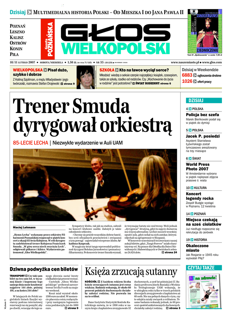 Dzisiaj > Multimedialna historia Polski – Od Mieszka I do Jana Pawła II Poznań Leszno Kalisz Ostrów Konin Piła ¬ sobota/niedziela ¬ 1,50 zł (w tym 7% VAT) WIELKOPOLSKA > Pisał dużo, szybko i dobrze Z Haliną Szpilman, o mężu Władysławie i jego twórczości, rozmawia Stefan Drajewski > strona 9 ¬ nr 35 FOT. JANUSZ ROMANISZYN 10/11 lutego 2007 Tom IV „Zjednoczenie” w cenie 7,90 zł www.naszemiasto.pl • www.glos.com (19.129) • NR INDEKSU 350281 SZKOŁA > Kto na ławce wyciął serce? Dzisiaj w Weekendzie Młodzież wiedzę o seksie czerpie najczęściej z książek, czasopism, 6883 > ogłoszenia drobne także ze szkoły, rzadko od rodziców. Czy „Wychowanie do życia 1026 > ofert pracy w rodzinie” jest potrzebne? > ŚWIAT RODZINNY strona 6 Trener Smuda dyrygował orkiestrą DZISIAJ 4 > POLSKA Policja bez szefa Marek Bieńkowski podał się w piątek do dymisji 5 > POLSKA Jacek P. posiedzi Asystent Stanisława Łyżwińskiego został tymczasowo aresztowany na trzy miesiące 85-LECIE LECHA | Niezwykłe wydarzenie w Auli UAM 6 > ŚWIAT World Press Photo 2007 W Amsterdamie wybrano w piątek najlepsze zdjęcia prasowe świata 10 > KULTURA Koncert legendy rocka FOT. PIOTR JASICZEK Zespół Budgie wystąpi w Poznaniu 12 kwietnia 14 > POZNAŃ Maciej Lehmann „Hymn Lecha” wykonany przez orkiestrę Filharmonii Poznańskiej rozpoczął w piątek koncert z okazji 85-lecia Kolejorza. W roli dyrygenta zadebiutował trener Kolejorza Franciszek Smuda. „W górę serca niech zwycięża Lech”, odśpiewali piłkarze i kibice. Wydarzeniu patronował „Głos Wielkopolski”. Sympatycy klubu, tak jak na stadion, zabrali na koncert klubowe szaliki. Założyli je także członkowie orkiestry. – Chcemy się przede wszystkim dobrze bawić, bez serii oficjalnych przemówień i związanej z tym powagi – zapowiadał wiceprezes klubu Arkadiusz Kasprzak. W magiczny świat tanga wprowadził publiczność dyrygent Bohdan Jarmołowicz i poznańscy filharmonicy. Po koncercie trener Smuda wyznał, Dziwna podwyżka cen biletów Wydanie 1 TRANSPORT > Czy taki sam bilet na ten sam lot, w tej samej klasie i kupowany tego samego dnia może kosztować najpierw 144 złote, później 191, a na końcu 244 złote? W latających do Polski angielskich liniach EasyJet wystarczy podczas internetowej rezerwacji raz się pomylić, aby po chwili, wracając do tego sa- mego zlecenia zastać kwoty o kilkadziesiąt procent wyższe. Czytelnik „Głosu Wielkopolskiego” próbował zarezerwować lot dla 9 osób na majowy weekend. Koszt miał wynieść około 1500 euro za całość. W momencie płacenia coś się rozłączyło i przy następnym logowaniu cena podskoczyła już do 1800 > strona 9 euro. że trzymając batutę nie czuł tremy. Woli jednak „dyrygować” drużyną, gdyż to zajęcie dostarcza mu więcej adrenaliny. Lechici musieli wcześniej opuścić aulę, gdyż czekał na nich autokar, którym odjechali na zgrupowanie w Hiszpanii. W koncercie uczestniczyli też zwycięzcy naszej aukcji biletów, gdyż „Tango Forever” miało charytatywny cel. Na pomoc dla Ośrodka dla Dzieci Niewidomych i Słabowidzących w Owińskach zebra> strona 24 no 24.624 złote. Księża zrzucają sutanny KOŚCIÓŁ > Z każdym rokiem liczba księży zrzucających sutannę jest coraz większa. Badania wskazują, że około 60 procent polskich duchownych chciałoby założyć rodzinę. Nie pozwala im na to celibat. Dane Instytutu Statystyki Kościoła Katolickiego mówią, że w 1998 roku w naszym kraju z kapłaństwa zrezygnowało 32 duchownych, a sześć lat później już 57. Badania profesora Józefa Baniaka z Wydziału Teologicznego UAM wskazują, że w ubiegłym roku tylko w trzech polskich diecezjach zrezygnowało z kapłaństwa aż 60 osób. Nie ma pełnych danych o tym, czy te odejścia miały związek z celibatem. Te same badania wskazały jednak, że 60 procent spośród ankietowanych duchownych chciałoby założyć rodzinę. > strona 3 Miejsca czekają na sześciolatków Już niedługo rozpocznie się rekrutacja do zerówek 19 > HISTORIA Okaleczone miasto Jak Rosjanie w 1945 roku wyzwalali Piłę? CZYTAJ TAKŻE 2 Flesz uchwycone w kadrze Głos Wielkopolski, sobota/niedziela 10/11 lutego 2007 i administracji Markiem Surmaczem, o którym z kolei jeśli już pisano, to głównie w negatywnym kontekście (niejasne sytuacje z przeszłości, wysyłanie policjantów po wieśmaki dla pani minister podróżującej koleją). Dymisja Bieńkowskiego może oznaczać, że z tej dwójki postawiono na Surmacza. Czyż nie przypomina to sytuacji z Radosławem Sikorskim i Antonim Macierewiczem? Często ostatnio pojawiały się opinie, że trudno znaleźć klucz do zmian personalnych, dokonywanych na najwyższych szczeblach władzy w Polsce. Otóż – nie! Jest prosty sposób przewidzenia, kto jako kolejny zostanie „odstrzelony”. Wystarczy uważnie śledzić, o kim pozytywnie wypowiadają się osoby spoza obozu rządowego. Klucz dozmian Artur Boiński [email protected] O Marku Bieńkowskim jako szefie polskiej policji można było usłyszeć raczej pozytywne opinie. I to także opinie pochodzące spoza kręgów rządowych. Od jakiegoś czasu wiadomo było o jego konflikcie z wiceministrem spraw wewnętrznych FOT. ANDRZEJ ŚWIĄTEK KOMENTARZ DNIA Poznań, Park Sołacki, piątek. Posypało, ochłodziło się i... bez kubraka strach wyjść na spacer SYLWETKA DNIA NASZA SONDA URODZILI SIĘ > 1939 – Władysław Żmuda, polski piłkarz i trener > 1940 – Roberta Flack, amerykańska wokalistka > 1946 – Krystyna Łybacka, polityk SLD z Wielkopolski > 1950 – Mark Spitz, amerykański pływak, dziewięciokrotny mistrz olimpijski > 1966 – Renata Przemyk, polska piosenkarka PONIEDZIAŁEK komu niepotrzebny sprzęt AGD. Lodówki, żelazka i telewizory trafiły do domów Temat dzisiejszej sondy > strona 3 Pogoda na weekend Słońce 0OC -5OC wsch. 7.20 zach. 16.56 Piła -3OC -7OC -4OC -8OC Księżyc 0OC -4OC wsch. 1.26 zach.