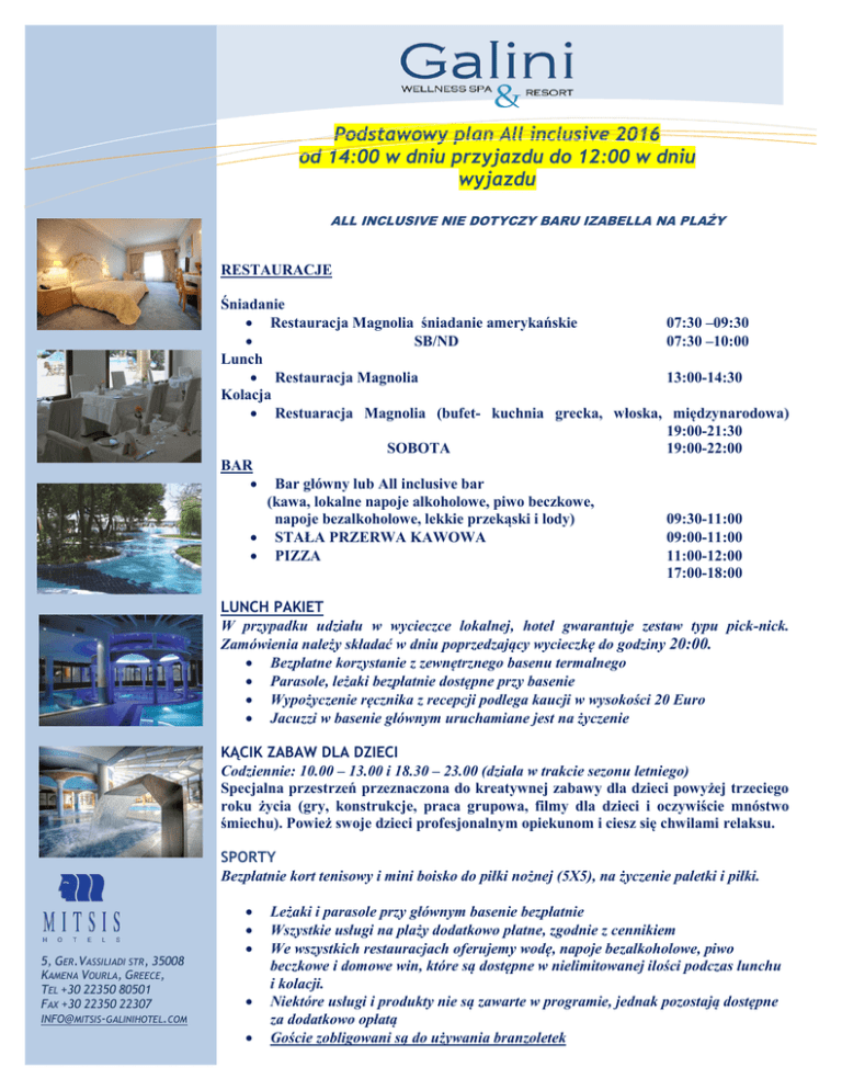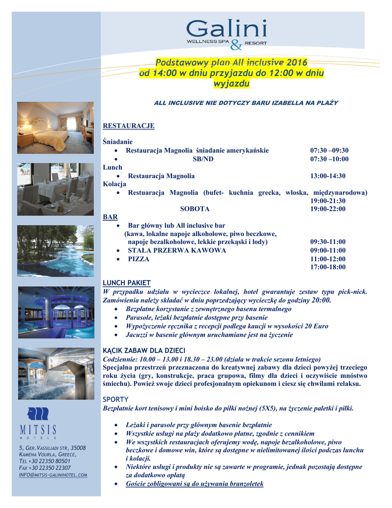 Information Technology Solutions Podstawowy plan All inclusive 2016 od 14:00 w dniu przyjazdu do 12:00 w dniu wyjazdu ALL INCLUSIVE NIE DOTYCZY BARU IZABELLA NA PLAŻY RESTAURACJE Śniadanie Restauracja Magnolia śniadanie amerykańskie SB/ND Lunch Restauracja Magnolia Kolacja Restuaracja Magnolia (bufet- kuchnia grecka, włoska, SOBOTA 07:30 –09:30 07:30 –10:00 13:00-14:30 międzynarodowa) 19:00-21:30 19:00-22:00 BAR Bar główny lub All inclusive bar (kawa, lokalne napoje alkoholowe, piwo beczkowe, napoje bezalkoholowe, lekkie przekąski i lody) STAŁA PRZERWA KAWOWA PIZZA 09:30-11:00 09:00-11:00 11:00-12:00 17:00-18:00 LUNCH PAKIET W przypadku udziału w wycieczce lokalnej, hotel gwarantuje zestaw typu pick-nick. Zamówienia należy składać w dniu poprzedzający wycieczkę do godziny 20:00. Bezpłatne korzystanie z zewnętrznego basenu termalnego Parasole, leżaki bezpłatnie dostępne przy basenie Wypożyczenie ręcznika z recepcji podlega kaucji w wysokości 20 Euro Jacuzzi w basenie głównym uruchamiane jest na życzenie KĄCIK ZABAW DLA DZIECI Codziennie: 10.00 – 13.00 i 18.30 – 23.00 (działa w trakcie sezonu letniego) Specjalna przestrzeń przeznaczona do kreatywnej zabawy dla dzieci powyżej trzeciego roku życia (gry, konstrukcje, praca grupowa, filmy dla dzieci i oczywiście mnóstwo śmiechu). Powież swoje dzieci profesjonalnym opiekunom i ciesz się chwilami relaksu. SPORTY Bezpłatnie kort tenisowy i mini boisko do piłki nożnej (5Χ5), na życzenie paletki i piłki. 5, GER.VASSILIADI STR, 35008 ΚAMEΝΑ VOURLA, GREECE, TEL +30 22350 80501 FAX +30 22350 22307 [email protected] WWW.MITSISHOTELS.COM Leżaki i parasole przy głównym basenie bezpłatnie Wszystkie usługi na plaży dodatkowo płatne, zgodnie z cennikiem We wszystkich restauracjach oferujemy wodę, napoje bezalkoholowe, piwo beczkowe i domowe win, które są dostępne w nielimitowanej ilości podczas lunchu i kolacji. Niektóre usługi i produkty nie są zawarte w programie, jednak pozostają dostępne za dodatkowo opłatą Goście zobligowani są do używania branzoletek