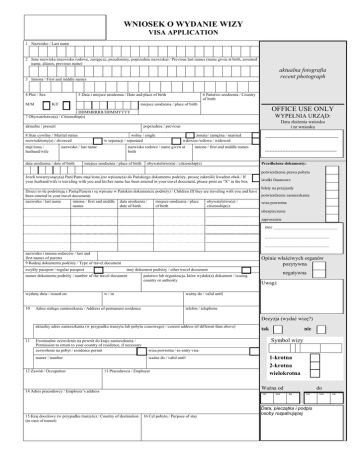 WNIOSEK O WYDANIE WIZY VISA APPLICATION 1 Nazwisko / Last name 2 Inne nazwiska (nazwisko rodowe, zastępcze, pseudonimy, poprzednie nazwiska) / Previous last names (name given at birth, assumed name, aliases, previous name) aktualna fotografia recent photograph 3 Imiona / First and middle names 4 Płeć / Sex M/M 5 Data i miejsce urodzenia / Date and place of birth K/F 6 Państwo urodzenia / Country of birth miejsce urodzenia / place of birth OFFICE USE ONLY DDMMRRRR/DDMMYYYY 7 Obywatelstwo(a) / Citizenship(s) aktualne / present Data złożenia wniosku i nr wniosku poprzednie / previous 8 Stan cywilny / Marital status rozwiedziony(a) / divorced mąż/żona / husband/wife WYPEŁNIA URZĄD: wolny / single w separacji / seperated nazwisko / last name data urodzenia / date of birth żonaty/ zamężna / married wdowiec/wdowa / widowed nazwisko rodowe / name given at birth miejsce urodzenia / place of birth imiona / first and middle names obywatelstwo(a) / citizenship(s) --------------------------------------------Przedłożone dokumenty: potwierdzenie prawa pobytu Jeżeli towarzyszący(a) Pani/Panu mąż/żona jest wpisany(a) do Pańskiego dokumentu podróży, proszę zakreślić kwadrat obok / If your husband/wife is traveling with you and his/her name has been entered in your travel document, please print an “X” in the box środki finansowe bilety na przejazdy Dzieci (o ile podróżują z Panią/Panem i są wpisane w Pańskim dokumencie podróży) / Children (If they are traveling with you and have potwierdzenie zamieszkania been entered in your travel document) nazwisko / last name imiona / first and middle data urodzenia / miejsce urodzenia / place obywatelstwo(a) / wiza powrotna names date of birth of birth citizenship(s) ubezpieczenie zaproszenie inne ______________________________ ______________________________ ______________________________ nazwisko i imiona rodziców / last and first names of parents 9 Rodzaj dokumentu podróży / Type of travel document zwykły paszport / regular passport Opinie właściwych organów pozytywna inny dokument podróży / other travel document numer dokumentu podróży / number of the travel document wydany dnia / issued on 10 państwo lub organizacja, które wydało(a) dokument / issuing country or authority w / in negatywna Uwagi: ważny do / valid until telefon / telephone Adres stałego zamieszkania / Address of permanent residence Decyzja (wydać wizę?) aktualny adres zamieszkania (w przypadku tranzytu lub pobytu czasowego) / current address (if different than above) 11 wiza powrotna / re-entry visa numer / number ważne do / valid until 1-krotna 2-krotna wielokrotna 13 Pracodawca / Employer Ważna od 14 Adres pracodawcy / Employer’s address 15 Kraj docelowy (w przypadku tranzytu) / Country of destination (in case of transit) nie Symbol wizy Ewentualne zezwolenie na powrót do kraju zamieszkania / Permission to return to your country of residence, if necessary zezwolenie na pobyt / residence permit 12 Zawód / Occupation tak DD 16 Cel pobytu / Purpose of stay MM do RR DD Data, pieczątka i podpis osoby rozpatrującej MM RR 17 Osoba lub instytucja w Polsce, która może dostarczyć informacji / References in Poland nazwisko lub firma / name of person or company adres / address przynależność państwowa / citizenship 18 Adres podczas pobytu w Polsce / Address(es) during your stay in Poland 19 Wnioskowana wiza / Requested visa od / valid from jednokrotna / one entry pobytowa / short stay w celu zatrudnienia / stay with work authorization w innych celach niż wymienione / other purposes dwukrotna / two entries tranzytowa / transit przejazd przez strefę tranzytową lotniska / airport transit wielokrotna / multiple entry 20 Kolejny kraj podróży po pobycie w Polsce / Another country you will visit after Poland jeżeli tak / if yes rodzaj / which type do / to Czy posiada Pan/Pani zezwolenie na wjazd do kolejnego kraju ? / Do you have a permission to enter this country? tak / yes nie / no numer / number ważne do / valid until organ wystawiający / issuing authority 21 Środki utrzymania podczas pobytu / means of support during your stay 22 Wcześniejsze pobyty w Polsce (daty) / Previous stays in Poland (dates) gotówka / cash 23 Wcześniej złożona wnioski o udzielenie wizy / Previous applications for visa filed with data / date urząd / post czeki podróżne / traveller’s checks karty kredytowe / credit cards ubezpieczenie zdrowotne / health insurance potwierdzenie zakwaterowania / accommodation 24 Środki transportu / Intended means of transportation bilety podróży itp. / tickets etc. zaproszenie / invitation 25 Inne informacje / Other information Wyrażam zgodę, aby zawarte w niniejszym formularzu dane dotyczące mojej osoby zostały przekazane odpowiednim organom Rzeczypospolitej Polskiej i mogły być przetwarzane na tyle, na ile jest to niezbędne do udzielenia wizy. Oświadczam, że zgodnie z moją wiedzą powyższe dane są prawdziwe i pełne. Wiem, że podanie fałszywych danych spowoduje odmowę udzielenia wizy lub anulowanie wydanej wizy, może również spowodować konsekwencje karne dla mnie zgodnie z polskim prawem. Zobowiązuję się opuścić terytorium Rzeczypospolitej Polskiej z chwilą upływu ważności ewentualnie przyznanej mi wizy. Jestem świadom/a faktu, że posiadanie wizy nie wyklucza możliwości odmówienia mi przez organy Straży Granicznej prawa wjazdu na terytorium Rzeczypospolitej Polskiej. Miejsce / Place Data / Date ------------------------------------------------------ --------------------------------------------------- I agree to the personal information on this application form being communicated to, and processed by, the appropriate authorities of the Republic of Poland, if necessary for the issuance of a visa. I declare to the best of my knowledge that the above information is true and complete. I am aware that any false or misleading statement will result in the refusal of a visa or the annulment 
