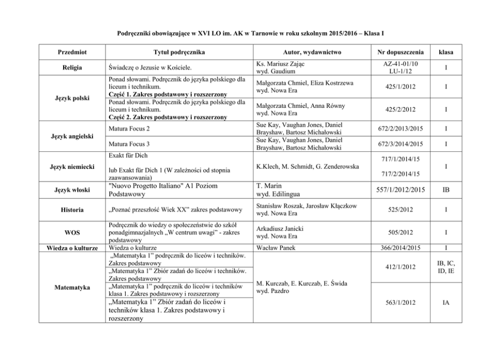 Podręczniki obowiązujące w XVI LO im. AK w Tarnowie w roku szkolnym 2015/2016 – Klasa I Tytuł podręcznika Przedmiot Religia Język polski Świadczę o Jezusie w Kościele. Ponad słowami. Podręcznik do języka polskiego dla liceum i technikum. Część 1. Zakres podstawowy i rozszerzony Ponad słowami. Podręcznik do języka polskiego dla liceum i technikum. Część 2. Zakres podstawowy i rozszerzony Matura Focus 2 Język angielski Matura Focus 3 Autor, wydawnictwo Nr dopuszczenia klasa AZ-41-01/10 LU-1/12 I Małgorzata Chmiel, Eliza Kostrzewa wyd. Nowa Era 425/1/2012 I Małgorzata Chmiel, Anna Równy wyd. Nowa Era 425/2/2012 I 672/2/2013/2015 I 672/3/2014/2015 I Ks. Mariusz Zając wyd. Gaudium Sue Kay, Vaughan Jones, Daniel Brayshaw, Bartosz Michałowski Sue Kay, Vaughan Jones, Daniel Brayshaw, Bartosz Michałowski Exakt für Dich Język niemiecki Język włoski Historia WOS Wiedza o kulturze Matematyka 717/1/2014/15 lub Exakt für Dich 1 (W zależności od stopnia zaawansowania) K.Klech, M. Schmidt, G. Zenderowska "Nuovo Progetto Italiano" A1 Poziom Podstawowy T. Marin wyd. Edilingua „Poznać przeszłość Wiek XX” zakres podstawowy Podręcznik do wiedzy o społeczeństwie do szkół ponadgimnazjalnych „W centrum uwagi” - zakres podstawowy Wiedza o kulturze „Matematyka 1” podręcznik do liceów i techników. Zakres podstawowy „Matematyka 1” Zbiór zadań do liceów i techników. Zakres podstawowy „Matematyka 1” podręcznik do liceów i techników klasa 1. Zakres podstawowy i rozszerzony „Matematyka 1” Zbiór zadań do liceów i techników klasa 1. Zakres podstawowy i rozszerzony I 717/2/2014/15 557/1/2012/2015 IB Stanisław Roszak, Jarosław Kłączkow wyd. Nowa Era 525/2012 I Arkadiusz Janicki wyd. Nowa Era 505/2012 I 366/2014/2015 I 412/1/2012 IB, IC, ID, IE 563/1/2012 IA Wacław Panek M. Kurczab, E. Kurczab, E. Świda wyd. Pazdro Fizyka "Świat Fizyki" - podręcznik dla szkół ponadgimnazjalnych - zakres podstawowy M. Fiałkowska wyd. ZamKor Chemia „To jest chemia” podręcznik dla szkół ponadgimnazjalnych, zakres podstawowy Biologia „Biologia na czasie” zakres podstawowy R. Hassa, A. Mrzgod, J. Mrzigod wyd. Nowa Era E. Bonar, W. Krzeszowiec-Jeleń S. Czachorowski wyd. Nowa Era R. Uliszak, K. Wiedermann Zbigniew Makiela, Tomasz Rachwał wyd. Nowa Era Grażyna Koba wyd. MIGRA M. Gomiewicz, A. Nowak-Kowal, Z. Smutek wyd. OPERON Geografia Podstawy przedsiębiorczości Informatyka Edukacja dla bezpieczeństwa Etyka Oblicza geografii zakres podstawowy Krok w przedsiębiorczość. Podręcznik dla szkół ponadgimnazjalnych. Informatyka dla szkół ponadgimnazjalnych – poziom podstawowy Seria odkrywamy świat na nowo Edukacja dla bezpieczeństwa Etyka. Podręcznik dla szkół ponadgimnazjalnych – zakres podstawowy P. Kołodziński, J. Kapiszewski 394/2011 I 438/2012 I 450/2012 I 433/2012 I 467/2012 I 536/2012 I 411/2012 I 408/2011 I