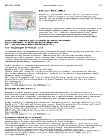 2017-03-02 11:44 www.artofbeauty.com.pl 1/2 SYLVECO DLA DZIECI Skóra dziecka jest wyjątkowo delikatna – jest kilka razy cieńsza od skóry dorosłego człowieka i nie posiada jeszcze całkowicie szczelnej bariery lipidowej. Typowym problemem jest występowanie odparzeń, które powstają na skutek przegrzania maluszka. U najmłodszych często dochodzi również do nadmiernego wysuszenia skóry, może wystąpić swędzenie, pojawiają się liszaje. Uciążliwą przypadłością, dotykającą dzieci coraz częściej, jest atopowe zapalenie skóry. Dlatego niemowlęta i dzieci wymagają szczególnie łagodnych kosmetyków, pozbawionych barwników, konserwantów, czy substancji zapachowych. KOSMETYKI SYLVECO DLA DZIECI TO WYBÓR NATURALNEJ PIELĘGNACJI I BEZPIECZEŃSTWO POTWIERDZONE POZYTYWNĄ OPINIĄ INSTYTUTU „POMNIK-CENTRUM ZDROWIA DZIECKA”. KREM PIELĘGNUJĄCY DO TWARZY I CIAŁA Uszczelnienie bariery hydro-lipidowej to najważniejsze zadanie kosmetyku pielęgnacyjnego dla najmłodszych. Ma to szczególne znaczenie w przypadku skóry atopowej, ze skłonnością do alergii. Wyjątkowo delikatny, łatwo się rozprowadza i wchłania, pozostawia skórę doskonale nawilżoną, miękką i zabezpieczoną przed utratą wilgoci. Wysoka zawartość oliwy z oliwek i oleju ze słodkich migdałów natłuszcza, wzmacnia barierę lipidową skóry i chroni przed podrażnieniami. Dodatek witaminy E i panthenolu przeciwdziała odparzeniom, działa łagodząco i regenerująco na skórę. Produkt hypoalergiczny, przebadany dermatologicznie. Bezzapachowy. Przeznaczony dla dzieci i niemowląt od pierwszego miesiąca życia. Sposób użycia: Produkt aplikować na czystą i suchą skórę. Składniki: woda, oliwa z oliwek, olej ze słodkich migdałów, naturalny emulgator z oleju kokosowego, stearynian glicerolu, kwas stearynowy, alkohol cetylostearylowy, panthenol, betulina, witamina E, guma ksantanowa, alkohol benzylowy, kwas dehydrooctowy. INCI: Aqua, Olea Europaea Fruit Oil, Prunus Amygdalus Dulcis Oil, Sorbitan Stearate, Sucrose Cocoate, Glyceryl Stearate, Stearic Acid, Cetearyl Alcohol, Panthenol, Betulin, Tocopheryl Acetate, Xanthan Gum, Benzyl Alcohol, Dehydroacetic Acid. Pojemność: 150 ml. CPNP: 1910240, BLOZ: 7057803, EAN: 5907502687409. ŁAGODZĄCA ZASYPKA DO CIAŁA Wybierając kosmetyki naturalne dbamy o bezpieczną pielęgnację skóry dziecka od pierwszych chwil życia. Hypoalergiczna zasypka do ciała skutecznie pielęgnuje delikatną skórę dziecka. Skrobia kukurydziana, główny składnik pudru, absorbuje wilgoć, tlenek cynku chroni przed otarciami, a olejek rumiankowy i alantoina łagodzą podrażnienia. Zasypkę można także zastosować do łagodzącej kąpieli u dzieci z objawami atopowego zapalenia skóry. Produkt hypoalergiczny, przebadany dermatologicznie. Przeznaczony dla dzieci i niemowląt od pierwszych dni życia. Sposób użycia: Produkt aplikować cienką warstwą na czystą i dokładnie osuszoną skórę. Stosować po każdej kąpieli i zmianie pieluszki. Kąpiel łagodząca: rozpuścić jedną łyżkę zasypki na wanienkę wody. Składniki: skrobia kukurydziana, tlenek cynku, alantoina, naturalny olejek eteryczny z rumianku. INCI: Zea Mays Starch, Zinc Oxide, Allantoin, Chamomilla Recutita Oil. Pojemność: 100 g. CPNP: 1887120, BLOZ: 7057799, EAN: 5907502687423. KREMOWY SZAMPON I PŁYN DO KĄPIELI Dla większości dzieci kontakt z wodą jest przyjemnością i miłym zakończeniem dnia. Warto wybierać delikatne preparaty myjące, aby kąpiel i mycie włosów były dla maluszka kojące i relaksujące. Hypoalergiczny, wyjątkowo delikatny, przeznaczony do codziennego mycia włosów oraz kąpieli niemowląt i dzieci. Zawiera bardzo łagodne, ale jednocześnie skuteczne środki myjące, które nie podrażniają nawet najbardziej wrażliwej skóry. Nie szczypie w oczy, pozostawia skórę i włosy miękkie w dotyku. Połączenie składników nawilżających i natłuszczających gwarantuje utrzymanie naturalnej bariery ochronnej i zapobiega utracie wody. Korzystanie z artykułów publikowanych w portalu artofbeauty.com.pl dla celów komercyjnych bądź dokonywanie ich opracowań wymaga zgody wydawcy - spółki Estetica Polska. W tym celu prosimy o kontakt z Ewą Cesarz, [email protected] 2017-03-02 11:44 www.artofbeauty.com.pl 2/2 Produkt hypoalergiczny, przebadany dermatologicznie. Zawiera naturalny olejek eteryczny z szałwii muszkatołowej. Przeznaczony dla dzieci i niemowląt od pierwszych dni życia. Sposób użycia: Jako szampon rozprowadzić na mokrych włosach i spienić. Dokładnie spłukać wodą. Jako płyn do kąpieli: nalać niewielką ilość płynu na myjkę lub gąbkę i rozmasować na skórze. Można także wlać nakrętkę płynu na wanienkę wody. Aby zapewnić dziecku komfort mycia zalecamy unikać kontaktu płynu z oczami. Składniki: woda, glukozyd laurylowy, betaina kokamidopropylowa, glukozyd kokosowy, gliceryna, panthenol, olej ze słodkich migdałów, guma guar, kwas mlekowy, benzoesan sodu, mocznik, naturalny olejek eteryczny z szałwii muszkatołowej. INCI: Aqua, Lauryl Glucoside, Cocamidopropyl Betaine, Coco-Glucoside, Glycerin, Panthenol, Prunus Amygdalus Dulcis Oil, Cyamopsis Tetragonoloba Gum, Lactic Acid, Sodium Benzoate, Urea, Salvia Sclarea Oil. Pojemność: 300 ml. CPNP: 1910263, BLOZ: 7057798, EAN: 5907502687430. OLIWKA DO CIAŁA Z BETULINĄ Walorem naturalnej i delikatnej pielęgnacji dziecka jest umacnianie wzajemnych więzi, w szczególności poprzez masaż, który najlepiej wykonywać wieczorem, po kąpieli, kiedy maluszek jest już zrelaksowany. Hypoalergiczna oliwka do ciała stanowi specjalnie skomponowaną mieszankę naturalnych olejów roślinnych i wosku, dzięki czemu zyskuje lekko żelową formułę, łatwą i przyjemną w aplikacji. Ekstrakt z kory brzozy (betulina) to składnik łagodzący, likwiduje objawy swędzenia i zaczerwienienia skóry. Oliwka skutecznie natłuszcza delikatną skórę dziecka, zapobiegając utracie wi