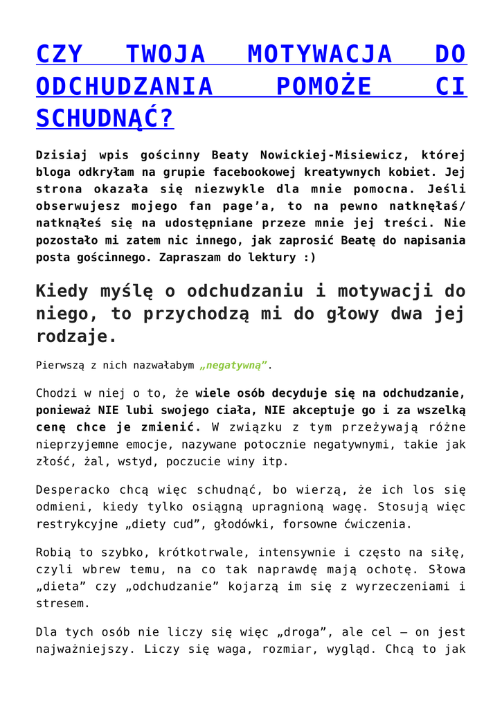 CZY TWOJA ODCHUDZANIA SCHUDNĄĆ? Dzisiaj wpis gościnny MOTYWACJA POMOŻE Beaty Nowickiej-Misiewicz, DO CI której bloga odkryłam na grupie facebookowej kreatywnych kobiet. Jej strona okazała się niezwykle dla mnie pomocna. Jeśli obserwujesz mojego fan page’a, to na pewno natknęłaś/ natknąłeś się na udostępniane przeze mnie jej treści. Nie pozostało mi zatem nic innego, jak zaprosić Beatę do napisania posta gościnnego. Zapraszam do lektury :) Kiedy myślę o odchudzaniu i motywacji do niego, to przychodzą mi do głowy dwa jej rodzaje. Pierwszą z nich nazwałabym „negatywną”. Chodzi w niej o to, że wiele osób decyduje się na odchudzanie, ponieważ NIE lubi swojego ciała, NIE akceptuje go i za wszelką cenę chce je zmienić. W związku z tym przeżywają różne nieprzyjemne emocje, nazywane potocznie negatywnymi, takie jak złość, żal, wstyd, poczucie winy itp. Desperacko chcą więc schudnąć, bo wierzą, że ich los się odmieni, kiedy tylko osiągną upragnioną wagę. Stosują więc restrykcyjne „diety cud”, głodówki, forsowne ćwiczenia. Robią to szybko, krótkotrwale, intensywnie i często na siłę, czyli wbrew temu, na co tak naprawdę mają ochotę. Słowa „dieta” czy „odchudzanie” kojarzą im się z wyrzeczeniami i stresem. Dla tych osób nie liczy się więc „droga”, ale cel – on jest najważniejszy. Liczy się waga, rozmiar, wygląd. Chcą to jak najszybciej osiągnąć, nie zważając często na koszty. Osiągnięcie celu przynosi poczucie szczęścia, choć często jest ono krótkotrwałe. Ponownie nabieranie kilogramów znów prowadzi do nieprzyjemnych emocji i złego myślenia o sobie. Takie zachowanie jest oznaką nie tylko braku akceptacji i szacunku dla własnego ciała, ale i w ogóle dla samego siebie, swoich uczuć i potrzeb. A z niechęci i nieakceptacji nie mogą powstać dobre efekty. Nawet jeśli te efekty są widoczne pod postacią utraconych kilogramów, to są krótkotrwałe i okupione dużym wysiłkiem. Wtedy prędzej czy później następuje powrót do starych przyzwyczajeń i do dawnej wagi. Bo bez wewnętrznej przemiany, nie ma trwałych efektów. Drugi rodzaj motywacji, nazywam „pozytywną”. I dla mnie sukces w odchudzaniu odnoszą właśnie te osoby, których motywacja wynika nie z niechęci, ale z miłości lub choćby sympatii do siebie i swojego ciała. Dla dobra siebie i swojego ciała zmieniają stopniowo Wybierają to, co im służy. i na trwałe nawyki. Nie koncentrują się tylko na wadze i wyglądzie, ale przede wszystkim na zmianie wewnętrznej i trwałej zmianie w nawykach. Zmiany motywowane szacunkiem i miłością do siebie przychodzą lżej, spokojniej, z radością. Nie trzeba się do nich zmuszać, nie są tak stresujące, a potrafią być wręcz ekscytujące i stanowić źródło przyjemności (oczywiście wymagają samodyscypliny i pewnego wysiłku na początku, ale nagrodą jest świadomość, że robi się dla siebie coś dobrego). Przyjemnością jest już droga, a nie tylko osiągnięty cel. Kiedy akceptujemy siebie i traktujemy. A kiedy lepiej odwdzięcza. swoje ciało, to lepiej je je traktujemy, to ono się Dlatego w przypadku wielu osób odchudzanie przyniesie trwały efekt dopiero wtedy, gdy pokonają psychologiczne bariery. Gdy się polubią i zaakceptują takimi, jacy są. Gdy pozwolą sobie na przeżywanie i wyrażanie uczuć, stawianie granic, podążanie za własnymi potrzebami i wartościami. Wtedy zmiana nawyków będzie przebiegała płynniej i z dużą szansą na sukces i trwały efekt. P.S. Tak naprawdę motywacja to za mało. Jest jak uczucie – przychodzi i odchodzi. Tak naprawdę ważne jest, aby zbudować wewnętrzną potrzebę do zmian (czyli to pozytywne nastawienie do siebie), a dzięki niej przetrwać kryzysy i „niechciejstwa”. Ważne jest też, aby jak najszybciej zacząć po prostu działać – robić mniejsze lub większe kroki, ale cały czas do przodu! Przyjemność z takiego działania nakręca motywację. A jak ona wygląda u Ciebie? Powodzenia. Beata Nowicka – Misiewicz – psycholog, coach, trener, a przede wszystkim osoba, która nieskutecznie walczyła ze swoimi kilogramami. Trwały sukces przyszedł dopiero, gdy odkryła, że jej problemem jest zajadanie emocji. Dziś dzieli się swoją wiedzą i doświadczeniami na blogu www.nowicka-misiewicz.com, w programie (kursie) online dla kobiet EMOCJI SIĘ NIE JE (www.emocjisienieje.pl) oraz w coachingowej grupie wsparcia na FB – Odchudzanie bez jojo ( www.facebook.com/groups/1571632826390785/ )
