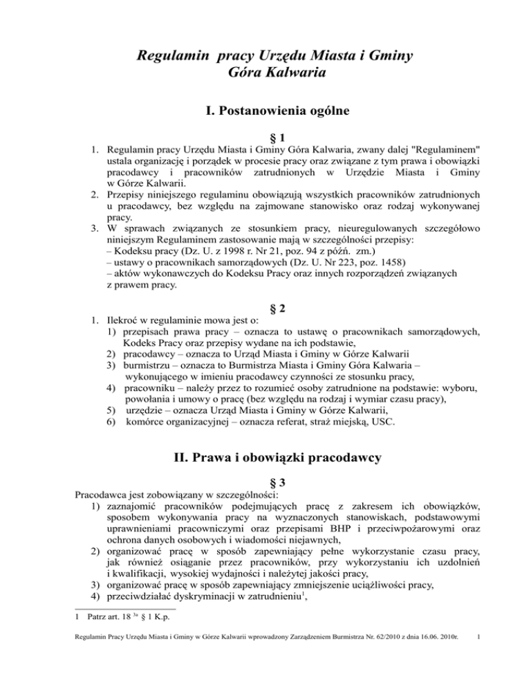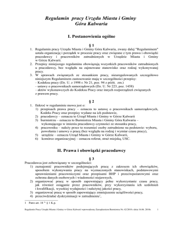 Regulamin pracy Urzędu Miasta i Gminy Góra Kalwaria I. Postanowienia ogólne §1 1. Regulamin pracy Urzędu Miasta i Gminy Góra Kalwaria, zwany dalej "Regulaminem" ustala organizację i porządek w procesie pracy oraz związane z tym prawa i obowiązki pracodawcy i pracowników zatrudnionych w Urzędzie Miasta i Gminy w Górze Kalwarii. 2. Przepisy niniejszego regulaminu obowiązują wszystkich pracowników zatrudnionych u pracodawcy, bez względu na zajmowane stanowisko oraz rodzaj wykonywanej pracy. 3. W sprawach związanych ze stosunkiem pracy, nieuregulowanych szczegółowo niniejszym Regulaminem zastosowanie mają w szczególności przepisy: – Kodeksu pracy (Dz. U. z 1998 r. Nr 21, poz. 94 z późń. zm.) – ustawy o pracownikach samorządowych (Dz. U. Nr 223, poz. 1458) – aktów wykonawczych do Kodeksu Pracy oraz innych rozporządzeń związanych z prawem pracy. §2 1. Ilekroć w regulaminie mowa jest o: 1) przepisach prawa pracy – oznacza to ustawę o pracownikach samorządowych, Kodeks Pracy oraz przepisy wydane na ich podstawie, 2) pracodawcy – oznacza to Urząd Miasta i Gminy w Górze Kalwarii 3) burmistrzu – oznacza to Burmistrza Miasta i Gminy Góra Kalwaria – wykonującego w imieniu pracodawcy czynności ze stosunku pracy, 4) pracowniku – należy przez to rozumieć osoby zatrudnione na podstawie: wyboru, powołania i umowy o pracę (bez względu na rodzaj i wymiar czasu pracy), 5) urzędzie – oznacza Urząd Miasta i Gminy w Górze Kalwarii, 6) komórce organizacyjnej – oznacza referat, straż miejską, USC. II. Prawa i obowiązki pracodawcy §3 Pracodawca jest zobowiązany w szczególności: 1) zaznajomić pracowników podejmujących pracę z zakresem ich obowiązków, sposobem wykonywania pracy na wyznaczonych stanowiskach, podstawowymi uprawnieniami pracowniczymi oraz przepisami BHP i przeciwpożarowymi oraz ochrona danych osobowych i wiadomości niejawnych, 2) organizować pracę w sposób zapewniający pełne wykorzystanie czasu pracy, jak również osiąganie przez pracowników, przy wykorzystaniu ich uzdolnień i kwalifikacji, wysokiej wydajności i należytej jakości pracy, 3) organizować pracę w sposób zapewniający zmniejszenie uciążliwości pracy, 4) przeciwdziałać dyskryminacji w zatrudnieniu1, 1 Patrz art. 18 3a § 1 K.p. Regulamin Pracy Urzędu Miasta i Gminy w Górze Kalwarii wprowadzony Zarządzeniem Burmistrza Nr. 62/2010 z dnia 16.06. 2010r. 1 5) zapewniać bezpieczne i higieniczne warunki pracy oraz prowadzić systematyczne szkolenia pracowników w zakresie bezpieczeństwa i higieny pracy, 6) terminowo i prawidłowo wypłacać wynagrodzenie, 7) ułatwiać pracownikom podnoszenie kwalifikacji zawodowych, 8) zaspokajać socjalne potrzeby pracowników w miarę posiadanych środków, 9) stosować obiektywne i sprawiedliwe kryteria oceny pracowników oraz wyników ich pracy, 10) prowadzić dokumentację w sprawach związanych ze stosunkiem pracy oraz akta osobowe pracowników, 11) przechowywać dokumentację w sprawach związanych ze stosunkiem pracy oraz akta osobowe pracowników w warunkach niegrożących uszkodzeniu lub ich zniszczeniu, 12) wpływać na kształtowanie w urzędzie zasad współżycia społecznego, 13) przeciwdziałać mobbingowi, 14) informować pracowników w ramach szkoleń z zakresu bhp o ryzyku związanym z wykonywaną przez nich pracą, 15) przestrzegać zasad równego traktowania w zatrudnieniu 2 III. Prawa i obowiązki pracownika §4 1. Na pracodawcy ciąży obowiązek niezwłocznego potwierdzenia pracownikom na piśmie rodzaju zawartej umowy o pracę i jej warunków. 2. Umowę należy wręczyć pracownikowi najpóźniej w dniu rozpoczęcia pracy. 3. Pracodawca zobowiązany jest poinformować każdego pracownika na piśmie, nie później niż 7 dni od dnia zawarcia umowy o pracę, o: a) częstotliwości wypłaty wynagrodzenia za pracę, b) systemie, rozkładzie i okresie rozliczeniowym czasu pracy, którymi objęty jest pracownik, c) wymiarze i prawie do urlopu wypoczynkowego, do którego uprawniony jest pracownik, d) długości okresu wypowiedzenia umowy o pracę. §5 Od momentu przyjęcia do pracy pracownik samorządowy zobowiązany jest wykonywać swoją pracę wydajnie i profesjonalnie. Obowiązkiem pracownika jest: 1) przestrzeganie prawa, 2) przestrzeganie ustalonego czasu pracy, 3) przestrzeganie Regulaminu pracy i ustalonego w urzędzie porządku, 4) dokładne, sumienne i terminowe wykonywanie poleceń przełożonego, 5) przestrzeganie przepisów bezpieczeństwa i higieny pracy oraz przepisów przeciwpożarowych, 6) przejawianie koleżeńskiego stosunku do współpracowników, podwładnych, 7) zachowanie się z godnością w miejscu pracy i poza nią, 8) zachowanie uprzejmości i życzliwości w kontaktach z interesantami, a także zapewnienie im kompetentnej i profesjonalnej obsługi, 9) wykonywanie pracy i poleceń przełożonych w sposób zgodny z prawem, optymalnie wykorzystując do tego dostępne środki pracy, wiedzę i doświadczenie zawodowe, 10) używanie zgodnie z przeznaczeniem przydzielonej mu odzieży i obuwia roboczego 2 Zasady równego traktowania określone są w rozdz. IIa K.p. Regulamin Pracy Urzędu Miasta i Gminy w Górze Kalwarii wprowadzony Zarządzeniem Burmistrza Nr. 62/2010 z dnia 16.06. 2010r. 2 oraz środków ochrony indywidualnej, wyłącznie w czasie wykonywania pracy określonej w umowie lub wynikającej z poleceń przełożonych, 11) dbanie o należyty stan środków pracy i innego mienia pracodawcy oraz ład i porządek w miejscu pracy, 12) używanie urządzeń biurowych oraz środków łączności, wyłącznie do wykonywania zadań służbowych, 13) zachowanie tajemnicy służbowej w zakresie przez prawo przewidzianym, 14) jeżeli prawo tego nie zabrania, informowanie organów, instytucji i osób fizycznych oraz udostępnianie dokumentów znajdujących się w posiadaniu Urzędu, 15) należyte zabezpieczenie po zakończeniu pracy: urządzeń (narzędzi) i pomieszczeń