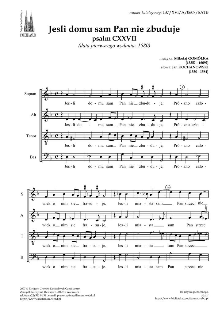numer katalogowy: 137/XVI/A/0607/SATB Jesli domu sam Pan nie zbuduje psalm CXXVII (data pierwszego wydania: 1580) muzyka: Mikołaj GOMÓŁKA (1535? - 1609?) słowa: Jan KOCHANOWSKI (1530 - 1584) Sopran &b c Œ œ ˙ Jes - li Alt do - mu sam ˙ œ œ œ œ œ œ œ œ œ ˙ Œ œ #˙ b˙ œ œ &b œ œ T nim sie nim sie fra-su - œ. ?b œ œ wiek o nim sie œ œ nim sie œ œ Œ nœ ˙ Œ œ ˙ ˙ ˙ œ Pan nie j œ ˙ fra - su - je. 2007 © Związek Chórów Kościelnych Caecilianum Zarząd Główny: ul. Dewajtis 3 , 01-815 Warszawa tel./fax: (22) 561 01 38 , e-mail: [email protected] http://www.caecilianum.webd.pl Pan nie Jes - li fra - su - je. œ Pan nie je. fra - su - je. Vb œ œœ œ œ œ œ œœ wiek o B do - mu sam # # œ œ œ œj œ œj ˙ & b œ œ œ œ bœ wiek o mu sam do - mu sam ?b c Œ œ ˙ wiek o A Pró - zno V b c Œ œ #˙ - Jes - li S zbu-du - je, ˙ œ œ œ œ œ œ bœ Jes - li Bas Pan nie 5 &b c Œ œ œ œ Jes - li do Tenor œ œ ˙ # # œ œ œ œj œ œj ˙ Œ œ Œ j œ. œ ˙ œ zbu - du - je, œ Œ œ zbu - du - je, 10 œ œ œ j ˙ b œ œ. œ mia - sta sam Jes - li mia - sta sam Pan strzec Œ œ ˙ Jes - li ˙ ˙ czło - czło - œ n œ bœ Pan strzec nie Jes - li Œ œ ˙ ˙ b˙ ˙ Pró - zno mia - sta sam ˙ œ ˙ œ Pró - zno ˙ œ. Aœ œ œ J czło - Pró - zno czło - zbu - du - je, œ ˙ Pan strzec œ. bœ œ œ œ œ œ bœ œ J œ œ mia - sta sam ˙ Pan œ œ strzec nie Do uŜytku publicznego. http://www.biblioteka.caecilianum.webd.pl psalm CXXVII - Mikołaj GOMÓŁKA S A &b œ œ œ œ bę - dzie, Pró bę - dzie, Pró V b œ œœ œ nie B œ b b b & œ œ œœ œ œ nie T œ œ ?b ˙ bę bę - dzie, Pró - œ œ dzie, Pró œ œ œ - œ zno czu - je œ œ œ zno czu - je œ œ œ œ œ œ œ œ - - zno czu - je zno czu - je b œ straŜ po blan - kach œ œ œ œœœ œ œ œ - œ straŜ po blan - kach œ œ œ straŜ po blan œ œ œ œ œ. wszę # œ œ straŜ po blan - kach kach - Un j œ ˙ U dzie. ˙ wszę - dzie. U ˙ wszę ˙ wszę - dzie. œœ œ œ œ - U - ˙ dzie. PSALM CXXVII Nisi Dominus aedificaverit domum 1. Jesli domu sam Pan nie zbuduje, PróŜno człowiek o nim się frasuje; Jeśli miasta sam Pan strzec nie będzie, PróŜno czuje straŜ po blankach wszędzie. 2. PróŜno z domu przede dniem wychodzisz, PróŜno mrokiem ostatnim przychodzisz. Nie zarobisz ani poŜywienia, Nie będzie li z nieba wspomoŜenia. 3. Ale komu Pan jest miłościwy, Daje mu sen oczom poŜądliwy, Daje dziatek wdzięczne w domu roje Toć jest, Panie, poŜegnanie Twoje. 4. Nie tak groźne, nie tak są straszliwe W ręku męskich strzały popędliwe, Jako kiedy przy ojcowskiej głowie Zastawią się cnotliwi synowie. 5. Szczęśliwy to między szczęśliwymi, Kto swój sajdak strzałami takimi Obwarował; gdy przed sądem stanie, I prawa mu, i serca dostanie. -2- http://www.biblioteka.caecilianum.webd.pl