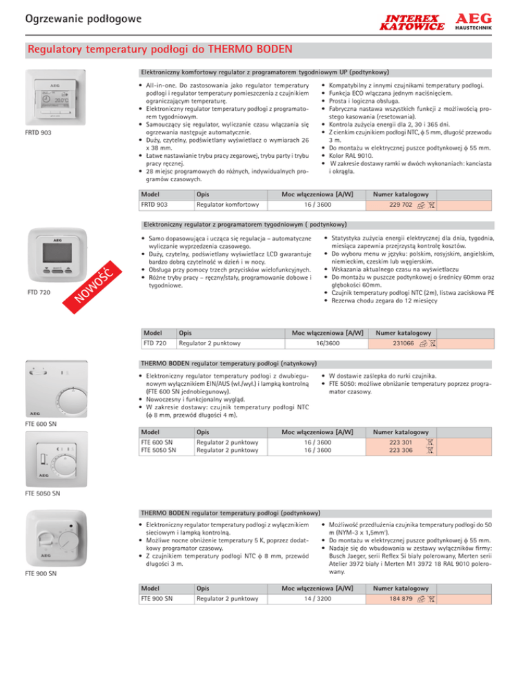 Ogrzewanie podłogowe Regulatory temperatury podłogi do THERMO BODEN Elektroniczny komfortowy regulator z programatorem tygodniowym UP (podtynkowy) • All-in-one. Do zastosowania jako regulator temperatury podłogi i regulator temperatury pomieszczenia z czujnikiem ograniczającym temperaturę. • Elektroniczny regulator temperatury podłogi z programatorem tygodniowym. • Samouczący się regulator, wyliczanie czasu włączania się ogrzewania następuje automatycznie. • Duży, czytelny, podświetlany wyświetlacz o wymiarach 26 x 38 mm. • Łatwe nastawianie trybu pracy zegarowej, trybu party i trybu pracy ręcznej. • 28 miejsc programowych do różnych, indywidualnych programów czasowych. FRTD 903 Model Opis FRTD 903 Regulator komfortowy • • • • • • • • • Kompatybilny z innymi czujnikami temperatury podłogi. Funkcja ECO włączana jednym naciśnięciem. Prosta i logiczna obsługa. Fabryczna nastawa wszystkich funkcji z możliwością prostego kasowania (resetowania). Kontrola zużycia energii dla 2, 30 i 365 dni. Z cienkim czujnikiem podłogi NTC, φ 5 mm, długość przewodu 3 m. Do montażu w elektrycznej puszce podtynkowej φ 55 mm. Kolor RAL 9010. W zakresie dostawy ramki w dwóch wykonaniach: kanciasta i okrągła. Moc włączeniowa [A/W] Numer katalogowy 16 / 3600 229 702 Elektroniczny regulator z programatorem tygodniowym ( podtynkowy) Ć OŚ Podłogowe Systemy Grzewcze FTD 720 W • Statystyka zużycia energii elektrycznej dla dnia, tygodnia, miesiąca zapewnia przejrzystą kontrolę kosztów. • Do wyboru menu w języku: polskim, rosyjskim, angielskim, niemieckim, czeskim lub węgierskim. • Wskazania aktualnego czasu na wyświetlaczu • Do montażu w puszcze podtynkowej o średnicy 60mm oraz głębokości 60mm. • Czujnik temperatury podłogi NTC (2m), listwa zaciskowa PE • Rezerwa chodu zegara do 12 miesięcy • Samo dopasowująca i ucząca się regulacja – automatyczne wyliczanie wyprzedzenia czasowego. • Duży, czytelny, podświetlany wyświetlacz LCD gwarantuje bardzo dobrą czytelność w dzień i w nocy. • Obsługa przy pomocy trzech przycisków wielofunkcyjnych. • Różne tryby pracy – ręczny/stały, programowanie dobowe i tygodniowe. NO Model Opis FTD 720 Regulator 2 punktowy Moc włączeniowa [A/W] Numer katalogowy 16/3600 231066 THERMO BODEN regulator temperatury podłogi (natynkowy) • Elektroniczny regulator temperatury podłogi z dwubiegunowym wyłącznikiem EIN/AUS (wł./wył.) i lampką kontrolną (FTE 600 SN jednobiegunowy). • Nowoczesny i funkcjonalny wygląd. • W zakresie dostawy: czujnik temperatury podłogi NTC (φ 8 mm, przewód długości 4 m). • W dostawie zaślepka do rurki czujnika. • FTE 5050: możliwe obniżanie temperatury poprzez programator czasowy. FTE 600 SN Model Opis FTE 600 SN FTE 5050 SN Regulator 2 punktowy Regulator 2 punktowy Moc włączeniowa [A/W] Numer katalogowy 16 / 3600 16 / 3600 223 301 223 306 FTE 5050 SN THERMO BODEN regulator temperatury podłogi (podtynkowy) • Elektroniczny regulator temperatury podłogi z wyłącznikiem sieciowym i lampką kontrolną. • Możliwe nocne obniżenie temperatury 5 K, poprzez dodatkowy programator czasowy. • Z czujnikiem temperatury podłogi NTC φ 8 mm, przewód długości 3 m. FTE 900 SN Model Opis FTE 900 SN Regulator 2 punktowy • Możliwość przedłużenia czujnika temperatury podłogi do 50 m (NYM-3 x 1,5mm²). • Do montażu w elektrycznej puszce podtynkowej φ 55 mm. • Nadaje się do wbudowania w zestawy wyłączników firmy: Busch Jaeger, serii Reflex Si biały polerowany, Merten serii Atelier 3972 biały i Merten M1 3972 18 RAL 9010 polerowany. Moc włączeniowa [A/W] Numer katalogowy 14 / 3200 184 879