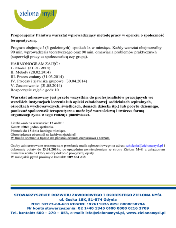 Proponujemy Państwu warsztat wprowadzający metodę pracy w oparciu o społeczność terapeutyczną. Program obejmuje 5 (3 godzinnych) spotkań 1x w miesiącu. Każdy warsztat obejmowałby 90 min. wprowadzenia teoretycznego oraz 90 min. omawiania problemów praktycznych (superwizji pracy ze społecznością czy grupą). HARMONOGRAM ZAJĘĆ : I . Model (31.01. 2014) II. Metody (28.02.2014) III. Proces zmiany (31.03.2014) IV. Procesy i zjawiska grupowe (30.04.2014) V. Zastosowanie (31.05.2014) Rozpoczęcie zajęć o godz.10. Warsztat adresowany jest przede wszystkim do profesjonalistów pracujących we wszelkich instytucjach leczenia lub opieki całodobowej (oddziałach szpitalnych, ośrodkach wychowawczych, świetlicach, domach dziecka itp.) lub pobytu dziennego, ponieważ społeczność terapeutyczna może być wartościową i twórczą formą organizacji życia w tego rodzaju placówkach. Liczba osób na warsztacie: 12 osób!! Koszt: 150zł jedno spotkania. Płatność do 15 dnia każdego miesiąca. Obowiązkowa obecność na każdym zjeździe!! W trakcie spotkania będzie dla państwa czekała ciepła kawa i herbata. Osoby zainteresowane proszone są o przesłanie maila zgłoszeniowego na adres: [email protected] i dokonanie opłaty do 23.01.2014r. po uprzednim potwierdzeniem ze strony Zielona Myśl z załączonym numerem konta na który należy dokonać powyższej opłaty. W razie jakiś pytań prosimy o kontakt: 509 664 238 OFERTA WARSZTATU „SPOŁECZNOŚĆ TERAPEUTYCZNA” „Gdy jakaś liczba osób spotyka się i współdziała rozwija się proces mirroringu czyli odzwierciedlania. Osoba widzi siebie i swoje części – często te niechciane i odrzucone odzwierciedlone w interakcjach innych członków grupy. Osiąga w ten sposób wiedzę o sobie.” /J. Pawlik „Psychoterapia analityczna”/ Wszyscy jesteśmy częścią większych grup społecznych, grupa jest symbolem pierwszych relacji człowieka z jego środowiskiem, dzięki temu jej członkowie mogą przepracowywać na jej łonie pierwotne zakłócenia rozwojowe. Szczególną formą pracy z grupą jest społeczność terapeutyczna. Społeczność terapeutyczna stanowi często kontekst działań stricte terapeutycznych, tj. psychoterapii indywidualnej czy grupowej. Jest też sama w sobie metodą dokonywania zmian. Podstawową cechą społeczności jest jej samopomocowy charakter - emocje i konflikty, z którymi nasi pacjenci czy wychowankowie słabo sobie radzą są doświadczane także przez innych członków społeczności, dzięki czemu jednostka otrzymuje podstawowe oparcie i odzwierciedlenie w grupie. Jej rolą jest konfrontowanie uczestników z realnością. Przeżywanie przez człowieka, tego co kto o nim powiedział, czy tego, co ktoś sobie może o nim myśleć, często ma się nijak do rzeczywistości. Społeczność uczy nazywać uczucia wobec innych, co pozwala na zmniejszenie lęków, frustracji, agresji wobec otoczenia czy innych osób. Społeczność terapeutyczna jest więc pośrednią formą prowokowania zmiany, jest szczególnie pomocna w pracy z młodzieżą dla której uczestnictwo w grupach stanowi rodzaj poligonu doświadczalnego przygotowującego do radzenia sobie w życiu dorosłym. W społeczności terapeutycznej istnieje możliwość obserwacji człowieka w wielu różnych wymiarach, widać jak pracuje, jak odnosi się do kolegów a jak do personelu, jak dba o porządek i higienę, jak funkcjonuje w grupie. Te codzienne zachowania i postawy są źródłem niewysychającego strumienia danych, którymi warto się zająć i które można modyfikować. Prowadzący : Dorota Orłowska-Drąg Uniwersytet Jagielloński, absolutorium z resocjalizacji, magister psychologii 1985 Praca w roli wychowawcy Zakładu Wychowawczego w Krakowie Ośrodek Leczenia Nerwic w Krakowie – prowadzenie psychoterapii grupowej, szkolenie w zakresie podstaw psychoterapii (podejście psychodynamiczne). Kurs Psychodramy Grupowej organizowany przez Moreno Institut fur Psychodrama Und Soziotherapie – certyfikat asystenta psychodramy Praca kliniczna na Oddziale Dziennym SP ZOZ „Srebrzysko” Terapeuta – Kierownik Zespołu SP ZOZ Ośrodek Terapii Uzależnień w Smażynie Członek i Superwizor Polskiego Towarzystwa Psychoterapii Psychoanalitycznej, uprawnienia do prowadzenia terapii szkoleniowej doświadczenie w pracy dydaktycznej i szkoleniowej : Prowadzenie warsztatów szkoleniowych z zakresu psychoterapii grupowej oraz podstaw psychoterapii we współpracy z Katedrą Psychiatrii i Psychoterapii AM w Krakowie. Prowadzenie warsztatów szkoleniowych w ramach Kursu Psychoterapii organizowanego przez Sekcję Psychoterapii Polskiego Towarzystwa Psychiatrycznego oraz WODKM. Przewodniczenie Filii Gdańskiej Sekcji Naukowej Psychoterapii Polskiego Towarzystwa Psychiatrycznego. Prowadzenie zajęć "Szkoły dla rodziców", treningów asertywności, zajęć w zakresie profilaktyki uzależnień, warsztatów dla rodzin osób uzależnionych w ramach etatu terapeuty OTU w Smażynie. Prowadzenie wykładów i ćwiczeń w ramach specjalistycznych szkoleń z terapii uzależnień organizowanych przez Krajowe Biuro d.s. Przeciwdziałania Narkomanii przy Gdańskiej Wyższej Szkole Humanistycznej. Prowadzenie superwizji grupowych i indywidualnych, zgodnie z uprawnieniami PTPP i KBPN. Kierowanie i konsultacja merytoryczna pracy zespołu terapeutycznego Ośrodka Terapii Uzależnień w Smażynie Praktyka prywatna - Gabinet Psychoterapii Psychoanalitycznej Gdańsk-Wrzeszcz [email protected] telefon kontaktowy : 508 054 882