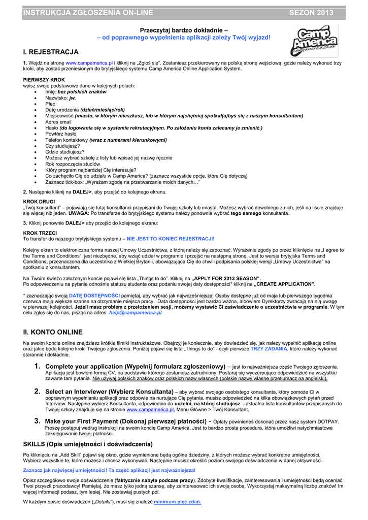 INSTRUKCJA ZGŁOSZENIA ON-LINE SEZON 2013 Przeczytaj bardzo dokładnie – – od poprawnego wypełnienia aplikacji zależy Twój wyjazd! I. REJESTRACJA 1. Wejdź na stronę www.campamerica.pl i kliknij na „Zgłoś się”. Zostaniesz przekierowany na polską stronę wejściową, gdzie należy wykonać trzy kroki, aby zostać przeniesionym do brytyjskiego systemu Camp America Online Application System. PIERWSZY KROK wpisz swoje podstawowe dane w kolejnych polach: Imię: bez polskich znaków Nazwisko: jw. Płeć Datę urodzenia (dzień/miesiąc/rok) Miejscowość (miasto, w którym mieszkasz, lub w którym najchętniej spotkał(a)byś się z naszym konsultantem) Adres email Hasło (do logowania się w systemie rekrutacyjnym. Po założeniu konta zalecamy je zmienić.) Powtórz hasło Telefon kontaktowy (wraz z numerami kierunkowymi) Czy studiujesz? Gdzie studiujesz? Możesz wybrać szkołę z listy lub wpisać jej nazwę ręcznie Rok rozpoczęcia studiów Który program najbardziej Cię interesuje? Co zachęciło Cię do udziału w Camp America? (zaznacz wszystkie opcje, które Cię dotyczą) Zaznacz tick-box: „Wyrażam zgodę na przetwarzanie moich danych…” 2. Następnie kliknij na DALEJ>, aby przejść do kolejnego ekranu. KROK DRUGI „Twój konsultant” – pojawiają się tutaj konsultanci przypisani do Twojej szkoły lub miasta. Możesz wybrać dowolnego z nich, jeśli na liście znajduje się więcej niż jeden. UWAGA: Po transferze do brytyjskiego systemu należy ponownie wybrać tego samego konsultanta. 3. Kliknij ponownie DALEJ> aby przejść do kolejnego ekranu: KROK TRZECI To transfer do naszego brytyjskiego systemu – NIE JEST TO KONIEC REJESTRACJI! Kolejny ekran to elektroniczna forma naszej Umowy Uczestnictwa, z którą należy się zapoznać. Wyrażenie zgody po przez kliknięcie na „I agree to the Terms and Conditions”, jest niezbędne, aby wziąć udział w programie i przejść na następną stronę. Jest to wersja brytyjska Terms and Conditions, przeznaczona dla uczestnika z Wielkiej Brytanii, obowiązująca Cię do chwili podpisania polskiej wersji „Umowy Uczestnictwa” na spotkaniu z konsultantem. Na Twoim świeżo założonym koncie pojawi się lista „Things to do”. Kliknij na „APPLY FOR 2013 SEASON”. Po odpowiedzeniu na pytanie odnośnie statusu studenta oraz podaniu swojej daty dostępności* kliknij na „CREATE APPLICATION”. * zaznaczając swoją DATĘ DOSTĘPNOŚCI pamiętaj, aby wybrać jak najwcześniejszą! Osoby dostępne już od maja lub pierwszego tygodnia czerwca mają większe szanse na otrzymanie miejsca pracy. Data dostępności jest bardzo ważna, albowiem Dyrektorzy zwracają na nią uwagę w pierwszej kolejności. Jeżeli masz problem z przełożeniem sesji, możemy wystawić Ci zaświadczenie o uczestnictwie w programie. W tym celu zgłoś się do nas, pisząc na adres [email protected] II. KONTO ONLINE Na swoim koncie online znajdziesz krótkie filmiki instruktażowe. Obejrzyj je koniecznie, aby dowiedzieć się, jak należy wypełnić aplikację online oraz jakie będą kolejne kroki Twojego zgłoszenia. Poniżej pojawi się lista „Things to do” - czyli pierwsze TRZY ZADANIA, które należy wykonać starannie i dokładnie. 1. Complete your application (Wypełnij formularz zgłoszeniowy) – jest to najważniejsza część Twojego zgłoszenia. Aplikacja jest bowiem formą CV, na podstawie którego zostaniesz zatrudniony. Postaraj się wyczerpująco odpowiedzieć na wszystkie zawarte tam pytania. Nie używaj polskich znaków oraz polskich nazw własnych (polskie nazwy własne przetłumacz na angielski). 2. Select an Interviewer (Wybierz Konsultanta) – aby wybrać swojego osobistego konsultanta, który pomoże Ci w poprawnym wypełnianiu aplikacji oraz odpowie na nurtujące Cię pytania, musisz odpowiedzieć na kilka obowiązkowych pytań przed Interview. Następnie wybierz Konsultanta, odpowiednio do uczelni, na której studiujesz – aktualna lista konsultantów przypisanych do Twojej szkoły znajduje się na stronie www.campamerica.pl, Menu Główne > Twój Konsultant. 3. Make your First Payment (Dokonaj pierwszej płatności) - Opłaty powinieneś dokonać przez nasz system DOTPAY. Proszę postępuj według instrukcji na swoim koncie Camp America. Jest to bardzo prosta procedura, która umożliwi natychmiastowe zaksięgowanie twojej płatności. SKILLS (Opis umiejętności i doświadczenia) Po kliknięciu na „Add Skill” pojawi się okno, gdzie wymienione będą ogólne dziedziny, z których możesz wybrać konkretne umiejętności. Wybierz wszystkie te, które możesz i chcesz wykonywać. Następnie musisz określić poziom swojego doświadczenia w danej aktywności. Zaznacz jak najwięcej umiejętności! Ta część aplikacji jest najważniejsza! Opisz szczegółowo swoje doświadczenie (faktycznie nabyte podczas pracy). Zdobyte kwalifikacje, zainteresowania i umiejętności będą oceniać Twoi przyszli pracodawcy! Pamiętaj, że masz tylko jedną szansę, aby zainteresować ich swoją osobą. Wykorzystaj maksymalną liczbę znaków! Im więcej informacji podasz, tym lepiej. Nie zostawiaj pustych pól. W każdym opisie doświadczeń („Details”), musi się znaleźć minimum pięć zdań. UPLOAD PHOTOS, VIDEO, REFERENCES & CERTIFICATES (Załącz zdjęcia, film, referencje i certyfikaty) zdjęcia: dobre zdjęcie może bardzo pomóc! Na swoim koncie załącz trzy zdjęcia: Jedno zdjęcie to zdjęcie portretowe (koniecznie uśmiechnięte - będzie ono promowało Twoją aplikację). Dwa kolejne zdjęcia powinny przedstawiać Ciebie w czasie pracy. Jeżeli nie masz możliwości „wklejenia” swoich zdjęć na stronie, wręcz je razem z resztą dokumentów swojemu Konsultantowi (prosimy, aby wręczane konsultantowi zdjęcia były podpisane na odwrocie). film: aplikant, który załączy film już na początku wypełniania swojej aplikacji, ma większe szanse na wyjazd! Dyrektor Campu może dzięki niemu zobac