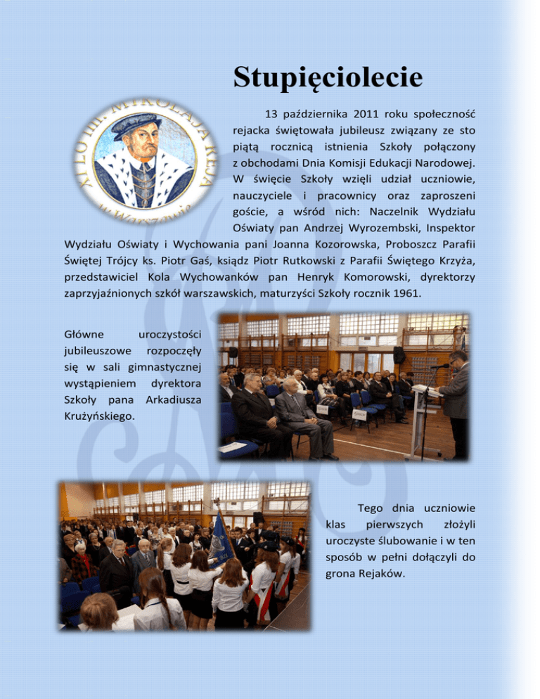 Stupięciolecie 13 października 2011 roku społeczność rejacka świętowała jubileusz związany ze sto piątą rocznicą istnienia Szkoły połączony z obchodami Dnia Komisji Edukacji Narodowej. W święcie Szkoły wzięli udział uczniowie, nauczyciele i pracownicy oraz zaproszeni goście, a wśród nich: Naczelnik Wydziału Oświaty pan Andrzej Wyrozembski, Inspektor Wydziału Oświaty i Wychowania pani Joanna Kozorowska, Proboszcz Parafii Świętej Trójcy ks. Piotr Gaś, ksiądz Piotr Rutkowski z Parafii Świętego Krzyża, przedstawiciel Kola Wychowanków pan Henryk Komorowski, dyrektorzy zaprzyjaźnionych szkół warszawskich, maturzyści Szkoły rocznik 1961. Główne uroczystości jubileuszowe rozpoczęły się w sali gimnastycznej wystąpieniem dyrektora Szkoły pana Arkadiusza Krużyńskiego. Tego dnia uczniowie klas pierwszych złożyli uroczyste ślubowanie i w ten sposób w pełni dołączyli do grona Rejaków. W trakcie uroczystości, zgodnie z tradycją Szkoły, zostały wręczone pamiątkowe dyplomy przyznawane z okazji 50-lecia matury, a następnie nauczycielom i pracownikom Szkoły wręczono nagrody związane z obchodami Dnia Komisji Edukacji Narodowej. Po części oficjalnej nastąpiła część artystyczna. Jako pierwszy wystąpił chór uczniów z klasy 3a i 3d w utworze inspirowanym jedną z pieśni Mikołaja Reja. Występ został przygotowany pod opieką pani Elżbiety Kurczab. Następnie młodzież z klas drugich i trzecich zaprezentowała sztukę autorstwa Piotra Gablera – ucznia klasy 3c, pt.: Prawdziwa geneza, który otrzymał pierwszą nagrodę w konkursie literackim zorganizowanym z okazji 105. rocznicy powstania Szkoły im. Mikołaja Reja i 505. rocznicy urodzin patrona. Opiekę artystyczną nad przedstawieniem sprawowały wspólnie pani Agnieszka Kraszewska i pani Katarzyna Sałkiewicz. Z okazji 105-lecia Szkoły przygotowane zostały także wystawy i gazetki okolicznościowe związane z historią i dniem dzisiejszym Szkoły. Powstała również publikacja Macte animo. Kronika 2006-2011. W stupięciolecie XI Liceum Ogólnokształcącego imienia Mikołaja Reja w Warszawie. Przedstawiono w niej zdarzenia, które kształtowały historię ostatniego pięciolecia Szkoły oraz zmiany, jakie w niej zaszły. Publikacja w formie wydruku została wystawiona na parterze budynku Szkoły. Jubileusz to nie tylko uroczystość danego dnia, lecz także cykl różnych przedsięwzięć zmierzających do utrwalenia tego ważnego momentu w historii naszej Szkoły. Z postacią patrona programowo związano wyjazd integracyjny klas pierwszych. Uczniowie zwiedzili dworek w Nagłowicach, wysłuchali wykładu poświęconego działalności artystycznej patrona oraz mieli okazję wziąć udział w międzyklasowym konkursie dotyczącym życia i twórczości Mikołaja Reja. Obchody rocznicy powstania Szkoły dały również możliwość zmierzenia się z historią młodym filmowcom. W efekcie ich pracy powstał dokument 105 – czyli historia XI LO im. Mikołaja Reja przedstawiający historię Szkoły od jej powstania w 1906 roku do czasów współczesnych. Autor obrazu starał się ukazać jej fenomen, który sprawił, że kolejne pokolenia nauczycieli i uczniów deklarują przynależność do wspólnoty Rejackiej niezależnie od opinii wygłaszanych na jej temat. Film autorstwa Eryka Skolarskiego, ucznia klasy 2e, będą mieli okazję obejrzeć wszyscy Rejacy. W najbliższym czasie na stronie internetowej szkoły dostępna będzie również nowa prezentacja multimedialna Z tradycją ku przyszłości. W czasie krótkiej wycieczki przez 105 lat historii Szkoły Mikołaja Reja prezentowanej na slajdach można zobaczyć osoby, które wywarły wielki wpływ na kształtowanie się jej wizerunku. Można na chwilę zajrzeć w rzeczywistość okupacyjną lat 1939-1945 i docenić trud powojennej odbudowy Szkoły, a także porównać dawny wygląd budynku z obecnym. 105 lat historii Naszej Szkoły to dopiero początek drogi.