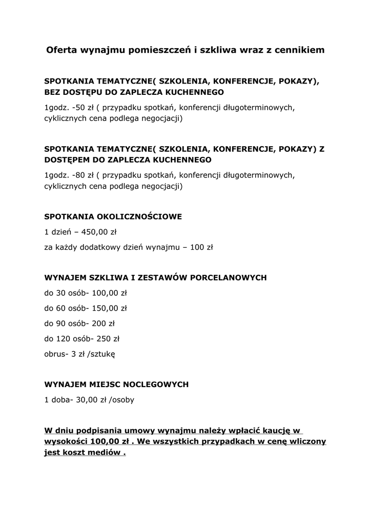 Oferta wynajmu pomieszczeń i szkliwa wraz z cennikiem SPOTKANIA TEMATYCZNE( SZKOLENIA, KONFERENCJE, POKAZY), BEZ DOSTĘPU DO ZAPLECZA KUCHENNEGO 1godz. -50 zł ( przypadku spotkań, konferencji długoterminowych, cyklicznych cena podlega negocjacji) SPOTKANIA TEMATYCZNE( SZKOLENIA, KONFERENCJE, POKAZY) Z DOSTĘPEM DO ZAPLECZA KUCHENNEGO 1godz. -80 zł ( przypadku spotkań, konferencji długoterminowych, cyklicznych cena podlega negocjacji) SPOTKANIA OKOLICZNOŚCIOWE 1 dzień – 450,00 zł za każdy dodatkowy dzień wynajmu – 100 zł WYNAJEM SZKLIWA I ZESTAWÓW PORCELANOWYCH do 30 osób- 100,00 zł do 60 osób- 150,00 zł do 90 osób- 200 zł do 120 osób- 250 zł obrus- 3 zł /sztukę WYNAJEM MIEJSC NOCLEGOWYCH 1 doba- 30,00 zł /osoby W dniu podpisania umowy wynajmu należy wpłacić kaucję w wysokości 100,00 zł . We wszystkich przypadkach w cenę wliczony jest koszt mediów .