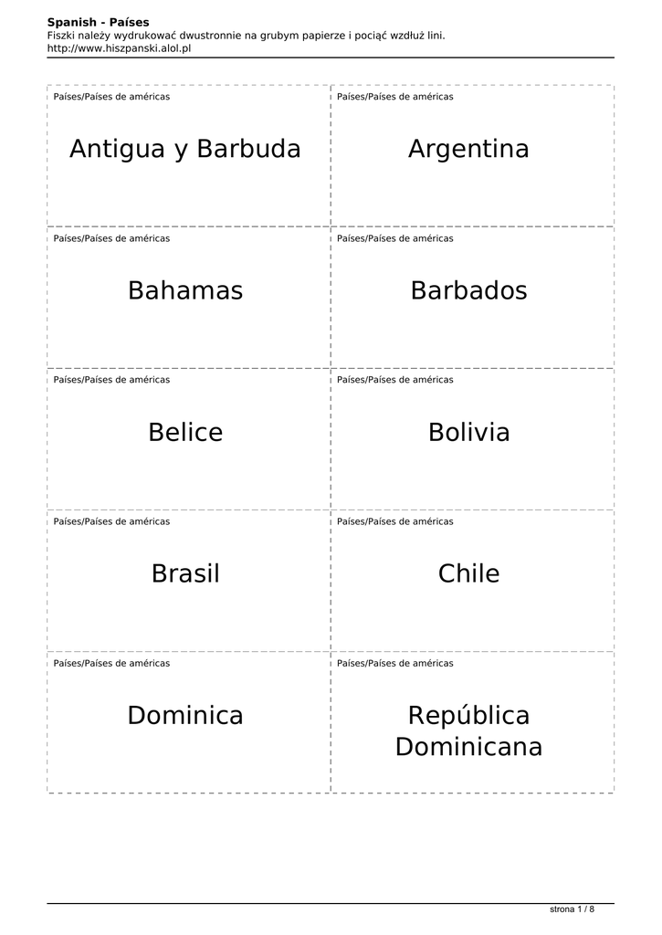Spanish - Países Fiszki należy wydrukować dwustronnie na grubym papierze i pociąć wzdłuż lini. http://www.hiszpanski.alol.pl Países/Países de américas Antigua y Barbuda Países/Países de américas Bahamas Países/Países de américas Belice Países/Países de américas Brasil Países/Países de américas Dominica Países/Países de américas Argentina Países/Países de américas Barbados Países/Países de américas Bolivia Países/Países de américas Chile Países/Países de américas República Dominicana strona 1 / 8 Spanish - Países Fiszki należy wydrukować dwustronnie na grubym papierze i pociąć wzdłuż lini. http://www.hiszpanski.alol.pl Países/Países de américas Argentyna Países/Países de américas Barbados Países/Países de américas Boliwia Países/Países de américas Chile Países/Países de américas Dominikana Países/Países de américas Antigua i Barbuda Países/Países de américas Bahamy Países/Países de américas Belize Países/Países de américas Brazylia Países/Países de américas Dominika strona 2 / 8 Spanish - Países Fiszki należy wydrukować dwustronnie na grubym papierze i pociąć wzdłuż lini. http://www.hiszpanski.alol.pl Países/Países de américas Ecuador Países/Países de américas Guayana Países/Países de américas Haití Países/Países de américas Jamaica Países/Países de américas Colombia Países/Países de américas Granada Países/Países de américas Guatemala Países/Países de américas Honduras Países/Países de américas Canadá Países/Países de américas Costa Rica strona 3 / 8 Spanish - Países Fiszki należy wydrukować dwustronnie na grubym papierze i pociąć wzdłuż lini. http://www.hiszpanski.alol.pl Países/Países de américas Grenada Países/Países de américas Gwatemala Países/Países de américas Honduras Países/Países de américas Kanada Países/Países de américas Kostaryka Países/Países de américas Ekwador Países/Países de américas Gujana Países/Países de américas Haiti Países/Países de américas Jamajka Países/Países de américas Kolumbia strona 4 / 8 Spanish - Países Fiszki należy wydrukować dwustronnie na grubym papierze i pociąć wzdłuż lini. http://www.hiszpanski.alol.pl Países/Países de américas Cuba Países/Países de américas Nicaragua Países/Países de américas Paraguay Países/Países de américas San Cristóbal y Nieves Países/Países de américas San Vicente y las Granadinas Países/Países de américas México Países/Países de américas Panamá Países/Países de américas Perú Países/Países de américas Santa Lucía Países/Países de américas Salvador strona 5 / 8 Spanish - Países Fiszki należy wydrukować dwustronnie na grubym papierze i pociąć wzdłuż lini. http://www.hiszpanski.alol.pl Países/Países de américas Meksyk Países/Países de américas Panama Países/Países de américas Peru Países/Países de américas Saint Lucia Países/Países de américas Salwador Países/Países de américas Kuba Países/Países de américas Nikaragua Países/Países de américas Paragwaj Países/Países de américas Saint Kitts i Nevis Países/Países de américas Saint Vincent i Grenadyny strona 6 / 8 Spanish - Países Fiszki należy wydrukować dwustronnie na grubym papierze i pociąć wzdłuż lini. http://www.hiszpanski.alol.pl Países/Países de américas Estados Unidos Países/Países de américas Trinidad y Tobago Países/Países de américas Surinam Países/Países de américas Uruguay Países/Países de américas Venezuela strona 7 / 8 Spanish - Países Fiszki należy wydrukować dwustronnie na grubym papierze i pociąć wzdłuż lini. http://www.hiszpanski.alol.pl Países/Países de américas Surinam Países/Países de américas Urugwaj Países/Países de américas Stany Zjednoczone Países/Países de américas Trynidad i Tobago Países/Países de américas Wenezuela strona 8 / 8 Powered by TCPDF (www.tcpdf.org)