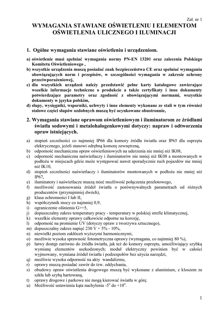 Zał. nr 1 WYMAGANIA STAWIANE OŚWIETLENIU I ELEMENTOM OŚWIETLENIA ULICZNEGO I ILUMINACJI 1. Ogólne wymagania stawiane oświetleniu i urządzeniom. a) oświetlenie musi spełniać wymagania normy PN-EN 13201 oraz zalecenia Polskiego Komitetu Oświetleniowego , b) wszystkie urządzenia muszą posiadać znak bezpieczeństwa CE oraz spełniać wymagania obowiązujących norm i przepisów, w szczególności wymagania w zakresie ochrony przeciwporażeniowej, c) dla wszystkich urządzeń należy przedstawić pełne karty katalogowe zawierające wszelkie informacje techniczne o produkcie a także certyfikaty i inne dokumenty potwierdzające parametry oraz zgodność z obowiązującymi normami, wszystkie dokumenty w języku polskim, d) słupy, wysięgniki, wsporniki, uchwyty i inne elementy wykonane ze stali w tym również stalowe części słupów ozdobnych muszą być ocynkowane obustronnie, 2. Wymagania stawiane oprawom oświetleniowym i iluminatorom ze źródłami światła sodowymi i metalohalogenkowymi dotyczy: napraw i odtworzenia opraw istniejących. a) b) c) d) e) f) g) h) i) j) k) l) m) n) o) p) q) r) s) t) u) stopień szczelności co najmniej IP66 dla komory źródła światła oraz IP65 dla osprzętu elektrycznego, jeżeli stanowi odrębną komorę zewnętrzną, odporność mechaniczna opraw oświetleniowych na uderzenia nie mniej niż IK08, odporność mechaniczna naświetlaczy i iluminatorów nie mniej niż IK08 a montowanych w podłożu w miejscach gdzie może występować nawet sporadycznie ruch pojazdów nie mniej niż IK10, stopień szczelności naświetlaczy i iluminatorów montowanych w podłożu nie mniej niż IP67, iluminatory i naświetlacze muszą mieć możliwość połączenia przelotowego, możliwość zastosowania źródeł światła o porównywalnych parametrach od różnych producentów (przynajmniej dwóch), klasa ochronności I lub II, współczynnik mocy co najmniej 0,9, ograniczenie olśnienia G>=5, dopuszczalny zakres temperatury pracy - temperatury w polskiej strefie klimatycznej, wszelkie elementy oprawy całkowicie odporne na korozję, odporność na promienie UV (dotyczy opraw z tworzywa sztucznego), dopuszczalny zakres napięć 230 V + 5% - 10%, niewielki poziom zakłóceń wyższymi harmonicznymi, możliwie wysoka sprawność fotometryczna oprawy (wymagana, co najmniej 80 %), łatwy dostęp zarówno do źródła światła, jak też do komory osprzętu, umożliwiający szybką wymianę elementów uszkodzonych; moduł elektryczny powinien być w całości wyjmowany, wymiana źródeł światła i podzespołów bez użycia narzędzi, możliwie wysoka odporność na akty wandalizmu, oprawy muszą posiadać zawór do tzw. oddychania, obudowy opraw oświetlenia drogowego muszą być wykonane z aluminium, z kloszem ze szkła lub szybą hartowaną, oprawy drogowe i parkowe nie mogą kierować światła w górę. Możliwość ustawienia kąta nachylenia -5o do +10o. 1 3. Wymagania stawiane sodowym źródłom światła. a) wysoka skuteczność świetlna (wyrażona w lm/W). Wartość minimalna wynosi 90 lm/W. b) możliwie mały spadek strumienia świetlnego w miarę starzenia się źródła światła; wymagany minimalny strumień świetlny pod koniec nominalnego czasu pracy wynosi 70 % strumienia początkowego, c) wymagany czas świecenia źródeł sodowych wysokoprężnych przy zachowaniu wyżej wymaganych parametrów – minimum 16.000 godzin, d) dopuszczalny zakres napięć 230 V, + 5% - 10%, e) dopuszczalny zakres temperatury pracy - temperatury w polskiej strefie klimatycznej. 4. Wymagania stawiane oprawom LED- dotyczy projektowanych lub remontowanych sieci oświetleniowych. a) napięcie znamionowe oprawy 230V+/- 5%, 50Hz, współczynnik mocy oprawy cos fi>=0,9, b) oprawa musi posiadać zabezpieczenia przed przepięciami o napięciu co najmniej 10kV, c) zakres temperatury pracy oprawy: od -40oC do +35oC, d) oprawa musi być wyposażona w diody LED o wydajności nie mniejszej niż 130lm/W, -trwałość źródeł LED nie mniej niż 100 000h, wartość strumienia świetlnego w tym okresie nie może być mniejsza niż 80% strumienia początkowego, - temperatura barwowa LED w zakresie 4000K-4500K(neutralny biały) różnice dopuszczalne +/- 1 % w wymaganym zakresie temperatury barwowej, - wymagany wskaźnik oddawania barw LED Ra>/=70, e) nominalny strumień świetlny, bryła fotometryczna , napięcie i natężenie prądu zasilania, moc nominalna oraz sprawność lm/W musi być potwierdzona poprzez dostarczenie raportu LM-79, LM-80, - raporty mają być wykonane przez akredytowane laboratorium, f) obudowa (korpus) oprawy wykonana z ciśnieniowego odlewu aluminiowego malowana proszkowo lub anodowana na żądany kolor z palety RAL, - oprawa powinna posiadać budowę dwukomorową z termicznym oddzieleniem komory osprzętu elektrycznego od komory optycznej, - oprawa musi poosiadać poziom szczelności nie mniejszy niż (IP 66) dla komory optycznej jak i komory osprzętu, - źródło światła musi być zabezpieczone szybą hartowaną o udarności min. IK 09; - oprawa wykonana w I lub II klasie ochronności; -konstrukcja oprawy musi umożliwiać łatwą modułową wymianę LED oraz bez narzędziową wymianę układów zasilających, -dla zwiększenia bezpieczeństwa obsługi, oprawy powinny być wyposażone w rozłącznik odcinający zasilanie w momencie otwarcia pokrywy osprzętu, -oprawa musi posiadać zintegrowany z obudową uchwyt umożliwiający jej pionowy lub poziomy montaż na wysięgniku lub bezpośrednio na słupie o średnicy wewnętrznej 6072mm, z możliwością regulacji pochylenia od 0o do min.10o, g) oprawy muszą posiadać zasilacz źródła światła wyposażony w funkcję utrzymania strumienia świetlnego w czasie; - zasilacz musi posiadać interfejs 0-10V lub Dali do płynnego sterowania natężeniem oświetlenia, - sprawność oprawy LED wraz z zasilaczem musi być większa niż 100 lm/W; 2 h) oprawy muszą być przystosowane do współpracy ze stero
