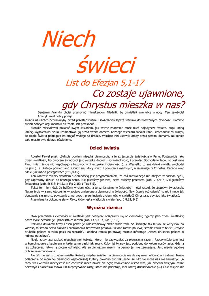 Niech światło świeci List do Efezjan 5,1-17 Co zostaje ujawnione, gdy Chrystus mieszka w nas? Benjamin Franklin chciał przekonać mieszkańców Filadelfii, by oświetlali swe ulice w nocy. Ten założyciel Ameryki miał dobry pomył: światła na ulicach ochraniałyby przed przestępstwami i stwarzałyby lepsze warunki do wieczornych czynności. Pomimo swych dobrych argumentów nie zdołał ich przekonać. Franklin zdecydował pokazać swym sąsiadom, jak ważne znaczenie może mieć pojedyncze światło. Kupił ładną lampę, wypolerował szkło i zamontował ją przed swoim domem. Każdego wieczoru zapalał knot. Przechodnie zauważyli, że ciepłe światło pomagało im omijać wyboje na drodze. Wkrótce inni ustawili lampy przed swoimi domami. Na koniec całe miasto było dobrze oświetlone. Dzieci światła Apostoł Paweł pisał: „Byliście bowiem niegdyś ciemnością, a teraz jesteście światłością w Panu. Postępujcie jako dzieci światłości, bo owocem światłości jest wszelka dobroć i sprawiedliwość, i prawda. Dochodźcie tego, co jest miłe Panu i nie miejcie nic wspólnego z bezowocnymi uczynkami ciemności (...). Wszystko to zaś dzięki światłu wychodzi na jaw (...). Dlatego powiedziano: Obudź się, który śpisz, I powstań z martwych, a zajaśnieje ci Chrystus. Baczcie więc pilnie, jak macie postępować” (Ef 5,8-15). Ten kontrast między światłem a ciemnością jest przypomnieniem, że coś radykalnego ma miejsce w naszym życiu, gdy zaprosimy Jezusa do naszego serca. Nie jesteśmy już tym, czym byliśmy przedtem (zob. 2 Kor 5,17); jesteśmy światłością (zob. Ef 5,8; Mt 5,14; Flp 2,15; 1 Tes 5,5). Tekst ten nie mówi, że byliśmy w ciemności, a teraz jesteśmy w światłości; mówi raczej, że jesteśmy światłością. Nasze życie — samo otoczenie — zostało zmienione z ciemności w światłość. Nawrócenie (ożywienie) to nic innego jak obudzenie się ze snu, powstanie z martwych, przeniesienie z ciemności w światłość Chrystusa, aby żyć jako światłość. Przemiana ta dokonuje się w Panu, który jest światłością świata (zob. J 8,12; 9,5). Wyraźna różnica Owa przemiana z ciemności w światłość jest potrójna: odłączamy się od ciemności; żyjemy jako dzieci światłości; nasze życie demaskuje i przekształca innych (zob. Ef 5,3-14; Mt 5,15-6). Reklama drukarek firmy Epson pokazuje całostronicowy obraz stada zebr. Są ściśnięte tak blisko, że wszystko, co widzisz, to strona pełna białych i czerwonawo-brązowych pasków. Zielona ramka po lewej stronie zawiera tekst: „Zwykłe drukarki pokażą ci tylko paski na zebrach”. Podobna ramka po prawej stronie informuje „Nasza drukarka pokaże ci kobietę na zebrze”. Nagle zaczynasz szukać nieuchwytnej kobiety, której nie zauważyłeś za pierwszym razem. Rzeczywiście tam jest w kombinezonie z kapturem w takie same paski jak zebry. Kolor jej twarzy jest podobny do koloru nosów zebr. Gdy ją raz zobaczysz, łatwo ją potem odnaleźć. Ale za pierwszym razem na pewno jej nie zauważysz. Jest niewiarygodnie dobrze zakamuflowana. Ale tak nie jest z dziećmi światła. Różnicy między światłem a ciemnością nie da się zakamuflować ani zatrzeć. Nasze odłączenie od moralnej ciemności współczesnej kultury powinno być tak jasne, że nikt nie może nas nie zauważyć: „A rozpusta i wszelka nieczystość lub chciwość niech nawet nie będą wymieniane wśród was, jak przystoi świętym, także bezwstyd i błazeńska mowa lub nieprzyzwoite żarty, które nie przystoją, lecz raczej dziękczynienie (...) i nie miejcie nic wspólnego z bezowocnymi uczynkami ciemności, ale je raczej karćcie, bo to nawet wstyd mówić, co się potajemnie wśród nich dzieje” (Ef 5,3-12). Nie jest to pełna lista, ale odzwierciedla nasz świat, który mnoży bezczelną wulgarność i brak szacunku dla czegokolwiek. Jest to świat coraz bardziej bezwstydny, otwarty i śmiały w swym „wszystko wolno”, „politycznie poprawnym”, amoralnym usposobieniu; świat, który nie wie, co to znaczy zaczerwienić się. Mamy postępować jak dzieci światłości (zob. Ef 5,8; por. 1 P 1,13-16), w świętym życiu pełnym „dobroci, sprawiedliwości i prawdy” (Ef 5,9). Naszym celem jest szukanie tego, co jest miłe Panu (zob. Ef 5,10). Tylko odradzająca moc Ducha Świętego jest w stanie to umożliwić (zob. Tt 3,3-5; 1 Kor 6,9-11). Święte światło promieniejące z naszego życia stawia nas twarzą w twarz ze światem i z praktycznymi decyzjami i problemami codziennego życia. Nasze życie objawia czystość, skromność, szacunek, przyzwoitość, które potwierdzają godność drugich i dają nam serca wyczulone na ich dobro. Nasze największe wyzwanie to mieć odwagę nie tylko samemu być innym, ale także wywierać przemieniający wpływ na tych, którzy nas otaczają. Światło nie tylko ujawnia to, co ciemność zakrywa. Wszystko, czego dotknie, może nabrać cech światła: „Wszystko, co zostanie oświetlone, wychodzi na jaw, a wszystko, co się ujawnia, staje się światłem” (Ef 5,13-14 NIV). Ci, którzy nas otaczają, mogą zostać zdemaskowani i przemienieni przez duchową jakość moralną naszego życia. Gdy światło demaskuje i zostaje przyjęte, przemienia tak, jak to było z Jezusem, nasze światło przebija ciemność i przezwycięża ją (zob. J 1,4-9; por. Iz 60,1-5). Im ciemniejsza ciemność, tym jaśniej świecimy jako światło dla Jezusa i Jego królestwa światłości. Wydawanie światła to nie same doktryny czy teologia, ale moralność — nasze życie przemienione przez umysł Jezusa. To sposób traktowania drugich, nasza postawa, czystość, uprzejmość, szacunek (zob. Mt 5,16; 1 J 2,6.9.10; por. 1 J 3,18). Uwielbienie Boga Pewna anegdota opowiada o świecach, które odmówiły wyjęcia ze schowka, by dać światło podczas burzy, gdy zawiodła elektryczność. Wszystkie miały wymówki, dlaczego nie mogły dać światła. Gd