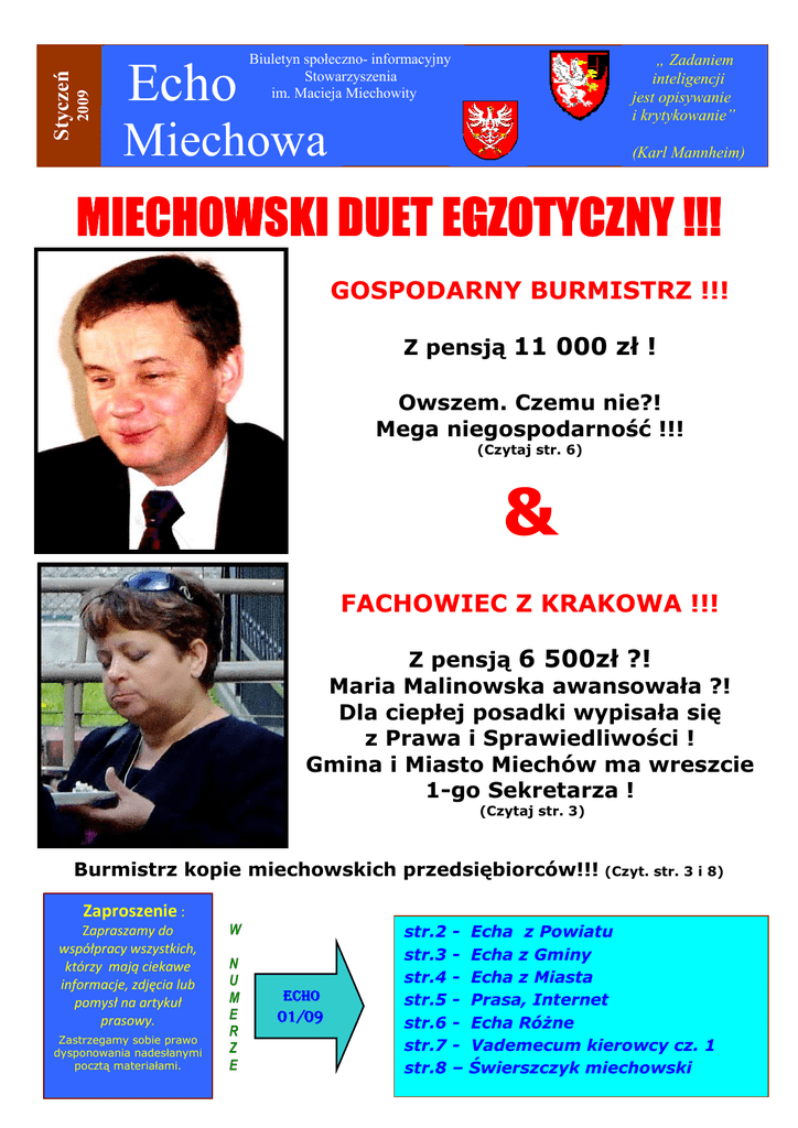 2009 Styczeń Echo Biuletyn społeczno- informacyjny Stowarzyszenia im. Macieja Miechowity „ Zadaniem inteligencji jest opisywanie i krytykowanie” Miechowa (Karl Mannheim) MIECHOWSKI DUET EGZOTYCZNY !!! GOSPODARNY BURMISTRZ !!! Z pensją 11 000 zł ! Owszem. Czemu nie?! Mega niegospodarność !!! (Czytaj str. 6) & FACHOWIEC Z KRAKOWA !!! Z pensją 6 500zł ?! Maria Malinowska awansowała ?! Dla ciepłej posadki wypisała się z Prawa i Sprawiedliwości ! Gmina i Miasto Miechów ma wreszcie 1-go Sekretarza ! (Czytaj str. 3) Burmistrz kopie miechowskich przedsiębiorców!!! (Czyt. str. 3 i 8) Zaproszenie : Zapraszamy do współpracy wszystkich, którzy mają ciekawe informacje, zdjęcia lub pomysł na artykuł prasowy. Zastrzegamy sobie prawo dysponowania nadesłanymi pocztą materiałami. . W N U M E R Z E ECHO 01/09 str.2 str.3 str.4 str.5 str.6 str.7 str.8 – Echa z Powiatu Echa z Gminy Echa z Miasta Prasa, Internet Echa RóŜne Vademecum kierowcy cz. 1 Świerszczyk miechowski ECHA Z POWIATU Ostatnia sesja Rady Powiatu w 2008r. XVIII sesja Rady Powiatu w Miechowie była ostatnią w kończącym się roku. Rozpoczęła się od Ŝyczeń wszelkiej pomyślności w Nowym 2009 Roku, które uczestnikom obrad złoŜył przewodniczący rady Stanisław Krawiec a ks. Michał Pakuła zaśpiewał, przy udziale zebranych, kilka popularnych kolęd. Następnie rozpoczęły się obrady. Pierwszą część posiedzenia zdominowały roczne sprawozdania: starosty z realizacji uchwał i działalności Zarządu Powiatu między sesjami, z prac Zarządu w 2008r. oraz przewodniczącego rady z działalności samorządu powiatowego. Odczytano równieŜ sprawozdania z prac komisji stałych rady. Następnie rozpatrzono projekt uchwały poświęcony budŜetowi powiatu na 2009 rok. Po rekomendacji projektu przez starostę Mieczysława Bertka, zreferowaniu zapisów projektu uchwały budŜetowej na przyszły rok i odczytaniu pozytywnej opinii RIO na jej temat przez skarbnik powiatu Teresę Florek, radni przyjęli budŜet. Na sesji podjęto 11 uchwał. Pierwsza Małopolanka urodzona w 2009 roku mieszka w Tczycy. Minutę po północy 1 stycznia 2009r. na świat przyszła Sylwia - pierwsze dziecko w powiecie miechowskim. Szczęśliwą matką noworodka waŜącego 3950 g. jest Marzena Wolna mieszkanka Tczycy w gminie Charsznica. Dziecko urodziło się bez problemów, siłami natury. To trzecia dziewczynka u małŜeństwa Wolnych. Poród w miechowskim Szpitalu św. Anny w Miechowie odebrała połoŜna Dorota Kordecka. Okazało się, Ŝe pierwsze dziecko w powiecie to równieŜ pierwszy noworodek w Małopolsce w nowym roku. Z tej okazji do matki i jej córeczki przyjechał Marek Nawara, Marszałek Województwa Małopolskiego, by osobiście pogratulować pani Marzenie i jej męŜowi oraz wręczyć okolicznościowe upominki. Obecni równieŜ byli dziennikarze telewizyjni i prasowi. W ciągu dwóch pierwszych dni 2009r.do momentu wizyty gości, w miechowskim szpitalu urodziło się juŜ 7 dzieci. Przy okazji marszałek został zapoznany z Odziałem G-P, który po modernizacji spełnia wszelkie unijne standardy. Powiat Miechowski ma 10 lat !. "Powiat jest kluczowym aktorem na scenie współdziałania w zarządzaniu publicznym" - to motto prof. Michała Kuleszy przyświecało uroczystej sesji Rady Powiatu w Miechowie, poświęconej X - leciu powiatu miechowskiego. Uroczystość otworzył i prowadził Stanisław Krawiec, przewodniczący Rady Powiatu. Po wprowadzeniu sztandaru powiatu, powitaniu radnych trzech kadencji oraz gości, uczczono chwilą ciszy pamięć zmarłego radnego Krzysztofa Zegarka. Historię powiatów w Polsce i statystykę prac radnych powiatu miechowskiego trzech kadencji przedstawił Ryszard Nasada, rzecznik prasowy. W ciągu 10 lat w sali konferencyjnej starostwa zasiadało 44 radnych, którzy w minionej dekadzie podjęli 649 uchwał. W kolejnym punkcie uroczystej sesji głos zabrali starostowie: pierwszy - Zygmunt Szopa i obecny Mieczysław Bertek. Starosta Szopa przypomniał trudne początki tworzenia administracji powiatowej ,,od podstaw". Starosta Bertek stwierdził, Ŝe czas przejrzeć komplet zadań, które ustawodawcy przypisali samorządowi terytorialnemu i zweryfikować je z rzeczywistością. W opinii obecnego starosty aktualnym problemem dla powiatów jest odczuwalny brak własnych zasobów finansowych, które są wymagane przy niemal wszystkich zadaniach inwestycyjnych. Później głos zabrali goście. Andrzej Sztorc, przewodniczący Sejmiku Województwa Małopolskiego pogratulował władzom powiatu mocnej pozycji jednostki w regionie i wskazał na wiodącą rolę ziemi miechowskiej w zakresie rolnictwa i produkcji Ŝywności. Na ręce starosty przekazał medal województwa za zasługi w krzewieniu idei samorządności w Małopolsce. Gratulacje przekazała Lidia Gądek, przewodnicząca Rady Powiatu w Olkuszu. Następnie przewodniczący rady Stanisław Krawiec i starosta Mieczysław Bertek wręczyli radnym trzech kadencji okolicznościowe imienne statuetki z okolicznościowym medalem i listy gratulacyjne. Radio Kraków w Miechowie. Bazylika Grobu BoŜego. Rozmowy i relacje reporterskie. Nie tylko o historii boŜogrobców i walkach o niepodległość. Wycieczka do rezerwatów przyrody i po szlakach turystycznych ziemi miechowskiej. Wizyta w Charsznicy, polskiej stolicy kapusty. Młodzi miechowscy muzycy i zagadka: dlaczego duch milczy z uporem? Radio Kraków w Miechowie. Słuchaj magazynu ,,Przed Hejnałem" w sobotę 31 stycznia od 900 do 1200. Na program zapraszają starosta i zarząd powiatu miechowskiego." Takiej treści zapowiedź od 23 stycznia była emitowana na falach Radia Kraków (101,6 MHz) aŜ do dnia programu. W trakcie trzygodzinnego programu, którego załoŜeniem była popularyzacja Miechowa, powiatu miechowskiego i jego atrakcji, słuchacze z Małopolski poznali przede wszystkim jego walory turystyczno-historyczne. Nie zabrakło równieŜ informacji o pracy i bieŜących działania