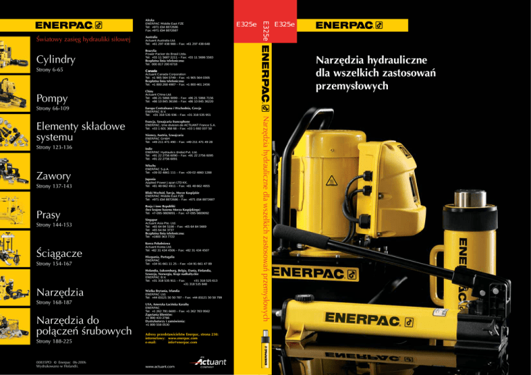 Światowy zasięg hydrauliki siłowej Cylindry Strony 6-65 Pompy Australia Actuant Australia Ltd. Tel: +61 297 438 988 – Fax: +61 297 438 648 Brazylia Power Packer do Brasil Ltda. Tel: +55 11 5687 2211 – Fax: +55 11 5686 5583 Bezpłatna linia telefoniczna: Tel: 000 817 200 6718 Chiny Actuant China Ltd. Tel: +86 21 5866 9099 – Fax: +86 21 5866 7156 Tel: +86 10 845 36166 – Fax: +86 10 845 36220 Elementy składowe systemu Francja, Szwajcaria francophone ENERPAC, Une division de ACTUANT France S.A. Tel: +33 1 601 368 68 – Fax: +33 1 692 037 50 Zawory Strony 137-143 Niemcy, Austria, Szwajcaria ENERPAC GmbH Tel: +49 211 471 490 – Fax: +49 211 471 49 28 Indie ENERPAC Hydraulics (India) Pvt. Ltd. Tel: +91 22 2756 6090 – Fax: +91 22 2756 6095 Tel: +91 22 2756 6091 Włochy ENERPAC S.p.A. Tel: +39 02 4861 111 – Fax: +39 02 4860 1288 Japonia Applied Power Japan LTD KK. Tel: +81 48 662 4911 – Fax: +81 48 662 4955 Bliski Wschód, Turcja, Morze Kaspijskie ENERPAC Middle East FZE Tel: +971 (0)4 8872686 – Fax: +971 (0)4 8872687 Prasy Strony 144-153 Ściągacze Strony 154-167 Rosja i inne Republiki (bez krajow basenu Morza Kaspijskiego) Tel: +7-095-9809091 – Fax: +7-095-9809092 Singapur Actuant Asia Pte. Ltd. Tel: +65 64 84 5108 – Fax: +65 64 84 5669 Tel: +65 64 84 3737 Bezpłatna linia telefoniczna: Tel: +1800 363 7722 Korea Południowa Actuant Korea Ltd. Tel: +82 31 434 4506 – Fax: +82 31 434 4507 Hiszpania, Portugalia ENERPAC Tel: +34 91 661 11 25 – Fax: +34 91 661 47 89 Holandia, Luksemburg, Belgia, Dania, Finlandia, Szwecja, Norwegia, Kraje nadbaltyckie ENERPAC B.V. Tel: +31 318 535 911 – Fax: +31 318 525 613 +31 318 535 848 Narzędzia Strony 168-187 Narzędzia do połączeń śrubowych Wielka Brytania, Irlandia ENERPAC Ltd. Tel: +44 (0)121 50 50 787 – Fax: +44 (0)121 50 50 799 USA, Ameryka Łacińska Karaiby ENERPAC Tel: +1 262 781 6600 – Fax: +1 262 783 9562 Zapytania klientów: +1 800 433 2766 Dystrybutorzy i zamówienia: +1 800 558 0530 Strony 188-225 Adresy przedstawicielstw Enerpac, strona 230: internetowy: www.enerpac.com e-mail: [email protected] 00835PO © Enerpac 06-2006 Wydrukowano w Holandii. www.actuant.com Narzędzia hydrauliczne dla wszelkich zastosowań przemysłowych Europa Centralnana i Wschodnia, Grecja ENERPAC B.V. Tel: +31 318 535 936 – Fax: +31 318 535 951 E325e Narzędzia hydrauliczne dla wszelkich zastosowań przemysłowych Canada Actuant Canada Corporation Tel: +1 905 564 5749 – Fax: +1 905 564 0305 Bezpłatna linia telefoniczna: Tel: +1 800 268 4987 – Fax: +1 800 461 2456 Strony 66-109 Strony 123-136 E325e E325e Afryka ENERPAC Middle East FZE Tel: +971 (0)4 8872686 Fax: +971 (0)4 8872687 Cylindry hydrauliczne Enerpac Hydraulic Technology Worldwide C ylindry hydrauliczne firmy Enerpac są dostępne w ponad 100 różnych odmianach. Niezależnie od rodzaju zastosowania przemysłowego podnoszenie, rozpieranie, ciągnięcie, wyginanie, mocowanie itp., niezależnie od wymagań dotyczących udźwigu, rozmiarów, wielkości skoku czy rodzaju jednostronnego lub dwustronnego działania, z tłokiem pełnym lub drążonym czy też w wersji rozporowej zawsze istnieje cylinder firmy Enerpac, który będzie się nadawał do danych warunków. Cylindry firmy Enerpac projektowane są w większości zgodnie z normą ASME B30.1 Utwardzone siodełko chroni tłok przed grzybkowatym zniekształceniem oraz przed zatarciem w górnym łożysku. Mocowanie zatrzaskowe. Z Uszczelnienie zgarniające tłoka zmniejsza ilość zanieczyszczeń poprawiając żywotność cylindra. Z1 B E H K X 18 3/8 " N PT F F System Golden Ring Wyjątkowy system Golden Ring posiada unikalny typ łożyska, które absorbuje naprężenia pochodzące od nieosiowych obciążeń, zabezpieczając cylinder przed ścieraniem, nadmiernym rozciągnięciem, rozerwaniem lub zatarciem tłoka oraz przed grzybkowatym zniekształceniem siodełka. Dzięki temu cylindry serii Golden Ring gwarantują długotrwałą i bezawaryjną eksploatację. K Chromowany tłok zapewnia odporność na zużycie i korozję. A N W B P F A Q Golden Ring absorbuje nieosiowe obciążenia bez obawy o zatarcie elementów cylindra. F1 Sprężyna powrotna zapewnia szybki powrót tłoka w cylindrach jednostronnego działania. Zestawy pomp i siłowników Aby ułatwić zamawianie, siłowniki dostępne są w zestawach (cylindry manometry, sprzęgła, wąż oraz pompa). Strona: 6 64 Przekrój obrazuje typową konstrukcję cylindra i może nie reprezentować wszystkich cylindrów w tym rozdziale J Golden Ring absorbuje nieosiowe obciąźenia bez obawy o zatarcie elementów cylindra. Cylindry Udźwig1) tony (kN) Zakres skoku 5 -95 16 - 362 (45-933) 20-150 50-250 (229-1589) 5-520 6-62 (45-5114) 2,5-50 16 - 362 (24-505) 13-145 8-258 (125-1429) 4-23 28-260 (35-222) 10-520 16 - 1219 (101-5108) 50-1000 50-300 (496-10260) 50-1000 50-300 (496-10260) 50-1000 50-300 (496-10265) 50-1000 Cylindry aluminiowe, jednostronnego działania, z nakrętką zabezpieczającą, z drążonym tłokiem, dwustronnego działania 54- 158 RAC RACL RACH RAR 8 13 Cylindry rozpierające, jednostronnego działania BRC BRP 26 Cylindry z drążonym tłokiem, jednostronnego i dwustronnego działania RCH RRH 28 30 BRD 32 RR 34 CLSG 38 CLS 42 CLRG 46 CLL 50 SLS BLS, SL SHS 54 58 JHA, JH EBJ 60 61 RC P, V 62 Cylindry precyzyjne, dwustronnego działania (wraz z elementami montażowymi) Cylindry dwustronnego działania o dużym skoku Cylindry jednostronnego działania o dużym udźwigu z ogranicznikiem wysuwu. Cylindry jednostronnego działania o dużym udźwigu o zredukowanej wysokości. Cylindry o dużym udźwigu, dwustronnego działania Systemy synchronicznego podnoszenia Systemy stopniowego podnoszenia Synchroniczne systemy linowe 76-508 RC 22 24 5000 max. (101-232) 1) Strona CLP RSM RCS Podnośniki aluminiowe i stalowe (13-1335) 10-25 Seria Cylindry płaskie i cylindry niskie, jednostronnego działania Cylindry o dużym udźwigu, jednostronnego działania z mechaniczną bl