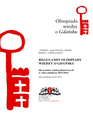 „Gdańsk – jego historia, zabytki, kultura i współczesność” REGULAMIN OLIMPIADY WIEDZY O GDAŃSKU dla uczniów szkół podstawowych w roku szkolnym 2015/2016 data modyfikacji marzec 2016 r. Ul. Długi Targ 28/29 80-830 Gdańsk tel.: 58 526 49 87 email: [email protected] Olimpiada wiedzy o Gdańsku powstała jako projekt obywatelski z inicjatywy środowisk naukowo-twórczych miasta, przy wsparciu gdańskich placówek naukowych, kulturalnych i oświatowych (m.in. Fundacji Gdańskiej, Wydziału Edukacji - Urzędu Miejskiego w Gdańsku, Uniwersytetu Gdańskiego, Ośrodka Kształcenia Ustawicznego Nauczycieli, Fundacji „Wspólnota Gdańska” oraz Pracowni Gdańskiej Instytutu Historii Polskiej Akademii Nauk). Postanowienia ogólne Organizatorem i koordynatorem Olimpiady wiedzy o Gdańsku [nazywanej dalej w skrócie Olimpiadą] jest Fundacja Gdańska z siedzibą w Gdańsku. Olimpiada odbywa się pod honorowym patronatem Prezydenta Miasta Gdańska. Nad przebiegiem i organizacją Olimpiady czuwa Rada Naukowa oraz Komitet Główny, których działalność oraz zakres kompetencji określone są odrębnym regulaminem. Nadzór merytoryczny nad Olimpiadą sprawuje Uniwersytet Gdański. Wszelką korespondencję dotyczącą Olimpiady należy kierować na adres Komitetu Głównego Olimpiady: Fundacja Gdańska Ul. Długi Targ 28/29 80-830 Gdańsk tel.: 58 526 49 87 email: [email protected] www.fundacjagdanska.pl W załączniku nr 2 do niniejszego regulaminu zostanie również podany szczegółowy zakres materiałów niezbędnych do przygotowania do zawodów. Prawo do udziału w Olimpiadzie przysługuje uczniom klas IV-VI szkół podstawowych z obszaru Gdańska oraz całego województwa pomorskiego. Uczestnictwo w Olimpiadzie jest dobrowolne. Cele Olimpiady Propagowanie wśród uczniów szkół podstawowych wiedzy o historii Gdańska, jego kulturze, zabytkach, współczesności, wybitnych postaciach Rozwijanie zainteresowań historią regionalną, budzenie przywiązania do małej ojczyzny oraz poszanowania dziedzictwa kulturowego. Przebieg Olimpiady Zawody Olimpiady są dwustopniowe: I stopień – internetowe eliminacje międzyszkolne 9 maja 2016 r. II stopień – finał w dniu Święta Gdańska, 29 maja 2016 r. I stopień – internetowe eliminacje międzyszkolne – 9 maja 2016 r. W każdej jednostce szkolnej zainteresowanej wzięciem udziału w Olimpiadzie dyrektorzy wyznaczą trzyosobową Szkolną Komisję Olimpiady. Uczniowie, którzy pragną wziąć udział w Olimpiadzie za pośrednictwem swoich nauczycieli bądź wychowawców zgłoszą Szkolnej Komisji Olimpiady akces do zawodów w terminie do dnia 12 kwietnia 2016 r. i zostaną poinformowani o wymaganiach stawianych uczestnikom na dwóch poziomach Olimpiady. Szkolna Komisja Olimpiady wytypuje jedną trzyosobową drużynę, która będzie reprezentować szkołę w eliminacjach międzyszkolnych. Szkolna Komisja Olimpiady podejmie wszelkie niezbędne kroki, aby taką drużynę wyłonić. Szkolna Komisja Olimpiady na załączonym formularzu (załącznik nr 1) do dnia 30 kwietnia 2016 r. prześle drogą elektroniczną do Fundacji Gdańskiej skład drużyny (ze wskazaniem osoby rezerwowej, w razie nagłego wypadku mogącej zastąpić osobę uprzednio wyznaczoną). Drużyny zostaną zarejestrowane na stronie internetowej Olimpiady. We wskazanym dniu, o oznaczonej osobnym komunikatem godzinie, w tzw. czasie rzeczywistym, drużyny wezmą udział w wielozadaniowym teście elektronicznym opublikowanym na stronie internetowej olimpiady. UWAGA ! Decyduje nie tylko poprawność, ale i szybkość odpowiedzi ! Wstępne wyniki eliminacji będą znane w trybie elektronicznym tego samego dnia, co zawody. Ostateczne wyniki zawodów zostaną przedstawione do wiadomości zainteresowanym najpóźniej w ciągu dziesięciu dni od przeprowadzenia eliminacji I stopnia. Pomiędzy dniem zawodów, a dniem ogłoszenia ostatecznych wyników Komitet Główny Olimpiady zastrzega sobie możliwość przeprowadzenia na odrębnych zasadach dogrywki, w przypadku, gdy zbyt duża liczba drużyn typowanych do finału osiągnie ten sam wynik. Do finału przejdą tylko trzy najlepsze drużyny spośród wszystkich uczestniczących w zawodach. II stopień – finał – 29 maja 2016 r. Finał olimpiady dla szkół podstawowych odbędzie się 29 maja 2016 r. w Święto Gdańska, razem z innymi finałami Olimpiady Wiedzy o Gdańsku. O miejscu i godzinie finału zainteresowani zostaną poinformowani odrębnym komunikatem. W finale drużyny rywalizują ze sobą, wykonując określone zadania związane z szeroko pojętym dziedzictwem kulturowym Gdańska. Podczas eliminacji finałowych dopuszcza się uczestnictwo publiczności, jak również możliwość transmitowania tych zawodów za pośrednictwem mediów. Nie przewiduje się pierwszego miejsca ex aequo, zatem zawody będą prowadzone aż do wyłonienia ostatecznego zwycięzcy olimpiady, a także miejsca drugiego i trzeciego. Nagrody Finaliści Olimpiady wiedzy o Gdańsku otrzymają pamiątkowe dyplomy, upominki i inne atrakcyjne nagrody rzeczowe. Ich szczegółowy wykaz zostanie opublikowany w komunikacie wyznaczającym godzinę i miejsce finału. Dokumentacja Komitet Główny Olimpiady ustala rodzaj dokumentacji poszczególnych etapów oraz sposób jej przeprowadzenia i przechowywania. Dokumentacja Szkolnych Komisji Olimpiady obejmuje: listę członków Komisji, ewentualny protokół z przeprowadzenia dodatkowych eliminacji, pisma przychodzące i wychodzące, listę zgłoszonych do udziału w Olimpiadzie uczniów, natomiast Komitet Główny oprócz kontroli nad gromadzeniem powyższych dokumentów prowadzi również listę zgłoszonych w olimpiadzie szkół. Wyniki i aktualne informacje dotyczące Olimpiady, jak i niniejszy regulamin, dostępne są w siedzibie Komitetu Głównego oraz na stronie internetowej Olimpiady w siedzibie głównego organizatora Olimpiady – Fundacji Gdańskiej. Ustalenia końcowe Uczestnicy Olimpiady w