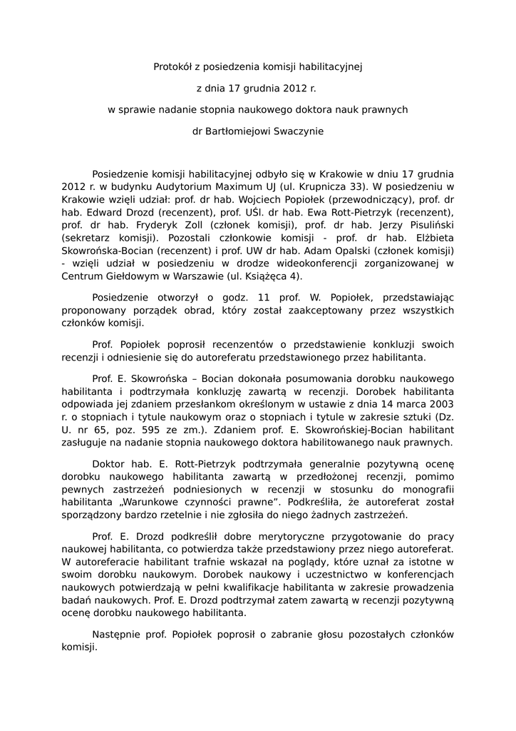 Protokół z posiedzenia komisji habilitacyjnej z dnia 17 grudnia 2012 r. w sprawie nadanie stopnia naukowego doktora nauk prawnych dr Bartłomiejowi Swaczynie Posiedzenie komisji habilitacyjnej odbyło się w Krakowie w dniu 17 grudnia 2012 r. w budynku Audytorium Maximum UJ (ul. Krupnicza 33). W posiedzeniu w Krakowie wzięli udział: prof. dr hab. Wojciech Popiołek (przewodniczący), prof. dr hab. Edward Drozd (recenzent), prof. UŚl. dr hab. Ewa Rott-Pietrzyk (recenzent), prof. dr hab. Fryderyk Zoll (członek komisji), prof. dr hab. Jerzy Pisuliński (sekretarz komisji). Pozostali członkowie komisji - prof. dr hab. Elżbieta Skowrońska-Bocian (recenzent) i prof. UW dr hab. Adam Opalski (członek komisji) - wzięli udział w posiedzeniu w drodze wideokonferencji zorganizowanej w Centrum Giełdowym w Warszawie (ul. Książęca 4). Posiedzenie otworzył o godz. 11 prof. W. Popiołek, przedstawiając proponowany porządek obrad, który został zaakceptowany przez wszystkich członków komisji. Prof. Popiołek poprosił recenzentów o przedstawienie konkluzji swoich recenzji i odniesienie się do autoreferatu przedstawionego przez habilitanta. Prof. E. Skowrońska – Bocian dokonała posumowania dorobku naukowego habilitanta i podtrzymała konkluzję zawartą w recenzji. Dorobek habilitanta odpowiada jej zdaniem przesłankom określonym w ustawie z dnia 14 marca 2003 r. o stopniach i tytule naukowym oraz o stopniach i tytule w zakresie sztuki (Dz. U. nr 65, poz. 595 ze zm.). Zdaniem prof. E. Skowrońskiej-Bocian habilitant zasługuje na nadanie stopnia naukowego doktora habilitowanego nauk prawnych. Doktor hab. E. Rott-Pietrzyk podtrzymała generalnie pozytywną ocenę dorobku naukowego habilitanta zawartą w przedłożonej recenzji, pomimo pewnych zastrzeżeń podniesionych w recenzji w stosunku do monografii habilitanta „Warunkowe czynności prawne”. Podkreśliła, że autoreferat został sporządzony bardzo rzetelnie i nie zgłosiła do niego żadnych zastrzeżeń. Prof. E. Drozd podkreślił dobre merytoryczne przygotowanie do pracy naukowej habilitanta, co potwierdza także przedstawiony przez niego autoreferat. W autoreferacie habilitant trafnie wskazał na poglądy, które uznał za istotne w swoim dorobku naukowym. Dorobek naukowy i uczestnictwo w konferencjach naukowych potwierdzają w pełni kwalifikacje habilitanta w zakresie prowadzenia badań naukowych. Prof. E. Drozd podtrzymał zatem zawartą w recenzji pozytywną ocenę dorobku naukowego habilitanta. Następnie prof. Popiołek poprosił o zabranie głosu pozostałych członków komisji. Prof. F. Zoll podkreślił w swoim wystąpieniu, że dorobek naukowy habilitanta nie jest może bardzo obszerny, lecz należy go uznać za wystarczający do przyznania stopnia naukowego doktora habilitowanego. Prof. F. Zoll zwrócił uwagę na niektóre publikacje habilitanta, jak np. artykuł dotyczący wielopodmiotowości w umowie sprzedaży, który ma ogólniejsze znaczenie. Chociaż więc główny obszar badań habilitanta koncentruje się na problematyce prawa rzeczowego, to jednak jego publikacje wykraczają poza tą tematykę. Doktor hab. A. Opalski stwierdził, że dwie monografie habilitanta: o warunku i o hipotece umownej stanowią solidne opracowania naukowe, przy czym monografia „Warunkowe czynności prawne” wypełnia istniejącą lukę w piśmiennictwie prawniczym. Podkreślił, że pozostały dorobek naukowy habilitanta nie jest bardzo obszerny, lecz świadczy o rzetelności naukowej habilitanta i jego dobrym warsztacie naukowym. Przyłącza się zatem do wniosków o przyznanie habilitantowi stopnia naukowego doktora habilitowanego. Prof. J. Pisuliński zwrócił uwagę, że zna dobrze dorobek naukowy habilitanta, jak też miał okazję wielokrotnie słuchać jego wystąpień na konferencjach naukowych, które ocenia bardzo wysoko. Wprawdzie zainteresowania naukowe habilitanta koncentrują się przede wszystkim na problematyce prawa rzeczowego, lecz w swoich publikacjach na ten temat wielokrotnie wykazywał się bardzo dobrą znajomością zagadnień ogólnych dotyczących czynności prawnych. Jego poglądy na temat niektórych kwestii, np. formy umowy zmieniającej umowę ustanawiającą prawo rzeczowe, odbiegają od obiegowych opinii, zawsze jednak są dobrze uzasadnione i oparte na rzetelnej analizie materiału normatywnego. Prof. J. Pisuliński podkreślił także, że w monografii o czynnościach warunkowych habilitant dokonał analizy wielu instytucji z innych działów prawa cywilnego, poza przepisami części ogólnej o warunku, potwierdzając bardzo dobrą znajomość piśmiennictwa i orzecznictwa oraz umiejętność krytycznej analizy trudnych problemów prawnych. Zwrócił także uwagę na doświadczenie dydaktyczne habilitanta, którego wykłady i ćwiczenia cieszą się wśród studentów bardzo dobrą opinią, co potwierdza duża frekwencja na prowadzonych przez niego zajęciach. Prof. W. Popiołek przyłączył się do wcześniejszych opinii członków komisji, podkreślając, że wprawdzie dorobek naukowy habilitanta nie jest bardzo obszerny, jednak nie jest on ograniczony tylko do obszaru prawa rzeczowego, lecz obejmuje także inne działy prawa cywilnego, o czym najlepiej świadczy monografia o warunkowych czynnościach prawnych. Monografia ta wskazuje na nowe obszary zainteresowań naukowych habilitanta, przy czym zawarte w niej wnioski dały podstawę do pewnej polemiki dla recenzentów, co dowodzi, że nie są to wnioski banalne. Jego zdaniem dorobek naukowy dr Swaczyny należy zatem uznać za wartościowy, co uzasadnia wniosek o przyznanie mu stopnia naukowego doktora habilitowanego. W toku dalszej dyskusji prof. F. Zoll i prof. W. Popiołek podkreślili bardzo krótkie terminy narzucone w art. 18a ustawy z dnia 14 marca 2003 r. o stopniach i tytule naukowym oraz o stopniach i tytule w zakresie sztuki, które utrudniają rzetelną ocenę kandydata. Do krytyki nowej procedury habilitacyjnej prz