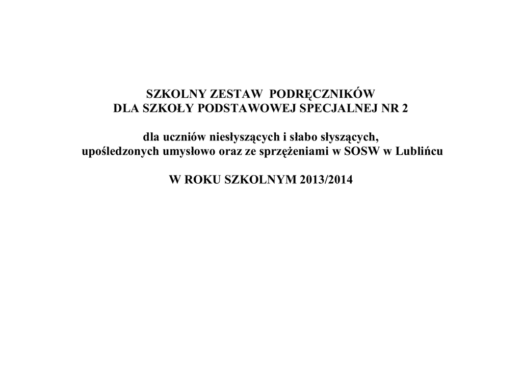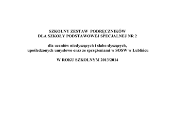 SZKOLNY ZESTAW PODRĘCZNIKÓW DLA SZKOŁY PODSTAWOWEJ SPECJALNEJ NR 2 dla uczniów niesłyszących i słabo słyszących, upośledzonych umysłowo oraz ze sprzężeniami w SOSW w Lublińcu W ROKU SZKOLNYM 2013/2014 KLASA I a SP dla niesłyszących i słabosłyszących 2013/2014 Przedmiot Nazwa podręcznika Autor Wydawnictwo Edukacja wczesnoszkolna Wesoła szkoła i przyjaciele klasa 1 box dla ucznia H. Dobrowolska i in. J. Hanisz WSiP New Sparks Plus 1 Podręcznik Zeszyt ćwiczeń M. Szpotowicz i in. Oxford Zajęcia komputerowe Język angielski KLASA II a SP dla niesłyszących i słabosłyszących 2013/2014 Przedmiot Nazwa podręcznika Autor Wydawnictwo Edukacja wczesnoszkolna "Wesoła szkoła i przyjaciele" klasa 2 box dla ucznia H. Dobrowolska i in. J. Hanisz WSiP New Sparks Plus 2 Podręcznik Zeszyt ćwiczeń P. Davies i in. Oxford Zajęcia komputerowe Język angielski KLASA III a SP dla niesłyszących i słabosłyszących 2013/2014 Przedmiot Nazwa podręcznika Autor Wydawnictwo Edukacja wczesnoszkolna Wesoła szkoła i przyjaciele klasa 3 box dla ucznia H. Dobrowolska i in. WSiP New Sparks Plus 3 Podręcznik Zeszyt ćwiczeń P. Davies i in. Oxford Zajęcia komputerowe Język angielski KLASA IV a SP dla niesłyszących i słabo słyszących 2013/2014 Przedmiot Nazwa podręcznika Autor Wydawnictwo Język polski Między nami Język polski 4. Podręcznik Zeszyt ćwiczeń cz. 1 i 2 Wehikuł czasu Historia i społeczeństwo 4 Podręcznik A. Łuczak, A. Murdzek GWO T. Małkowski GWO Język angielski Winners Plus 1 Podręcznik do szkoły podstawowej Zeszyt ćwiczeń C. Lawday, M. Hancock Oxford Muzyka Odkrywamy na nowo Podręcznik Ciekawi świata Plastyka Podręcznik Ciekawi świata Matematyka 4 Tajemnice przyrody Podręcznik dla klasy 4 szkoły podstawowej Odkrywamy na nowo Zajęcia techniczne dla szkoły podstawowej Część techniczna Część komunikacyjna Ciekawi świata Zajęcia komputerowe Podręcznik dla klas 4-6 szkoły M. Rykowska, Z. Szałko Operon A. Przybyszewska-Pietrasiak Operon B. Kiljańska, A. Konstantynowicz Operon M. Marko-Worłowska, F. Szlajfer, J. Stawarz Nowa Era U. Białka Operon J. Dulian Operon Historia i społeczeństwo Plastyka Matematyka Przyroda Technika Zajęcia komputerowe Religia podstawowej Drogi przymierza. Zaproszeni przez Boga Podręcznik do religii dla klasy IV ks. Z. Marek WAM KLASA V a SP dla niesłyszących i słabo słyszących 2013/2014 Przedmiot Nazwa podręcznika Autor Wydawnictwo Język polski M. Chmiel, W. Herman, Z. Pomirska, P. Doroszewski Nowa Era T. Małkowski GWO C. Lawday, M. Hancock Oxford M. Rykowska, Z. Szałko Operon A. Przybyszewska-Pietrasiak Operon B. Kiljańska, A. Konstantynowicz Operon M. Marko-Worłowska, F. Szlajfer, J. Stawarz Nowa Era U. Białka Operon J. Dulian Operon Historia i społeczeństwo Język angielski Muzyka Plastyka Matematyka Przyroda Technika Zajęcia komputerowe Słowa na start! 5 Podręcznik do kształcenia literackiego i kulturowego Podręcznik z ćwiczeniami do nauki o języku cz. 1,2 Wehikuł czasu Historia i społeczeństwo 5 Podręcznik Zeszyt ćwiczeń Winners Plus 2 Podręcznik do szkoły podstawowej Zeszyt ćwiczeń Odkrywamy na nowo Podręcznik Ciekawi świata Plastyka Podręcznik Ciekawi świata Matematyka 5 Tajemnice przyrody Podręcznik dla klasy 5 szkoły podstawowej Odkrywamy na nowo Zajęcia techniczne dla szkoły podstawowej Część techniczna Część komunikacyjna Ciekawi świata Zajęcia komputerowe Religia Podręcznik dla klas 4-6 szkoły podstawowej Drogi przymierza. Zaproszeni przez Boga Podręcznik do religii dla klasy V ks. Z. Marek WAM KLASA VI a SP dla niesłyszących i słabosłyszących 2013/2014 Przedmiot Nazwa podręcznika Autor Wydawnictwo Język polski Słowa na start! 6 Podręcznik do kształcenia literackiego i kulturowego Podręcznik z ćwiczeniami do nauki o języku cz. 1,2 Historia i społeczeństwo M. Chmiel, W. Herman, Z. Pomirska, P. Doroszewski Nowa Era R. Antosik Operon Winners Plus 3 Podręcznik Zeszyt ćwiczeń Matematyka 6 Zeszyt 1,2 C. Lawday, M. Hancock Oxford L. Kłosowski, M. Sznajder WSiP Przyroda Przyroda 6 cz. 1,2 Podręcznik dla szkoły specjalnej K. Kowalczyk, M. Kalbarczyk WSiP Muzyka Muzyka Szkoła podstawowa Podręcznik dla klas 4-6 Plastyka 4-6 Szkoła podstawowa Podręcznik M. Rykowska, Z. Szałko Operon M. Polkowska, L. Wyszkowska Operon Technika Szkoła podstawowa Część techniczna Część komunikacyjna Informatyka Szkoła podstawowa Podręcznik Drogi przymierza. U. Białka, J. Chrabąszcz Operon G. Hermanowski, W. Hermanowski Operon ks. Z. Marek WAM Historia i społeczeństwo Język angielski Matematyka Plastyka Technika Informatyka Religia Wychowanie do życia w rodzinie Przemienieni przez Boga Podręcznik do religii dla klasy VI Wędrując ku dorosłości Wychowanie do życia w rodzinie dla klas V-VI szkoły podstawowej pod red. T. Król