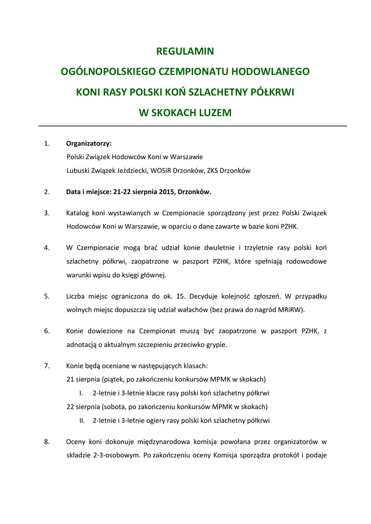 REGULAMIN OGÓLNOPOLSKIEGO CZEMPIONATU HODOWLANEGO KONI RASY POLSKI KOŃ SZLACHETNY PÓŁKRWI W SKOKACH LUZEM 1. Organizatorzy: Polski Związek Hodowców Koni w Warszawie Lubuski Związek Jeździecki, WOSiR Drzonków, ZKS Drzonków 2. Data i miejsce: 21-22 sierpnia 2015, Drzonków. 3. Katalog koni wystawianych w Czempionacie sporządzony jest przez Polski Związek Hodowców Koni w Warszawie, w oparciu o dane zawarte w bazie koni PZHK. 4. W Czempionacie mogą brać udział konie dwuletnie i trzyletnie rasy polski koń szlachetny półkrwi, zaopatrzone w paszport PZHK, które spełniają rodowodowe warunki wpisu do księgi głównej. 5. Liczba miejsc ograniczona do ok. 15. Decyduje kolejność zgłoszeń. W przypadku wolnych miejsc dopuszcza się udział wałachów (bez prawa do nagród MRiRW). 6. Konie dowiezione na Czempionat muszą być zaopatrzone w paszport PZHK, z adnotacją o aktualnym szczepieniu przeciwko grypie. 7. Konie będą oceniane w następujących klasach: 21 sierpnia (piątek, po zakończeniu konkursów MPMK w skokach) I. 2-letnie i 3-letnie klacze rasy polski koń szlachetny półkrwi 22 sierpnia (sobota, po zakończeniu konkursów MPMK w skokach) II. 8. 2-letnie i 3-letnie ogiery rasy polski koń szlachetny półkrwi Oceny koni dokonuje międzynarodowa komisja powołana przez organizatorów w składzie 2-3-osobowym. Po zakończeniu oceny Komisja sporządza protokół i podaje wyniki do publicznej wiadomości. Wyniki oceny są ostateczne, nie przewiduje się odwołań. 9. Ocena koni. I. Ocena prowadzona jest oddzielnie dla każdej klasy koni. II. Ocena koni w skokach luzem prowadzona jest zgodnie z załączonym schematem. III. Ocenie podlegają następujące elementy: 1. TYP I POKRÓJ Ocena Komisji (z dokładnością do 0,1 pkt.) maksymalnie 10 pkt. Komisja wystawia jedna notę, uwzględniając: • typ użytkowy • pokrój (budowa) 2. GALOP (ocena w ruchu luzem na hali) Ocena Komisji (z dokładnością do 0,1 pkt.) maksymalnie 10 pkt. Komisja wystawia jedną notę, uwzględniając: • długość kroku • impuls: siła, z jaką koń odpycha się od podłoża tylnymi nogami. • równowaga: kombinacja nachylenia kłody i podstawienie zadu, swoboda ruchu i sposobu pracy tylnych nóg. • elastyczność stawów 3. SKOKI LUZEM (oceniane w korytarzu zgodnie z zasadami na załączonym schemacie). Ocena Komisji (z dokładnością do 0,1 pkt.) maksymalnie 10 pkt. (mnożnik x2) Komisja wystawia jedną notę uwzględniając: • odbicie: kierunek: umiejętność pchnięcia kłębu w górę. szybkość: czas upływający podczas ostatniego foule przed skokiem - czas od dotknięcia wszystkich nóg do podłoża do chwili oderwania się konia od podłoża. • technika: przednie nogi: miara ustawienia łopatki w kombinacji z barkiem, przedramieniem, i nadpęciem. grzbiet: stopień w jakim szyja i grzbiet podążają w skoku po łuku, tzw. baskil. zad: stopień w jakim zad otwiera się podczas drugiej fazy skoku. • możliwości: umiejętność pchnięcia skoku w górę przy jednoczesnym osiągnięciu kierunku naprzód. • elastyczność: miara przebiegu całego skoku (łącznie z lądowaniem), koń powinien być elastyczny w kłodzie. • ostrożność: naturalna umiejętność konia do niepopełniania błędów w skoku, koń nie chce zrzucić drąga. IV. Wybór Czempionów Ogólnopolskich koni rasy polski koń szlachetny półkrwi Tytuły przyznawane są oddzielnie dla klaczy oraz ogierów, pod warunkiem, że w klasie zostanie ocenionych co najmniej 6 koni. Tytuł czempiona, a następnie wiceczempiona oraz trzecią i czwartą lokatę otrzymują klacze oraz ogiery, które zdobyły największą liczbę punktów przyznanych za ocenę elementów 1-3 tj. typ użytkowy i pokrój, galop, skoki luzem (mnożnik x 2). W przypadku równej liczby punktów o wyższym miejscu decydują w kolejności: ocena za skoki luzem, ocena za galop, wskazanie komisji. Dla czterech najlepszych ogierów oraz czterech najlepszych klaczy Ministerstwo Rolnictwa i Rozwoju Wsi oraz Polski Związek Hodowców Koni przyznają nagrody pieniężne, odpowiednio w wysokości: 1000 zł za zdobycie tytułu czempiona, 900 zł za zdobycie tytułu wiceczempiona, 800 zł za zdobycie trzeciej lokaty, 700 zł za zdobycie czwartej lokaty, do podziału po 50 % pomiędzy hodowcę i właściciela konia. 10. Organizatorzy Czempionatu nie zwracają kosztów dojazdu, ubezpieczenia koni oraz nie odpowiadają za skradzione mienie oraz ewentualne wypadki i szkody materialne powstałe w czasie transportu koni i w czasie trwania Czempionatu. 11. Zgłoszenia koni przyjmuje Polski Związek Hodowców Koni w Warszawie w nieprzekraczalnym terminie do 6 sierpnia 2015 r. Zgłoszenia prosimy kierować do Pani Alicji Kuśmierczak drogą mailową na adres: [email protected], nr tel. 503 123 654. 12. Potwierdzeniem uczestnictwa w Czempionacie jest wniesienie opłaty za boks w wysokości 300 zł (bez względu na czas pobytu: czwartek – niedziela). Wpłaty należy dokonać w terminie do 14 sierpnia 2015 r. na konto współorganizatora: Lubuski Związek Jeździecki Alior Bank oddział w Zielonej Górze Numer konta: 92 2490 0005 0000 4500 8839 4822 Brak wpłaty powoduje nieprzyjęcie konia do udziału w Czempionacie. SCHEMAT PRZEPROWADZANIA PRÓBY SKOKÓW LUZEM 6,0 m KOLEJNOŚĆ PRZBIEGÓW wskazówka 2,8–3,0 m koperta stacjonata max 1,4 m 2.WSKAZÓWKA + KOPERTA + STACJONATA (40–70 cm) + STACJONATA (70–90 cm) – max 2 przebiegi 3.WSKAZÓWKA + KOPERTA + STACJONATA (40–70 cm) + STACJONATA / OKSER / DOUBLEBARRE (max. 140 cm wysokości i 140 cm szerokości) – max 5 przebiegów 6,5–7,2 m 6,8–7,5 m 1. WSKAZÓWKA + KOPERTA + EWENTUALNIE DRĄGI (DESKI) W MIEJSCACH STACJONATY I OKSERA – max. 2 przebiegi Komisja Oceny uwzględniając warunki panujące w miejscu przeprowadzania próby oraz dyspozycję konia w trakcie próby decyduje o: • ilości przebiegów w ramach określonych w punktach 1–3 • ewentualnym dodaniu drągów (desek) w dysta