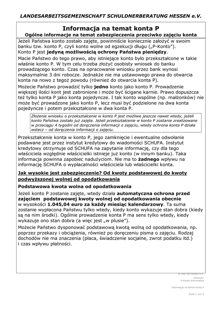 LANDESARBEITSGEMEINSCHAFT SCHULDNERBERATUNG HESSEN e.V. Informacja na temat konta P Ogólne informacje na temat zabezpieczenia przeciwko zajęciu konta Jeżeli Państwa konto zostało zajęte, powinniście koniecznie założyć w swoim banku tzw. konto P, czyli konto wolne od egzekucji długu („P-Konto”). Konto P jest jedyną możliwością ochrony Państwa pieniędzy. Macie Państwo do tego prawo, aby istniejące konto było przekształcone w takie właśnie konto P. W tym celu trzeba złożyć osobisty wniosek do banku prowadzącego konto. Czas na opracowanie wniosku przez bank wynosi maksymalnie 3 dni robocze. Jednakże nie ma ustawowego prawa do otwarcia konta na nowo z tegoż powodu (również do otwarcia konta P). Możecie Państwo prowadzić tylko jedno konto jako konto P. Prowadzenie większej ilości kont jest zabronione i może być ścigane karnie. Prawo dopuszcza też tylko konta P jako konta pojedyncze. I tak konto wspólne (np. małżonków) nie może być prowadzone jako konto P, lecz musi być podzielone na dwa konta pojedyncze i potem przekształcone w dwa konta P. Złożenie wniosku o przekształcenie w konto P jest możliwe jeszcze nawet wtedy, jeżeli konto Państwa zostało już zajęte. Jeżeli przekształcenie w konto P zostanie zrealizowane w przeciągu 4 tygodni od doręczenia informacji o zajęciu, wtedy ochrona konta P działa wstecz – od doręczenia informacji o zajęciu. Przekształcenie konta w konto P, jego zamknięcie i ewentualne odwołanie podawane jest przez instytut kredytowy do wiadomości SCHUFA. Instytut kredytowy otrzymuje od SCHUFA na zapytanie informację, czy dla tego właściciela względnie właścicielki istnieje już konto (w innym banku). Taka informacja powinna zapobiec nadużyciom. Nie ma to żadnego wpływu na informację SCHUFA o wypłacalności właściciela lub właścicielki konta. Jak wysokie jest zabezpieczenie? Od kwoty podstawowej do kwoty podwyższonej wolnej od opodatkowania Podstawowa kwota wolna od opodatkowania Jeżeli konto P zostanie zajęte, wtedy działa automatyczna ochrona przed zajęciem podstawowej kwoty wolnej od opodatkowania obecnie w wysokości 1.045,04 euro za każdy miesiąc kalendarzowy. Ta suma zostanie wypłacona Państwu tylko wtedy, kiedy konto wykazuje stan dobra (kiedy są na nim środki). Ogólnie prowadzenie konta P ma sens tylko wtedy, kiedy wykazuje ono stan dobra (a więc jest „w plusie”). Możecie Państwo dysponować podstawową kwotą wolną od opodatkowania, np. poprzez przekazy i obciążenia, również po doręczeniu pisma o zajęciu. Rodzaj dochodów nie ma znaczenia (płaca, świadczenie socjalne, zwrot podatku itd.) i czas wpływu płatności. © LAG-SB Hessen e.V. Polnisch: P-Konto-Information Informacja na temat konta P Seite 1 von 3 LANDESARBEITSGEMEINSCHAFT SCHULDNERBERATUNG HESSEN e.V. Obowiązek wypłaty w wypadku świadczenia socjalnego przy saldzie ujemnym Jeżeli nawet konto jest „na minusie“, możecie Państwo dysponować zasiłkiem na dzieci i świadczeniem socjalnym w pełnej wysokości, każdorazowo w ciągu 14 dni od wpływu tych świadczeń (ochrona rozliczeniowa). Jednakże przy koncie P bank może zawsze potrącać opłatę za prowadzenie konta. Uwaga: w wypadku innych wpływów (w szczególności płac) nie istnieje ochrona rozliczeniowa w wypadku ujemnego stanu konta! Na podstawie zaświadczenia: podwyższona kwota wolna od opodatkowania Automatycznie udzielona kwota wolna od opodatkowania może być podwyższona na podstawie zaświadczenia. Jeżeli wypłacąją Państwo jednej lub więcej niż jednej osobie alimenty ze względu na zobowiązania prawne lub przyjmujecie Państwo świadczenie socjalne w imieniu osób trzecich (np. dla partnerki życiowej, przybranego syna/córki), stosuje się odpowiednio wyższe kwoty wolne od opodatkowania: 1.438,34 1.657,46 1.876,58 2.095,70 2.314,82 euro euro euro euro euro w w w w w wypadku wypadku wypadku wypadku wypadku obowiązku alimentacyjnego podwójnego obowiązku alimentacyjnego potrójnego obowiązku alimentacyjnego poczwórnego obowiązku alimentacyjnego pięciokrotnego obowiązku alimentacyjnego i więcej Wolny od zajęć jest dodatkowo zasiłek na dzieci spływający na zajęte konto P i ewentualne jednorazowe świadczenia socjalne (np. koszty wycieczki klasowej, zwroty) – ale tylko w przewidzianym miesiącu. Gdzie można dostać zaświadczenie? Miejsca w regionie, gdzie można to załatwić Zaświadczenie o podwyższonej kwocie wolnej od opodatkowania mogą wystawiać adwokaci, podmioty odpowiedzialne za świadczenia socjalne/kasy rodzinne, pracodawcy i biura doradztwa na rzecz dłużników posiadające zezwolenie na działalność jako biuro upadłościowe. Wskazówka: Dużej liczbie instytutów kredytowych wystarczy, jeżeli jako zaświadczenie przedłożą Państwo decyzję o przyznaniu świadczeń socjalnych wykazując tymże fakt dla ilu członków gospodarstwa domowego pobierane są przez Państwa świadczenia. Rozliczenie płacy powinno być zaakceptowane jako zaświadczenie, jeżeli Państwa płaca zostanie zajęta. Dodatkowe pobieranie zasiłku na dzieci powinno być udowodnione na podstawie wyciągu z konta. Uwaga: Wiele instytucji doradztwa na rzecz dłużników nie wystawia zaświadczeń z powodu przeciążenia pracą względnie z powodu braku ich finansowania. Należy dlatego dowiedzieć się najpierw telefonicznie, czy odpowiednie dla Państwa biuro te zaświadczenia wystawia. Jeżeli nie, zostaną Państwo wtedy poinformowani, do kogo możecie się zwrócić. © LAG-SB Hessen e.V. Polnisch: P-Konto-Information Informacja na temat konta P Seite 2 von 3 LANDESARBEITSGEMEINSCHAFT SCHULDNERBERATUNG HESSEN e.V. Jeżeli instytut kredytowy nie zaakceptuje dokumentów przez Państwa przedłożonych lub nie znajdziecie Państwo u siebie na miejsu żadnego biura wystawiającego zaświadczenia, wtedy odpowiednią dla Państwa instytucją jest sąd egzekucyjny sądu rejonowego lub - jeżeli zajmującym j