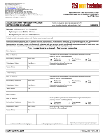 MIĘDZYNARODOWE TARGI POZNAŃSKIE sp. z o. o. POZNAŃ INTERNATIONAL FAIR Ltd. ul. Głogowska 14, 60-734 Poznań, Poland tel. +48/61/ 869 2599, fax. +48/61/ 869 2966 e-mail: [email protected] ; www.komtechnika.pl Konto / Bank account: Powszechna Kasa Oszczędności Bank Polski SA Nr konta: 38 1020 4027 0000 1102 0424 2962 IBAN: PL 46 1020 4027 0000 1402 1092 9075, SWIFT: BPKOPLPW Podatnik VAT czynny / Active VAT Payer, NIP / Tax ID: 777-00-00-488 Sąd Rejonowy Poznań – Nowe Miasto i Wilda w Poznaniu / Poznan District Court VIII Wydział Gospodarczy Krajowego Rejestru Sądowego / 8th Division of National Court Register KRS / National Court Register number: 0000202703 Kapitał zakładowy / Share capital: 42 310 200,00 PLN MIĘDZYNARODOWE TARGI TECHNIKI KOMUNALNEJ INTERNATIONAL TRADE FAIR OF MUNICIPAL TECHNOLOGIES 14-17.10.2014 ZGŁOSZENIE FIRM REPREZENTOWANYCH REPRESENTED COMPANIES termin nadsyłania: razem ze zgłoszeniem (A1) order deadline: together with application (A1) 15.05.2014 Zgłaszający - właściwe zaznaczyć / mark where applicable : Wystawca (pełna nazwa) / Exhibitor (full name): …………………………………………………………………………………………………………………………………….. Wspólwystawca (pełna nazwa) / Co-exhibitor (full name): ……………………………………………………………………………………………………………………… Osoba do kontaktu (imię nazwisko, telefon, e-mail) / Contact person (name, phone, e-mail): Wnioskujemy niniejszym o wyraŜenie zgody na wystawienie produktów niŜej wymienionych firm w ich imieniu. Oświadczamy, Ŝe posiadamy pełnomocnictwo firmy reprezentowanej do prowadzenia tego rodzaju działalności. Firmy te będą podczas targów reprezentowane przez nas, a nie przez własny personel (patrz Regulamin dla uczestników targów, p.2.3.). Hereby we apply for PIF’s consent to display at our stand products of companies listed below. We hereby declare to have represented company authority to lead this kind of activity. At the Fair the below listed companies will be represented by us and not by their own personnel (Regulations for trade fair participants, p.2.3.). Firmy reprezentowane na targach / Represented companies: Firma / Company: Informacje o firmie reprezentowanej / Information about represented companies: Ulica, nr / Street, no.: (zaznaczyć właściwe / mark the applicable) Kod pocztowy / Postal code: Miasto / City: Województwo / District:: Kraj / Country: Telefon / Phone: Fax: Producentem Manufacturer Firmą handlową Trader Inną Other Eksponaty (kod wg Zakresu Tematycznego) Exhibits (No. on Thematic Scope) Firma / Company: Informacje o firmie reprezentowanej / Information about represented companies: Ulica, nr / Street, no.: (zaznaczyć właściwe / mark the applicable) Kod pocztowy / Postal code: Miasto / City: Województwo / District:: Kraj / Country: Telefon / Phone: Fax: Producentem Manufacturer Firmą handlową Trader Inną Other Eksponaty (kod wg Zakresu Tematycznego) Exhibits (No. on Thematic Scope) Firma / Company: Informacje o firmie reprezentowanej / Information about represented companies: Ulica, nr / Street, no.: (zaznaczyć właściwe / mark the applicable) Kod pocztowy / Postal code: Miasto / City: Województwo / District:: Kraj / Country: Telefon / Phone: Fax: _________________________________________ Miejsce i data / Place and date of signing KOMTECHNIKA 2014 Producentem Manufacturer Firmą handlową Trader Inną Other Eksponaty (kod wg Zakresu Tematycznego) Exhibits (No. on Thematic Scope) _________________________________________ Pieczęć Zgłaszającego / Applicant’ s stamp ___________________________________________________ Podpis osoby upowaŜnionej do reprezentowania Zgłaszającego Signature of person authorized to Applicant’s representation FORMULARZ / FORM A3