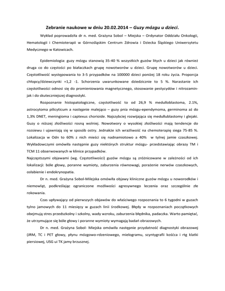 Zebranie naukowe w dniu 20.02.2014 – Guzy mózgu u dzieci. Wykład poprowadziła dr n. med. Grażyna Sobol – Miejska – Ordynator Oddziału Onkologii, Hematologii i Chemioterapii w Górnośląskim Centrum Zdrowia i Dziecka Śląskiego Uniwersytetu Medycznego w Katowicach. Epidemiologia: guzy mózgu stanowią 35-40 % wszystkich guzów litych u dzieci jak również druga co do częstości po białaczkach grupę nowotworów u dzieci. Grupę nowotworów u dzieci. Częstotliwośd występowania to 3-5 przypadków na 100000 dzieci poniżej 18 roku życia. Proporcja chłopcy/dziewczynki =1,2 -1. Schorzenia uwarunkowane dziedzicznie to 5 %. Narastanie ich częstotliwości odnosi się do promieniowania magnetycznego, stosowanie pestycydów i nitrozaminjak i do skuteczniejszej diagnostyki. Rozpoznanie histopatologiczne, częstotliwośd to od 26,9 % medulloblastoma, 2.1%, astrocytoma pilicyticum a następnie malejąco – guzy pnia mózgu-ependymoma, germinoma aż do 1,3% DNET, meningioma i captexus chorioide. Najszybciej rozwijająca się medullublastomy i glejaki. Guzy o niższej złośliwości rosną wolniej. Nowotwory o wysokiej złośliwości mają tendencje do rozsiewu i ujawniają się w sposób ostry. Jednakże ich wrażliwośd na chemoterapię siega 75-85 %. Lokalizacja w Odn to 60% z nich mieści się nadnamiotowo a 40% w tylnej jamie czaszkowej. Wykładowczymi omówiła następnie guzy niektórych struktur mózgu- przedstawiając obrazy TM i TCM 11 obserwowanych w klinice przypadków. Najczęstszymi objawami (wg. Częstotliwości) guzów mózgu są zróżnicowane w zależności od ich lokalizacji: bóle głowy, poranne wymioty, zaburzenia równowagi, porażenie nerwów czaszkowych, osłabienie i endokrynopatia. Dr n. med. Grażyna Sobol-Milejska omówiła objawy kliniczne guzów mózgu u noworodków i niemowląt, podkreślając ograniczone możliwości agresywnego leczenia oraz szczególnie złe rokowania. Czas upływający od pierwszych objawów do właściwego rozpoznania to 6 tygodni w guzach tylno jamowych do 11 miesięcy w guzach linii środkowej. Błędy w rozpoznaniach początkowych obejmują stres przedszkolny i szkolny, wady wzroku, zaburzenia błędnika, padaczka. Warto pamiętad, że utrzymujące się bóle głowy i poranne wymioty wymagają badao obrazowych. Dr n. med. Grażyna Sobol- Miejska omówiła następnie przydatnośd diagnostyki obrazowej (JRM, TC i PET głowy, płynu mózgowo-rdzeniowego, mielogramu, scyntygrafii kośdca i rtg klatki piersiowej, USG ui TK jamy brzusznej. Terapia Leczenie skojarzone guzów mózgu polega na łączeniu (neurochirurgii, chemioterapii, radioterapii- naznaczając cele każdego z nich) Metoda leczenia zależy od wieku chorego. Do 3 roku życia w guzach o wysokiej złośliwości stosuje się tylko chemioterapie (winkrystyna, cisplastyna, eposide i cyklofosfamid). U dzieci starszych ze znanym histogramem guza mózgu- chemioterapia (Cykle), radioterapia – w guzach bez identyfikacji histopatologicznej (np. niemożnośd pobrania wycinka ze względu na lokalizację w pniu mózgu) i niemożnośd interwencji neurochirurgicznej – dzieci poddawane są chemioterapii i radioterapii. Program leczenia guzów mózgu w Polsce prowadzony jest wg. Ustaleo Polskiej Grupy Onkologów Dziecięcych. Koordynatorem jest prof. D. Perek z Centrum Zdrowia Dziecka w Warszawie. Rokowania odnośnie 5-letnich przeżyd bez wznowy: W glejkach ( w zależności od stopnia złośliwości = 40% - 70 %,) W medulloblastomach ( w zależności od stopnia złośliwości = 60 %-90%) W niewydzielających do 98% W wydzielających do 80 % W guzach pnia mózgu 5-10 % 3 letnich przeżyd Dr n. med. Grażyna Sobol – Miejska oparła swój wykład o swoje wieloletnie doświadczenie kliniczne oraz o dwadzieścia pozycji najnowszego piśmiennictwa polsko i angielskojęzycznego.