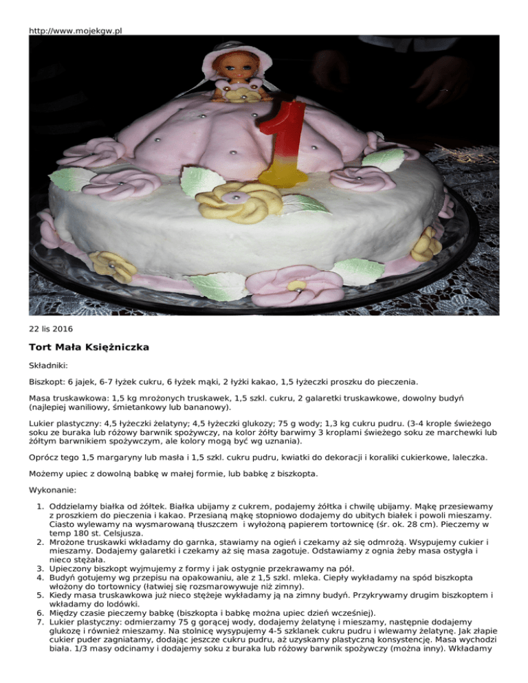 http://www.mojekgw.pl 22 lis 2016 Tort Mała Księżniczka Składniki: Biszkopt: 6 jajek, 6-7 łyżek cukru, 6 łyżek mąki, 2 łyżki kakao, 1,5 łyżeczki proszku do pieczenia. Masa truskawkowa: 1,5 kg mrożonych truskawek, 1,5 szkl. cukru, 2 galaretki truskawkowe, dowolny budyń (najlepiej waniliowy, śmietankowy lub bananowy). Lukier plastyczny: 4,5 łyżeczki żelatyny; 4,5 łyżeczki glukozy; 75 g wody; 1,3 kg cukru pudru. (3-4 krople świeżego soku ze buraka lub różowy barwnik spożywczy, na kolor żółty barwimy 3 kroplami świeżego soku ze marchewki lub żółtym barwnikiem spożywczym, ale kolory mogą być wg uznania). Oprócz tego 1,5 margaryny lub masła i 1,5 szkl. cukru pudru, kwiatki do dekoracji i koraliki cukierkowe, laleczka. Możemy upiec z dowolną babkę w małej formie, lub babkę z biszkopta. Wykonanie: 1. Oddzielamy białka od żółtek. Białka ubijamy z cukrem, podajemy żółtka i chwilę ubijamy. Mąkę przesiewamy z proszkiem do pieczenia i kakao. Przesianą mąkę stopniowo dodajemy do ubitych białek i powoli mieszamy. Ciasto wylewamy na wysmarowaną tłuszczem i wyłożoną papierem tortownicę (śr. ok. 28 cm). Pieczemy w temp 180 st. Celsjusza. 2. Mrożone truskawki wkładamy do garnka, stawiamy na ogień i czekamy aż się odmrożą. Wsypujemy cukier i mieszamy. Dodajemy galaretki i czekamy aż się masa zagotuje. Odstawiamy z ognia żeby masa ostygła i nieco stężała. 3. Upieczony biszkopt wyjmujemy z formy i jak ostygnie przekrawamy na pół. 4. Budyń gotujemy wg przepisu na opakowaniu, ale z 1,5 szkl. mleka. Ciepły wykładamy na spód biszkopta włożony do tortownicy (łatwiej się rozsmarowywuje niż zimny). 5. Kiedy masa truskawkowa już nieco stężeje wykładamy ją na zimny budyń. Przykrywamy drugim biszkoptem i wkładamy do lodówki. 6. Między czasie pieczemy babkę (biszkopta i babkę można upiec dzień wcześniej). 7. Lukier plastyczny: odmierzamy 75 g gorącej wody, dodajemy żelatynę i mieszamy, następnie dodajemy glukozę i również mieszamy. Na stolnicę wysypujemy 4-5 szklanek cukru pudru i wlewamy żelatynę. Jak złapie cukier puder zagniatamy, dodając jeszcze cukru pudru, aż uzyskamy plastyczną konsystencję. Masa wychodzi biała. 1/3 masy odcinamy i dodajemy soku z buraka lub różowy barwnik spożywczy (można inny). Wkładamy do woreczka żeby się nie skruszyła. 8. Margarynę ucieramy z cukrem pudrem. Tort wyciągamy z tortownicy i smarujemy masą z margaryny(lukier plastyczny będzie się lepiej trzymać, a tort lepiej kroić). Białą masę lukrową rozwałkowujemy na folii spożywczej (wałek sparujemy trochę olejem żeby nie przywierał do lukru) i przenosimy na tort. Dociskamy i odcinamy zbędne kawałki, które możemy zabarwić na żółto bądź inny kolor. 9. Jeśli babkę piekliśmy w formie bez kominka to wycinamy środek tak żeby wożyć laleczkę. Można wlać do środka trochę masy truskawkowej lub margarynowej, wtedy laleczka się nie przechyli. Zanim włożymy do środka laleczkę rozwałkowujemy różową masę tak jak białą i nanosimy na babkę, dociskamy, większe resztki odcinamy mniejsze zaginamy pod spod babki. Na środku we wgłębieniu wycinamy dziurkę lub tylko nacinamy i montujemy laleczkę. Z resztek różowej masy robimy górę sukienki, czapeczkę wedle uznania i kwiatki. Taką księżniczkę stawiamy na torcie z jednej strony. Ozdabiamy kwiatkami gotowymi lub zrobionymi z lukru i koralikami. 10. Rady: dodając zielony barwnik do białej masy uzyskamy zieloną trawkę, tort będzie bardziej kolorowy. Jeśli nie dodamy glukozy lukier nie będzie plastyczny. Jeśli zrobimy białą sukienkę, jako ozdobę dołożymy hostię i winogrona uzyskamy oryginalny tort komunijny. Paulina C. z Koło Gospodyń Wiejskich w Bajdach