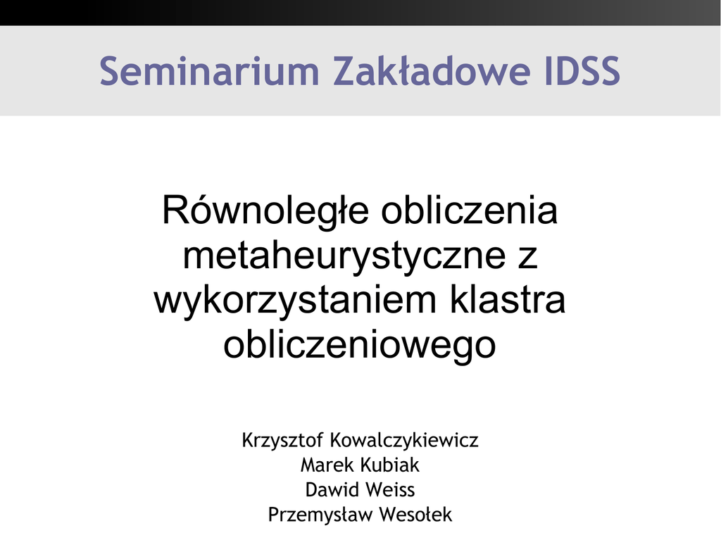 Seminarium Zakładowe IDSS Równoległe obliczenia metaheurystyczne z wykorzystaniem klastra obliczeniowego Krzysztof Kowalczykiewicz Marek Kubiak Dawid Weiss Przemysław Wesołek Motywacje raz jeszcze... ● ● ● ● Zagospodarowanie “wolnych” mocy obliczeniowych w lab. 45 (15 x 3.2Ghz) Zbadanie istniejących rozwiązań do budowy klastrów obliczeniowych Zbudowanie dostępnego, łatwego w obsłudze i nieinwazyjnego systemu obliczeniowego Analiza metaheurystyk pod kątem zrównoleglenia – – w szczególności PMA - Pareto Memetic Algorithm na przykładzie problemów MOKP i MOTSP Początki... ● Parallel Knoppix ● ● ● ● system Linux startujący z CD (lub pobierający dane z innego komputera już wystartowanego - PXE) łatwy w obsłudze i dobrze radzący sobie ze sprzętem w stosunku do Knoppix rozszerzony o skrypty do budowy klastra, odpowiednie API i przykłady Wady ● ● ● statyczny klaster kłopotliwe inicjowanie niskopoziomowe API (MPI, PVM) Infrastruktura Alchemi ● Dostępna ● ● ● Nieinwazyjna ● ● ● możliwość inicjowania obliczeń z dowolnej maszyny (nawet z zewnątrz PP - tunel) monitorowanie z zewnątrz pracująca w tle na komputerach lab. usługa mały narzut i możliwość normalnego wykorzystywania maszyn nawet w trakcie obliczeń Łatwa w obsłudze ● ● ● możliwość stosowania Job API (dowolne binaria) aplikacje natywne .NET (naśladujące wątki) prostota - ograniczona ilość narzędzi Wyzwania technologiczne ● Integracja biblioteki MOMHlib z platformą .NET – – – ● ● oryginalnie napisana w Visual C++ przeniesiona na Linux/C++ ponowna integracja w Managed C++ (CLR) “Oswojenie” składni Managed C++ i mieszanie kodu managed i unmanaged “Oswojenie” API Alchemi Adaptacja MOMHlib ● ● ● kompilacja się powiodła po usunięciu kilku drobnych problemów domyślnie aplikacja C++/CLR działa jako unmanaged) próba konwersji na managed nie powiodła się ● ● ● ● class -> ref class new -> gcnew biblioteka std ++ -> kolekcje .NET wskaźniki & i * -> referencje ^ Managed C++ ● ● ● ● ● rozszerzenia języka C++ do pisania aplikacji działających na maszynie wirt. CLR (.NET) umożliwia mieszanie kodu/klas zarządzanych (wykorzystujących GC) i niezarządzanych (tradycyjne wskaźniki/referencje) skomplikowana składnia w porównaniu do C#, ale większa kontrola i możliwość mieszania z kodem unmanaged trudności mieszania kodu m/um w obrębie jednej klasy trudności z przenoszeniem typów Managed C++ - przykład API Alchemi ● ● ● ● Naśladuje API wątków Należy “opakować” jednostkę uruchomienia w potomka klasy GThread i zaimplementować metodę Start() Alchemi sam przenosi binaria (i wskazane pliki) na maszynę docelową Batch vs On-the-fly ● ● utworzenie wszystkich wątków na początku dodawanie nowych wątków w razie potrzeby Obliczenia równoległe ● Podejście trywialne ● ● Podejście ambitniejsze ● ● ● ● ● równoległe uruchamianie algorytmu z różnym wartościami parametrów i różnymi instancjami analiza strukturalna algorytmu analiza czasów i krotności uruchomienia poszczególnych faz algorytmu (profiling) analiza możliwości rozdziału pętli analiza możliwości rozdziału danych Dobry kandydat ● ● dobrze separowalne dane lub pętle długotrwała iteracja (co najmniej kilka sekund) PMA - Pareto Memetic Algorithm ● ● hybryda algorytmu genetycznego (rekombinacja) z przeszukiwaniem lokalnym (heurystyka lokalna) ogólny schemat: wygeneruj początkowy zbiór rozwiązań powtarzaj wylosuj wektor wag dla funkcji skalaryzującej wybierz dwa rozwiązania dobre wg funkcji skalaryzującej dokonaj rekombinacji rozwiązań zastosuj lokalną heurystykę do potomka aż zajdzie warunek zatrzymania Równoległe PMA - intuicja ● równoległe lokalne wyszukiwanie – – ● równoległe iteracje pętli – – ● równoległa analiza w wielu kierunkach? wybór najlepszego? z różnymi czy tymi samymi wektorami wag? jak łączyć dane wyjściowe? równoległa rekombinacja – – różne metody? ta sama z różnymi parametrami? Analiza uruchomieniowa PMA MOKP generowanie początkowego zbioru rozw. 52% główna pętla 48% inicjalizacja wag <1% turniej 17% rekombinacja + local search 67% aktualizacja zbioru rozw. 15% ilość iteracji (tyś.) śr. czas iteracji MOTSP 4% 96% <1% 2% 95% 2% 7,5-17,5 2,5-22,5 18ms 895μs Problemy z PMA... ● ● ● ● Zbyt krótkotrwałe powtórzenia pętli i local search aby zrównoleglać pojedyńcze iteracje Zrównoleglenie stwarza problem ze względu na słabą separowalność danych i problemy z łączeniem rezultatów z różnych uruchomień Duża ilość czynników losowych (wektor wag, turniej, rekombinacja) Implementacja MOKP wykorzystuje uproszczony local search - iteracja jeszcze krótsza ...zatem podejście trywialne MOKP ● 9 instancji ● TempPopulationSize ● ● ● 20 InitPopulationSize ● ● ● 150,200,250,300,350 Iterations ● MOTSP ● 49 instancji ● TempPopulationSize 50 = 45 wątków InitPopulationSize ● ● 20, 40, 60 100, 200, 300 Iterations ● 25, 50, 75 = 1323 wątków MOKP (45 wątków) ● Implementacja ● ● ● uproszczone lokalne przeszukiwanie (przywrócenie dopuszczalności po rekombinacji) Czas eksperymentu: Całkowity czas obliczeń: ~7min. ~1Ghz*h MOTSP (1323 wątki) ● Implementacja ● ● ● pełne lokalne przeszukiwanie (DPXRecombine + Steepest LS) Czas eksperymentu: Całkowity czas obliczeń: ~5h ~200Ghz*h Podsumowanie ● ● ● Infrastruktura Alchemi dostępna w lab. 45 (serwer na minos) Prosta integracja (bezpośrednio z .NET lub batch job przez XML) Perspektywy ● ● bardziej dogłębna analiza PMA i zastosowanych heurystyk pod kątem zrównoleglania analiza metod łączenia rezultatów z różnych uruchomień