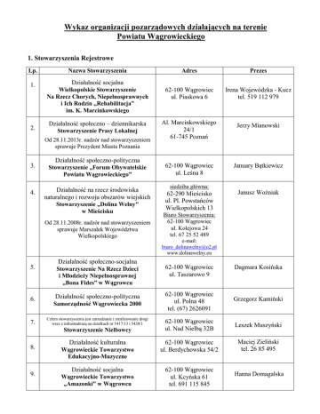 Wykaz organizacji pozarządowych działających na terenie Powiatu Wągrowieckiego 1. Stowarzyszenia Rejestrowe Lp. 1. 2. Nazwa Stowarzyszenia Adres Prezes Działalność socjalna Wielkopolskie Stowarzyszenie Na Rzecz Chorych, Niepełnosprawnych i Ich Rodzin „Rehabilitacja” im. K. Marcinkowskiego 62-100 Wągrowiec ul. Piaskowa 6 Irena Wojewódzka - Kucz tel. 519 112 979 Działalność społeczno – dziennikarska Stowarzyszenie Prasy Lokalnej Al. Marcinkowskiego 24/1 61-745 Poznań Jerzy Mianowski Działalność społeczno-polityczna Stowarzyszenie „Forum Obywatelskie Powiatu Wągrowieckiego” 62-100 Wągrowiec ul. Leśna 8 January Bątkiewicz Działalność na rzecz środowiska naturalnego i rozwoju obszarów wiejskich Stowarzyszenie „Dolina Wełny" w Mieścisku 62-290 Mieścisko ul. Pl. Powstańców Wielkopolskich 13 Od 28.11.2013r. nadzór nad stowarzyszeniem sprawuje Prezydent Miasta Poznania 3. 4. Od 28.11.2008r. nadzór nad stowarzyszeniem sprawuje Marszałek Województwa Wielkopolskiego siedziba główna: Janusz Woźniak Biuro Stowarzyszenia: 62-100 Wągrowiec ul. Kolejowa 24 tel. 67 25 52 489 e-mail: [email protected] www.dolinawelny.eu Działalność społeczno-socjalna Stowarzyszenie Na Rzecz Dzieci i Młodzieży Niepełnosprawnej „Bona Fides” w Wągrowcu 62-100 Wągrowiec ul. Taszarowo 9 6. Działalność społeczno-polityczna Samorządność Wągrowiecka 2000 62-100 Wągrowiec ul. Polna 48 tel. (67) 2626091 Grzegorz Kamiński 7. Celem stowarzyszenia jest zarzadzanie i zrealizowanie drogi wraz z infrastrukturą na działkach nr 5417/13 i 5420/1 62-100 Wągrowiec ul. Nad Nielbą 32B Leszek Muszyński 5. Stowarzyszenie Nielbowcy Dagmara Kosińska 8. Działalność kulturalna Wągrowieckie Towarzystwo Edukacyjno-Muzyczne 62-100 Wągrowiec ul. Berdychowska 54/2 Maciej Zieliński tel. 26 85 495 9. Działalność socjalna Wągrowieckie Towarzystwo „Amazonki” w Wągrowcu 62-100 Wągrowiec ul. Kcyńska 61 tel. 691 115 845 Hanna Domagalska Działalność socjalna Stowarzyszenie im. Ks. Jerzego Niwarda Musolffa 62-100 Wągrowiec Pl. Kardynała Stefana Wyszyńskiego 1 tel. 26 21 560 Działalność turystyczno-kulturalna Polskie Towarzystwo Turystyczno – Krajoznawcze Oddział w Wągrowcu imienia Waldemara Balcerowicza 62-100 Wągrowiec ul. Janowiecka 63 Tomasz Biegun Pomoc dzieciom z rodzin w trudnej sytuacji życiowej i wyrównanie ich szans Stowarzyszenie Pomocy Uczniom im. Jana Pawła II w Mieścisku 62-290 Mieścisko ul. Gnieźnieńska 32 Leszek Bodus Działalność na rzecz środowiska naturalnego Stowarzyszenie EkologicznoWędkarskie „Pałuczanin Damasławek” 62-110 Damasławek ul. Żnińska 9 tel. 26 13 031 Andrzej Bachora Działalność kulturalno-społeczna Stowarzyszenie Emerytów i Rencistów Resortu Spraw Wewnętrznych Rzeczpospolitej Polskiej - Koło nr 6 w Wągrowcu 62-100 Wągrowiec ul. Taszarowo 11 tel. (67) 26 22 294 26 25 450 Zbigniew Głów 15. Działalność dotycząca handlu Wągrowieckie Zrzeszenie Handlu i Usług 62-100 Wągrowiec ul. Gnieźnieńska 49 tel. 26 28 376 Adam Bilski 16. Działalność społeczno-polityczna Stowarzyszenie „Wspólnota i Praca” Działalność zawieszona 62-100 Wągrowiec ul. Kościuszki 40 Jerzy Springer Działalność socjalna Katolickie Stowarzyszenie Osób Niepełnosprawnych „Wesołe Misie” 62-085 Skoki ul. Pl. Powstańców Wielkopolskich 10 Alicja Nowak Działalność turystyczno-kulturalna Wągrowieckie Stowarzyszenie Szlaku Cysterskiego 62-100 Wągrowiec ul. Opacka 15 Andrzej Wieczorek 19. Działalność socjalna PCK w Wągrowcu Koło Środowiskowe 62-100 Wągrowiec ul. Piaskowa 24 tel. 67 2621001 Jan Maćkowiak 20. Działalność kulturalno-społeczna Stowarzyszenie Europejskiego Dziedzictwa Kulturowego w Siennie 62-100 Wągrowiec Sienno 27 tel. (67) 26 20 689 Małgorzata Jazgar tel. 505 549 079 10. 11. 12. 13. 14. 17. 18. 21. Działalność społeczno-kulturalno-sportowa Stowarzyszenie Na Rzecz Rozwoju Wsi Żelice 62-100 Wągrowiec Żelice 55/1 Ks. Andrzej Rygielski Andrzej Piechowiak 22. Działalność oświatowo-kulturalna Stowarzyszenie Rozwoju Wsi „Razem w przyszłość” 62-085 Skoki Rejowiec 15 tel. (61) 81 24 228 Leszek Gronowicz 23. Działalność ogólna Stowarzyszenie na Rzecz Rozwoju Gminy Wapno 62-120 Wapno ul. Świerczewskiego 1A Leonard Przesławski tel. (067) 26 11 097 24. Działalność kulturalna Towarzystwo Przyjaciół Ziemi Pałuckiej w Wągrowcu 62-100 Wągrowiec ul. Opacka 15 tel. (67) 26 85 911 Kinga Babicz 25. Działalność kulturalna Stowarzyszenie Teatru Prób 62-100 Wągrowiec Rąbczyn 3 [email protected] 62-085 Skoki Antoniewo tel. (61) 81 24 251 fax (61) 81 24 267 693 825 714 62-130 Gołańcz ul. dr. P. Kowalika 3 tel. 26 11 804 adres do korespondencji: ul. Walki Młodych 35c/1 62-130 Gołańcz 26. 27. Działalność socjalna Towarzystwo Wspierania Rodziny i Dziecka „Alia” Działalność kulturalno-społeczna Towarzystwo Miłośników Ziemi Gołanieckiej w Gołańczy Miłosz Drążkiewicz Antoni Kasica Adam Kusz Działalność kulturalno-społecznoturystyczna Towarzystwo Współpracy Gminy Damasławek z Zagranicą 62-110 Damasławek ul. Kcyńska 15 Działalność socjalna Polski Związek Niewidomych Okręg Wielkopolski z siedzibą w Poznaniu Zarząd Koła w Wągrowcu 62-100 Wągrowiec ul. Kościuszki 15 519 514 172 Jolanta Deja 30. Działalność dotycząca obronności kraju Kurkowe Bractwo Strzeleckie w Skokach 62-085 Skoki ul. Wągrowiecka 4c Krzysztof Jachna 61 8124085 31. Działalność dotycząca obronności kraju Kurkowe Bractwo Strzeleckie w Gołańczy 62-130 Gołańcz ul. Walki Młodych 33 Piotr Nader 32. Działalność społeczna i dotycząca obronności kraju Kurkowe Bractwo Strzeleckie w Mieścisku 62-290 Mieścisko ul. Polna 31 Bolesław Lemański tel. 601 055 665 33. Działalność dotycząca obronności kraju Bractwo Strzeleckie w Wągrowcu 28. 29. 62-100 Wągrowiec Kobylec 35/1 adres do korespondencji: Bogdan Gajewski Prezes Zarządu Bractwa Strzelec