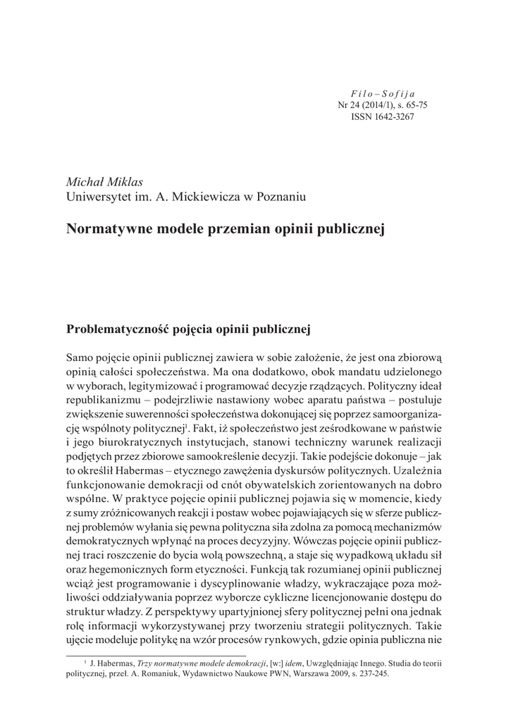 Filo– Sofija Nr 24 (2014/1), s. 65-75 ISSN 1642-3267 Michał Miklas Uniwersytet im. A. Mickiewicza w Poznaniu Normatywne modele przemian opinii publicznej Problematyczność pojęcia opinii publicznej Samo pojęcie opinii publicznej zawiera w sobie założenie, że jest ona zbiorową opinią całości społeczeństwa. Ma ona dodatkowo, obok mandatu udzielonego w wyborach, legitymizować i programować decyzje rządzących. Polityczny ideał republikanizmu – podejrzliwie nastawiony wobec aparatu państwa – postuluje zwiększenie suwerenności społeczeństwa dokonującej się poprzez samoorganizację wspólnoty politycznej1. Fakt, iż społeczeństwo jest ześrodkowane w państwie i jego biurokratycznych instytucjach, stanowi techniczny warunek realizacji podjętych przez zbiorowe samookreślenie decyzji. Takie podejście dokonuje – jak to określił Habermas – etycznego zawężenia dyskursów politycznych. Uzależnia funkcjonowanie demokracji od cnót obywatelskich zorientowanych na dobro wspólne. W praktyce pojęcie opinii publicznej pojawia się w momencie, kiedy z sumy zróżnicowanych reakcji i postaw wobec pojawiających się w sferze publicznej problemów wyłania się pewna polityczna siła zdolna za pomocą mechanizmów demokratycznych wpłynąć na proces decyzyjny. Wówczas pojęcie opinii publicznej traci roszczenie do bycia wolą powszechną, a staje się wypadkową układu sił oraz hegemonicznych form etyczności. Funkcją tak rozumianej opinii publicznej wciąż jest programowanie i dyscyplinowanie władzy, wykraczające poza możliwości oddziaływania poprzez wyborcze cykliczne licencjonowanie dostępu do struktur władzy. Z perspektywy upartyjnionej sfery politycznej pełni ona jednak rolę informacji wykorzystywanej przy tworzeniu strategii politycznych. Takie ujęcie modeluje politykę na wzór procesów rynkowych, gdzie opinia publiczna nie 1 J. Habermas, Trzy normatywne modele demokracji, [w:] idem, Uwzględniając Innego. Studia do teorii politycznej, przeł. A. Romaniuk, Wydawnictwo Naukowe PWN, Warszawa 2009, s. 237-245. 66 Michał Miklas stanowi prostego wskaźnika popytu na określone propozycje programowe, ale jest obiektem odgórnego oddziaływania ze strony różnego rodzaju zainteresowanych instytucji oraz liderów opinii publicznej. Następstwem coraz szerszej inkluzji do sfery polityki stały się procesy jej umasowienia, które z konieczności prowadziły do wyróżnienia warstwy aktorów kształtujących opinie i widzów mniej lub bardziej ją przyjmujących. Sieć czynników determinujących opinię publiczną odzwierciedla w dużej mierze zastane jawne bądź ukryte stosunki dominacji. Jednocześnie masowy charakter demokracji jest krytykowany jako zagrożenie dla stabilności funkcjonowania zracjonalizowanych systemów politycznych: hamujący racjonalizację i modernizację, negujące powszechnie przyjęty i sprawdzony porządek normatywny. Każda normatywna koncepcja polityki2 musi równocześnie odnosić się do dwóch źródeł legitymizacji. Racjonalności w rozumieniu instrumentalnym oraz demokratyczności jako inkluzji. Uprawomocnienie poprzez odwołanie do pojęcia racjonalności wskazuje na niezależne wobec indywidualnych czy grupowych świadomości kryteria prawdy, słuszności czy skuteczności. Skrajnym, modelowym wyrazem rządów racjonalności jest technokracja lub w wyrażeniu mniej pejoratywnym – merytokracja, władza ekspertów, kiedy treść polityki jako praktyki podejmowania wiążących decyzji sprowadzana zostaje do rozwiązywania problemów technicznych. Zbigniew Brzeziński swego czasu postulował, by „odgraniczyć coraz wyraźniej system polityczny od społeczeństwa i zacząć je traktować jako odrębne byty”3. Celem takiego podejścia jest depolityzacja państwa, naiwna próba wyjęcia go z obszaru potencjalnych antagonizmów. W tym kontekście popularne określenie męża stanu odnosi się do heglowskiej koncepcji monarchy jako jedności osoby publicznej i prywatnej. Źródłem uprawomocnienia demokratycznego jest natomiast upodmiotowienie jednostki i społeczeństwa jako faktycznego suwerena władzy i zarazem docelowego beneficjenta działań podjętych przez państwo. Legitymizacja odbywa się nie poprzez odwołanie do czegoś zewnętrznego i obiektywnego, ale poprzez same praktyki, reguły i procedury dyskursu publicznego, warunkujące ową podmiotowość. Chcąc ocenić prawomocność przekonań pod względem zarówno czysto technicznej racjonalności instrumentalnej, jak i racjonalności aksjologicznej nie można odwołać się jedynie do kategorii racjonalnych działań. Normatywny model polityki musi uwzględniać przede wszystkim aspekt diachroniczny jej funkcjonowania, a nie jedynie synchroniczny. Innymi słowy, musi się koncentrować również na warunkach rozumnego przebiegu procesu kształtowania, transformacji Używam w tym kontekście określenia „polityka” jako sfery, w której artykułują się antagonizmy będące przedmiotem publicznej debaty. Nie używam natomiast pojęcia „sfera publiczna”, gdyż zakładałoby ono jakieś kryterium odgraniczenia jej od odpolitycznionej sfery prywatnej. 2 Cyt. za: E. Laclau, Ch. Mouffe, Hegemonia i socjalistyczna strategia. Przyczynek do projektu radykalnej polityki demokratycznej, przeł. S. Królak, Wydawnictwo Naukowe Dolnośląskiej Szkoły Wyższej Edukacji TWP we Wrocławiu, Wrocław 2007, s. 182. 3 Normatywne modele przemian opinii publicznej 67 przekonań, a także uzyskiwania przez nie kulturowego statusu obowiązywania, a nie jedynie tworzyć kryteria pozwalające w sposób najbardziej jednoznaczny rozstrzygnąć co jest , a co nie jest racjonalne „tu i teraz”. Z tego względu normatywność ujęta synchronicznie musi szukać zapośredniczenia w wyspecjalizowanych instytucjach eksperckich, które na podstawie wiedzy – np. z zakresu ekonomii, psychologii, prawa – siłą swojego społecznie usankcjonowanego autorytetu decydują 