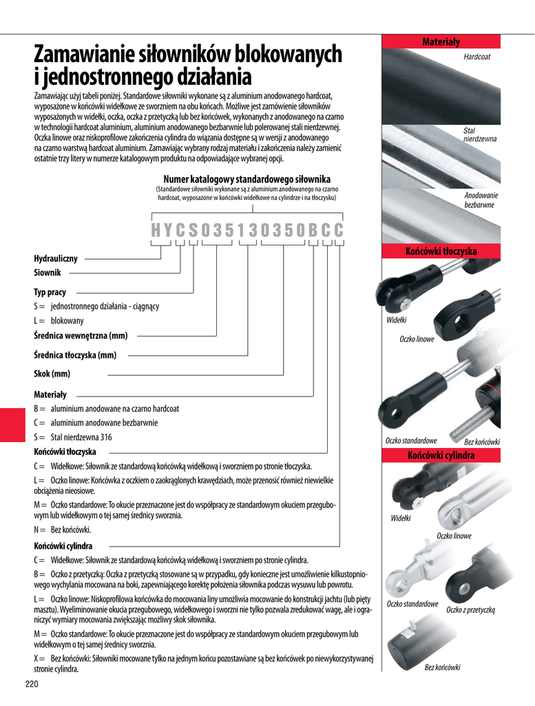 Materiały Zamawianie siłowników blokowanych i jednostronnego działania Hardcoat Zamawiając użyj tabeli poniżej. Standardowe siłowniki wykonane są z aluminium anodowanego hardcoat, wyposażone w końcówki widełkowe ze sworzniem na obu końcach. Możliwe jest zamówienie siłowników wyposażonych w widełki, oczka, oczka z przetyczką lub bez końcówek, wykonanych z anodowanego na czarno w technologii hardcoat aluminium, aluminium anodowanego bezbarwnie lub polerowanej stali nierdzewnej. Oczka linowe oraz niskoprofilowe zakończenia cylindra do wiązania dostępne są w wersji z anodowanego na czarno warstwą hardcoat aluminium. Zamawiając wybrany rodzaj materiału i zakończenia należy zamienić ostatnie trzy litery w numerze katalogowym produktu na odpowiadające wybranej opcji. Stal nierdzewna Numer katalogowy standardowego siłownika (Standardowe siłowniki wykonane są z aluminium anodowanego na czarno hardcoat, wyposażone w końcówki widełkowe na cylindrze i na tłoczysku) Anodowanie bezbarwne HYCS035130350BCC Hydrauliczny Siownik Typ pracy S = jednostronnego działania - ciągnący L = blokowany Średnica wewnętrzna (mm) Końcówki tłoczyska Widełki Oczko linowe Średnica tłoczyska (mm) Skok (mm) Materiały B = aluminium anodowane na czarno hardcoat C = aluminium anodowane bezbarwnie S = Stal nierdzewna 316 Końcówki tłoczyska C = Widełkowe: Siłownik ze standardową końcówką widełkową i sworzniem po stronie tłoczyska. L = Oczko linowe: Końcówka z oczkiem o zaokrąglonych krawędziach, może przenosić również niewielkie obciążenia nieosiowe. M = Oczko standardowe: To okucie przeznaczone jest do współpracy ze standardowym okuciem przegubowym lub widełkowym o tej samej średnicy sworznia. N = Bez końcówki. Końcówki cylindra C = Widełkowe: Siłownik ze standardową końcówką widełkową i sworzniem po stronie cylindra. B = Oczko z przetyczką: Oczka z przetyczką stosowane są w przypadku, gdy konieczne jest umożliwienie kilkustopniowego wychylania mocowana na boki, zapewniającego korektę położenia siłownika podczas wysuwu lub powrotu. L = Oczko linowe: Niskoprofilowa końcówka do mocowania liny umożliwia mocowanie do konstrukcji jachtu (lub pięty masztu). Wyeliminowanie okucia przegubowego, widełkowego i sworzni nie tylko pozwala zredukować wagę, ale i ograniczyć wymiary mocowania zwiększając możliwy skok siłownika. M = Oczko standardowe: To okucie przeznaczone jest do współpracy ze standardowym okuciem przegubowym lub widełkowym o tej samej średnicy sworznia. X = Bez końcówki: Siłowniki mocowane tylko na jednym końcu pozostawiane są bez końcówek po niewykorzystywanej stronie cylindra. 220 Oczko standardowe Bez końcówki Końcówki cylindra Widełki Oczko linowe Oczko standardowe Oczko z przetyczką Bez końcówki