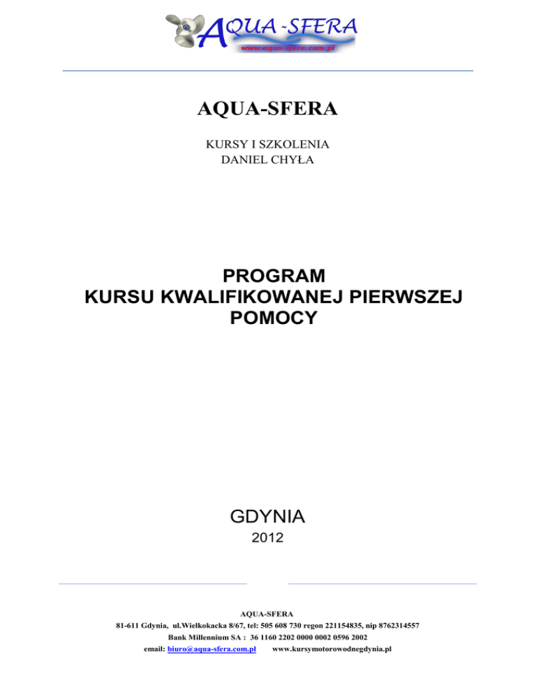 AQUA-SFERA KURSY I SZKOLENIA DANIEL CHYŁA PROGRAM KURSU KWALIFIKOWANEJ PIERWSZEJ POMOCY GDYNIA 2012 AQUA-SFERA 81-611 Gdynia, ul.Wielkokacka 8/67, tel: 505 608 730 regon 221154835, nip 8762314557 Bank Millennium SA : 36 1160 2202 0000 0002 0596 2002 email: [email protected] www.kursymotorowodnegdynia.pl Podstawa prawna: Program kursu zgodny z: - Ustawą z dnia 8 września 2006 r. o Państwowym Ratownictwie Medycznym (Dz. U. z 2006 r., Nr 191, poz. 1410); - Rozporządzeniem Ministra Zdrowia z dnia 19 marca 2007 r. w sprawie kursu w zakresie kwalifikowanej pierwszej pomocy (Dz. U. z 2007 r., Nr 60, poz. 408) AQUA-SFERA 81-611 Gdynia, ul.Wielkokacka 8/67, tel: 505 608 730 regon 221154835, nip 8762314557 Bank Millennium SA : 36 1160 2202 0000 0002 0596 2002 email: [email protected] www.kursymotorowodnegdynia.pl SPIS TREŚCI: I. ZAŁOŻENIA PROGRAMOWE.............................................................................. 1. CEL KSZTAŁCENIA…………………………………………………………………… 2. CZAS TRWANIA KURSU…………………………………………………………….. 3. WARUNKI REALIZACJI KURSU…………………………………………………….. 4. KADRA DYDAKTYCZNA……………………………………………………………… 5. ZALECENIA I WSKAZÓWKI METODYCZNE………………………………………. 6. SYSTEM OCENIANIA ………………………………………………………………… 7. UZYSKANIE KWALIFIKACJI RATOWNIKA…………………………………….. II. PLAN NAUCZANIA..................................................................................... 1. ROZKŁAD ZAJĘĆ……………………………………………………………………… 2. NAUCZANIA…………………………………………………………………. TREŚCI 2.1.Organizacja ratownictwa medycznego - podstawy prawne …………………… 2.2 Bezpieczeństwo własne, poszkodowanego, miejsca zdarzenia………………… 2.3.Zestawy ratownicze, dezynfekcja sprzętu ……………………………………… AQUA-SFERA 81-611 Gdynia, ul.Wielkokacka 8/67, tel: 505 608 730 regon 221154835, nip 8762314557 Bank Millennium SA : 36 1160 2202 0000 0002 0596 2002 email: [email protected] www.kursymotorowodnegdynia.pl 4 2.4. Elementy anatomii i fizjologii, ocena poszkodowanego, badanie wstępne oraz szczegółowe……………………………………………………………………………. 2.5. Poszkodowany nieprzytomny……………………………………………………….. 2.6. Resuscytacja (dorosły, dziecko, niemowlę, noworodek, sytuacje szczególne)… 2.7. Zasady defibrylacji poszkodowanego metodą półautomatyczną i automatyczną. 2.8. Wstrząs…………………………………………………………………………………. 2.9. Inne stany nagłe - drgawki, cukrzyca, zawał mięśnia sercowego, udar mózgowy, zatrucia, podtopienie……………………………………………………... 2.10. Urazy mechaniczne i obrażenia - złamania, zwichnięcia, skręcenia, krwotoki, obrażenia klatki piersiowej, brzucha, kręgosłupa, głowy i kończyn…………….. 2.11. Urazy chemiczne, termiczne, elektryczne i obrażenia, zagrożenia środowiskowe, akty terroru………………………………………………………….. 2.12. Taktyka działań ratowniczych - zdarzenie masowe, mnogie, pojedyncze, segregacja wstępna, karta udzielonej pomocy, logistyka………………………. 2.13. Ewakuacja ze strefy zagrożenia……………………………………………………. 2.14. Udzielanie kwalifikowanej pierwszej pomocy w sytuacjach symulowanych…… 2.15. Psychologiczne aspekty wsparcia poszkodowanych…………………………….. III. ZAŁĄCZNIKI…………............................................................................................ ZAŁĄCZNIK Nr 1 Wyposażenie ćwiczeniowej……………………………………… AQUA-SFERA 81-611 Gdynia, ul.Wielkokacka 8/67, tel: 505 608 730 regon 221154835, nip 8762314557 Bank Millennium SA : 36 1160 2202 0000 0002 0596 2002 email: [email protected] www.kursymotorowodnegdynia.pl sali ZAŁĄCZNIK Nr 2 Wzór zaświadczenia………………………………………………….. I. ZAŁOŻENIA PROGRAMOWE 1. CELE KSZTAŁCENIA 1.1 Cel główny kształcenia: Celem szkolenia jest przygotowanie ratowników jednostek współpracujących z systemem Państwowe Ratownictwo Medyczne do udzielania osobom w stanie nagłego zagrożenia zdrowotnego kwalifikowanej pierwszej pomocy w miejscu zdarzenia do czasu przekazania AQUA-SFERA 81-611 Gdynia, ul.Wielkokacka 8/67, tel: 505 608 730 regon 221154835, nip 8762314557 Bank Millennium SA : 36 1160 2202 0000 0002 0596 2002 email: [email protected] www.kursymotorowodnegdynia.pl ich personelowi opieki zdrowotnej. 1.2 Szczegółowe cele kształcenia: - utrwalenie podstawowej wiedzy z zakresu udzielania pierwszej pomocy; - zdobycie i utrwalenie wiedzy z zakresu kwalifikowanej pierwszej pomocy; - kształtowanie poczucia odpowiedzialności za jakość udzielonej pomocy; - kształtowanie właściwej postawy etycznej osób podejmujących czynności ratunkowe. 2. CZAS TRWANIA KURSU 2.1 Podstawową formą nauczania jest lekcja, której odpowiada jedna godzina dydaktyczna. 2.2 Kurs obejmuje 66 godzin dydaktycznych, w tym 25 godzin zajęć teoretycznych oraz 41 godzin zajęć praktycznych. 3. WARUNKI REALIZACJI KURSU 3.1 Zajęcia teoretyczne powinny być realizowane w salach wykładowych odpowiadających AQUA-SFERA 81-611 Gdynia, ul.Wielkokacka 8/67, tel: 505 608 730 regon 221154835, nip 8762314557 Bank Millennium SA : 36 1160 2202 0000 0002 0596 2002 email: [email protected] www.kursymotorowodnegdynia.pl warunkom BHP oraz wyposażonych w proste, jak i złożone środki dydaktyczne. 3.2 Zajęcia praktyczne powinny być realizowane w salach ćwiczeniowych wyposażonych zgodni