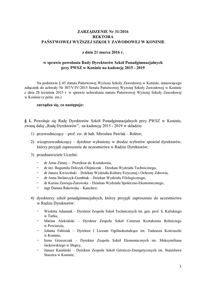 ZARZĄDZENIE Nr 31/2016 REKTORA PAŃSTWOWEJ WYŻSZEJ SZKOŁY ZAWODOWEJ W KONINIE z dnia 21 marca 2016 r. w sprawie powołania Rady Dyrektorów Szkół Ponadgimnazjalnych przy PWSZ w Koninie na kadencję 2015 - 2019 Na podstawie § 45 statutu Państwowej Wyższej Szkoły Zawodowej w Koninie, stanowiącego załącznik do uchwały Nr 307/V/IV/2015 Senatu Państwowej Wyższej Szkoły Zawodowej w Koninie z dnia 28 kwietnia 2015 r. w sprawie uchwalenia statutu Państwowej Wyższej Szkoły Zawodowej w Koninie (z późn. zm.) zarządza się, co następuje: § 1. Powołuje się Radę Dyrektorów Szkół Ponadgimnazjalnych przy PWSZ w Koninie, zwaną dalej „Radą Dyrektorów”, na kadencję 2015 - 2019 w składzie: 1) przewodniczący – prof. zw. dr hab. Mirosław Pawlak – Rektor; 2) wiceprzewodniczący – dyrektor wyłoniony w drodze wyborów spośród dyrektorów, którzy przyjęli zaproszenie do uczestnictwa w Radzie Dyrektorów; 3) przedstawiciele Uczelni: dr Artur Zimny – Prorektor ds. Kształcenia, dr inż. Bogumiła Delczyk-Olejniczak – Dziekan Wydziału Technicznego, dr Janusz Kwieciński – Dziekan Wydziału Kultury Fizycznej i Ochrony Zdrowia, dr Anna Stolarczyk-Gembiak – Dziekan Wydziału Filologicznego, dr Karina Zawieja-Żurowska – Dziekan Wydziału Społeczno-Ekonomicznego, mgr Danuta Rakowska – Kanclerz; 4) dyrektorzy szkół ponadgimnazjalnych, którzy przyjęli zaproszenie do uczestnictwa w Radzie Dyrektorów: Wioletta Adamiak – Dyrektor Zespołu Szkół Technicznych im. gen. prof. S. Kaliskiego w Turku, Marian Aleksiński – Dyrektor Zespołu Szkół Centrum Kształcenia Rolniczego w Powierciu, Jolanta Fabisiak – Dyrektor I Liceum Ogólnokształcące im. Tadeusza Kościuszki w Koninie, Irena Grzeszczak – Dyrektor Zespołu Szkół Ekonomicznych im. Maksymiliana Jackowskiego w Słupcy, Janusz Kamiński – Dyrektor Zespołu Szkół Górniczo-Energetycznych im. Stanisława Staszica w Koninie, 1 Waldemar Koligot – Dyrektor Liceum Ogólnokształcące im. Kazimierza Wielkiego w Kole, dr Janusz Kowarski – Dyrektor Zespołu Szkół Technicznych w Kole, Tomasz Kucharczyk – Dyrektor Zespołu Szkół im. M. Kopernika w Koninie, Marek Kujawa – Dyrektor Zespołu Szkół Ponadgimnazjalnych im. Braci Kostaneckich w Zagórowie, Karol Leszczyński – Dyrektor Zespołu Szkół Budowlanych im. Eugeniusza Kwiatkowskiego w Koninie, Anna Matczak-Gaj – Dyrektor Zespołu Szkół Ekonomiczno-Usługowych im. Fryderyka Chopina w Żychlinie, Krzysztof Pachciarz – Dyrektor Zespołu Szkół Centrum Kształcenia Ustawicznego im. Stefana Batorego w Koninie, Bożena Pyzder – Dyrektor III Liceum Ogólnokształcące im. C. K. Norwida w Koninie, Tadeusz Raczkowski – Dyrektor Liceum Ogólnokształcące im. Marszałka Józefa Piłsudskiego w Słupcy, Elżbieta Sztanga – Dyrektor Zespołu Szkół Ekonomiczno-Administracyjnych im. S. i W. Grabskich w Kole, Wojciech Szymczak – Dyrektor Zespołu Szkół Medycznych w Koninie, Wielkopolskie Samorządowe Centrum Kształcenia Zawodowego i Ustawicznego w Koninie, Krzysztof Świerk – Dyrektor Zespołu Szkół Rolniczych Centrum Kształcenia Praktycznego w Kaczkach Średnich, Edyta Truszkowska – Dyrektor Zespołu Szkół Technicznych i Hutniczych im. Marii Skłodowskiej-Curie w Koninie, Linda Wisialska – Dyrektor II Liceum Ogólnokształcące im. Krzysztofa Kamila Baczyńskiego w Koninie, Albin Zańko – Wicedyrektor I Liceum Ogólnokształcące im. Tadeusza Kościuszki w Turku, Jacek Żerkowski – Dyrektor Zespołu Szkół Ponadgimnazjalnych w Sompolnie. § 2. 1. Rada Dyrektorów jest ciałem opiniodawczym i doradczym Rektora PWSZ w Koninie. Zasadniczym celem działania Rady Dyrektorów jest zbliżenie środowiska szkolnego z regionu konińskiego i środowiska akademickiego Uczelni oraz wspieranie rozwoju dydaktycznego, naukowego, materialnego i organizacyjnego Uczelni i szkół ponadgimnazjalnych. 2. Do zadań Rady Dyrektorów należy w szczególności: 1) doradzanie w zakresie podnoszenia efektywności i atrakcyjności kształcenia oraz dalszych kierunków rozwoju Uczelni; 2) przybliżenie uczniów do środowiska akademickiego przez organizowanie dla uczniów m.in. wykładów, warsztatów, a także imprez kulturalnych i sportowych; 3) inicjowanie działań mających na celu zachęcenie wybitnie uzdolnionych uczniów do uczestnictwa w zajęciach prowadzonych w ramach studiów pierwszego stopnia; 4) proponowanie możliwości dopasowania oferty edukacyjnej Uczelni w odniesieniu do oferty dydaktycznej szkół ponadgimnazjalnych (kierunki studiów i specjalności kształcenia); 2 5) inicjowanie działań zmierzających do zacieśnienia współpracy ze szkołami ponadgimnazjalnymi (zapewnienie dostępu do praktycznego przygotowania zawodowego studentów kierunków nauczycielskich); 6) wskazywanie obszarów aktualizacji strategii rozwoju Uczelni. § 3. 1. Pracami Rady Dyrektorów kieruje przewodniczący, który organizuje pracę, w tym w szczególności: 1) zwołuje posiedzenia rady; 2) ustala harmonogram działań na dany rok akademicki. 2. Rada Dyrektorów na pierwszym posiedzeniu w kadencji wybiera ze swojego grona w głosowaniu tajnym wiceprzewodniczącego zwykłą większością głosów. 3. Rada Dyrektorów obraduje w obecności co najmniej 1/3 swojego składu i spotyka się nie rzadziej niż dwa razy w ciągu roku akademickiego. Dyrektor szkoły może być reprezentowany przez swojego zastępcę. 4. W posiedzeniach Rady Dyrektorów oprócz jej członków mogą uczestniczyć inni pracownicy Uczelni i zaproszeni goście, jeśli przedmiot sprawy tego wymaga. 5. O miejscu, terminie i porządku obrad posiedzeń członkowie Rady Dyrektorów powiadamiani są z dwutygodniowym wyprzedzeniem. 6. Posiedzenia Rady Dyrektorów są protokołowane. Protokoły przyjmowane są z ewentualnymi poprawkami na początku każdego kolejnego posiedzenia. 7. Obsługę merytoryczną, organizacyjno-prawną, techniczną i kancelaryjno-biurową zapewn