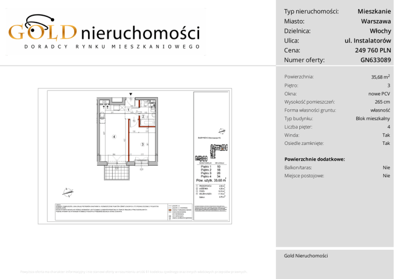 Typ nieruchomości: Mieszkanie Miasto: Warszawa Dzielnica: Włochy Ulica: ul. Instalatorów Cena: 249 760 PLN Numer oferty: Powierzchnia: Piętro: Okna: GN633089 35,68 m2 3 nowe PCV Wysokość pomieszczeń: 265 cm Forma własności gruntu: własność Typ budynku: Blok mieszkalny Liczba pięter: 4 Winda: Tak Osiedle zamknięte: Tak Powierzchnie dodatkowe: Balkon/taras: Nie Miejsce postojowe: Nie Gold Nieruchomości Powyższa oferta ma charakter informacyjny i nie stanowi oferty w rozumieniu art.66 $1 kodeksu cywilnego oraz innych właściwych przepsiów prawnych. Typ nieruchomości: Mieszkanie Miasto: Warszawa Dzielnica: Włochy Ulica: ul. Instalatorów Cena: 249 760 PLN Numer oferty: Powierzchnia: Piętro: Okna: GN633089 35,68 m2 3 nowe PCV Wysokość pomieszczeń: 265 cm Forma własności gruntu: własność Typ budynku: Blok mieszkalny Liczba pięter: 4 Winda: Tak Osiedle zamknięte: Tak Powierzchnie dodatkowe: Balkon/taras: Nie Miejsce postojowe: Nie Gold Nieruchomości Powyższa oferta ma charakter informacyjny i nie stanowi oferty w rozumieniu art.66 $1 kodeksu cywilnego oraz innych właściwych przepsiów prawnych. Typ nieruchomości: Mieszkanie Miasto: Warszawa Dzielnica: Włochy Ulica: ul. Instalatorów Cena: 249 760 PLN Numer oferty: Opis Powierzchnia: Piętro: GN633089 35,68 m2 3 Na obszarze ponad 8 hektarów, powstaje nowa przestrzeń mieszkalna wraz z infrastrukturą handlową i użytkową. Prezentowane osiedle to kolejna inwestycja mieszkaniowa, znajdująca się w szybko zmieniającej swój charakter warszawskiej dzielnicy Włochy, w sąsiedztwie Parku Szczęśliwickiego i Alei Krakowskiej. Okna: Rozpoczęcie prac budowlanych nastąpiło w kwietniu 2013 roku, inwestycja zakłada budowę około 2000 mieszkań, sieci ulic wewnętrznych wraz z małą architekturą. Planowany czas trwania inwestycji to 6 lat. Typ budynku: Blok mieszkalny Liczba pięter: 4 Oferta z rynku pierwotnego klient nie ponosi dodatkowych kosztów związanych z wynagrodzeniem pośrednika oraz PCC. nowe PCV Wysokość pomieszczeń: 265 cm Forma własności gruntu: własność Winda: Tak Osiedle zamknięte: Tak Powierzchnie dodatkowe: Balkon/taras: Nie Miejsce postojowe: Nie Gold Nieruchomości Powyższa oferta ma charakter informacyjny i nie stanowi oferty w rozumieniu art.66 $1 kodeksu cywilnego oraz innych właściwych przepsiów prawnych.