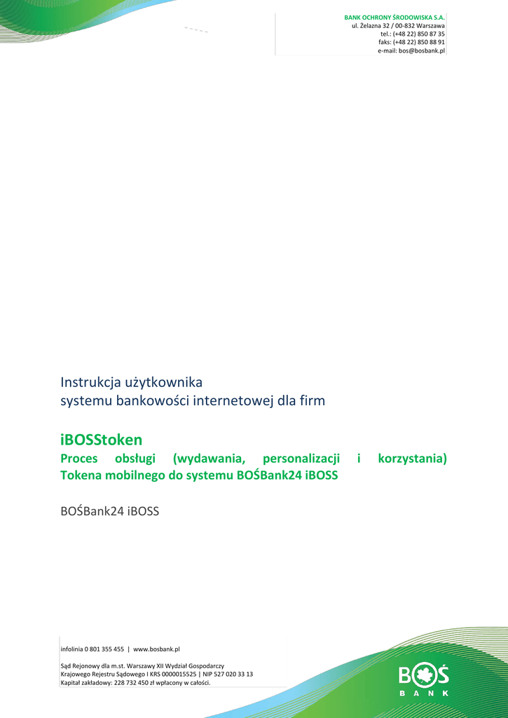 BANK OCHRONY ŚRODOWISKA S.A. ul. Żelazna 32 / 00-832 Warszawa tel.: (+48 22) 850 87 35 faks: (+48 22) 850 88 91 e-mail: [email protected] Instrukcja użytkownika systemu bankowości internetowej dla firm iBOSStoken Proces obsługi (wydawania, personalizacji Tokena mobilnego do systemu BOŚBank24 iBOSS BOŚBank24 iBOSS infolinia 0 801 355 455 | www.bosbank.pl Sąd Rejonowy dla m.st. Warszawy XII Wydział Gospodarczy Krajowego Rejestru Sądowego I KRS 0000015525 | NIP 527 020 33 13 Kapitał zakładowy: 228 732 450 zł wpłacony w całości. i korzystania) Spis treści I. Co to jest Token mobilny ............................................................................................................ 3 II. Ważne informacje przed instalacją Tokena mobilnego............................................................. 3 III. Instalacja iBOSStokena ............................................................................................................... 4 IV. Pobranie aplikacji ....................................................................................................................... 4 V. Personalizacja aplikacji ............................................................................................................... 5 VI. Korzystanie z iBOSStokena ......................................................................................................... 7 VII. Logowanie do BOŚBank24 iBOSS przy użyciu Tokena mobilnego. ........................................... 8 VIII. Autoryzacja dyspozycji przy użyciu Tokena mobilnego. ............................................................ 8 IX. Zmiana numeru PIN do iBOSStokena ....................................................................................... 10 X. Zmiana języka ........................................................................................................................... 11 XI. Informacja o iBOSStoken .......................................................................................................... 12 XII. Inne informacje ......................................................................................................................... 12 Instrukcja użytkownika systemu bankowości internetowej dla firm BOŚBank24 iBOSS Strona 2 I. Co to jest Token mobilny iBOSStoken / Token mobilny to aplikacja instalowana na urządzeniu mobilnym (np. telefonie komórkowym) generująca dane do logowania oraz autoryzacji w systemie BOŚBank24 iBOSS. Aplikacja jest udostępniana przez Bank Ochrony Środowiska S.A. iBOSStoken jest dostępny w wersjach dla systemów Android, iOS (iPhone), Windows Phone oraz telefonów wspierających technologię Java. Token mobilny działa w trybie off-line tzn. w trakcie generowania haseł nie łączy się z Internetem ani z systemem bankowym. Aplikacja nie przesyła smsów. Aplikacja wymaga połączenia z Internetem tylko w trzech przypadkach: 1. Podczas pobierania aplikacji. 2. Podczas instalacji aplikacji. 3. Podczas zmiany numeru PIN do aplikacji. II. Ważne informacje przed instalacją Tokena mobilnego 1. Należy sprawdzić, czy konfiguracja telefonu umożliwia dostęp do Internetu. W tym celu można skorzystać z opcji automatycznej konfiguracji telefonu komórkowego dostępnej na stronie internetowej operatora telefonii komórkowej. Aby dokonać automatycznej konfiguracji należy znać producenta i model posiadanego telefonu oraz nazwę operatora. Na stornach operatorów znajdują się linki dotyczące konfiguracji telefonów. Poniżej podajemy te adresy: Orange: http://ustaw.orange.pl/ Plus: http://www.plus.pl/indywidualna/Pomoc/KonfigurujTelefon/ Play: https://konfiguracja.play.pl/hsconfig/public/service.do T-Mobile: http://www.t-mobile.pl/konfigurator/web/ Wsparcie w zakresie pobrania, instalacji i obsługi Tokena mobilnego świadczą Konsultanci z Call Center BOŚ Banku pod numerem telefonu 801 355 455, +48 22 543 34 34. Instrukcja użytkownika systemu bankowości internetowej dla firm BOŚBank24 iBOSS Strona 3 III. Instalacja iBOSStokena Na telefon komórkowy podany w Banku jako numer do iBOSStokena zostaną przysłane dwa smsy: 1. SMS zawierający link z adresem strony, z której należy pobrać aplikację Tokena mobilnego. 2. SMS zawierający 16-cyfrowy kod personalizacyjny. UWAGA! Link oraz 16-cyfrowy kod personalizacyjny ważny jest przez 7 dni! IV. Pobranie aplikacji 1. Zapisz kod personalizacyjny jaki został przesłany w SMS. 2. Otwórz wiadomość z linkiem do pobrania aplikacji Tokena mobilnego. Kliknij na link lub w zależności od posiadanego modelu telefonu wybierz polecenie: Pobierz, Otwórz adres URL, Idź do itp. W tym momencie musisz mieć dostęp do Internetu aby pobrać aplikację z serwera bankowego lub ze sklepu. W przypadku wyświetlenia komunikatu ostrzegającego o potencjalnym zagrożeniu dotyczącym instalowania aplikacji z nieznanych źródeł należy potwierdzić dalszą chęć pobierania aplikacji. Jest to standardowe ostrzeżenie dotyczące pobierania danych z Internetu. Dla telefonów z systemem Android, Windows Phone oraz iOS aplikacji iBOSStoken może być pobrana bezpośrednio ze sklepów, w których dostępne są te aplikacje: Google Play > Android; Sklep Windows Phone > Windows Phone oraz AppStore > iOS. Instrukcja użytkownika systemu bankowości internetowej dla firm BOŚBank24 iBOSS Strona 4 V. Personalizacja aplikacji 1. Po pobraniu aplikacji zainstaluj ją wybierając kolejne polecenia wyświetlane na telefonie. Na tym etapie konieczny jest dostęp do Internetu. Po instalacji aplikacji pojawi się ekran personalizacyjny. W wyświetlone pola należy wprowadzić 16-cyfrowy kod personalizacyjny otrzymany w SMS. Następnie należy potwierdzić wprowadzenie kodu. 2. Na kolejnym ekranie zostaną wyświetlone pola, w których należy nadać numer PIN do Tokena mobilnego. PIN musi zawierać od 4 do 6 cyfr. Nadany numer PIN będzie wymagany każdorazowo przy uruchomieniu iBOSStokena. PIN powinien być na tyle skompl