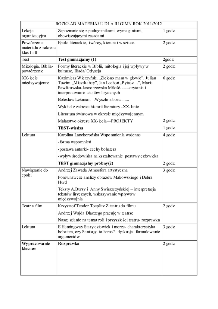 ROZKŁAD MATERIAŁU DLA III GIMN ROK 2011/2012 Lekcja organizacyjna Zapoznanie się z podręcznikami, wymaganiami, obowiązującymi zasadami 1 godz Powtórzenie Epoki literackie, twórcy, kierunki w sztuce. materiału z zakresu klas I i II 2 godz. Test Test gimnazjalny (1) 2godz. Mitologia, Bibliapowtórzenie Formy literackie w Biblii, mitologia i jej wpływy w kulturze, Iliada/ Odyseja 2 godz. XX- lecie międzywojenne Kazimierz Wierzyński „Zielono mam w głowie”, Julian Tuwim „Mieszkańcy”, Jan Lechoń „Pytasz....”, Maria Pawlikowska-Jasnorzewska Miłość------czytanie i interpretowanie tekstów lirycznych 6 godz. Bolesław Leśmian ..Wyszło z boru........ Wykład z zakresu historii literatury -XX- lecie Literatura światowa w okresie międzywojennym Lektura Malarstwo okresu XX- lecia—PROJEKTY 2 godz. TEST-wiedza 1 godz. Karolina Lanckorońska Wspomnienia wojenne 4 godz. -forma wspomnień -postawa autorki- cechy bohatera -wpływ środowiska na kształtowanie postawy człowieka Nawiązanie do epoki TEST gimnazjalny próbny(2) 2 godz. Andrzej Zawada Atmosfera artystyczna 3 godz. Porównawcze analizy obrazów Makowskiego i Debra Hurd Teksty A.Bursy i Anny Świrszczyńskiej – interpretacja tekstów lirycznych, wskazywanie wpływów międzywojnia Teatr a film Krzysztof Teodor Toeplitz Z teatru do filmu 2 godz Andrzej Wajda Dlaczego pracuję w teatrze Nasze zdanie na temat roli i przyszłości teatru- rozprawka Lektura E.Hemingway Stary człowiek i morze- charakterystyka 3 godz. bohatera, czy Santiago to heros?- dyskusja- formułowanie argumentów Wypracowanie klasowe Rozprawka 2 godz ROZKŁAD MATERIAŁU DLA III GIMN ROK 2011/2012 Okres 1939-1945 Wykład z historii literatury 2 godz. Tło historyczne- projekty- historia okresu 1939-1945 w mojej rodzinie. 1 godz. Teksty liryczne : Ojczyzna wzywa nas do boju A.Trzebiński Kolęda katyńska Kazimiera Lektura Iłłakowiczówna 2 godz. TEST- wiedza 1 godz. Melchior Wańkowicz Ziele na kraterze -fabularyzacja biografii -charakterystyka postaci -charakterystyka środowiska Test -charakterystyka języka 5 godz. TEST gimnazjalny(3) 2 godz. Okres 1939-1945- Arkady Fiedler Dywizjon 303 fragment- literatura faktu, II część funkcje propagandowe Władysław Szlengel Kartka z dziennika „Akcji”- rodzaje podmiotu lirycznego Lektura Krzysztof Baczyński – teksty liryczne/ spoza podręcznika 4 godz. Aleksander Kamiński Kamienie na szaniec 3 godz. - literatura faktu, -metaforyka i źródło tytułu, -prawda czy propaganda- dyskusja -odtwarzanie planu miasta- wydarzenia pod Arsenałem Nawiązania do epoki Tadeusz Różewicz – teksty liryczne/spoza podręcznika/ 2 godz. Tadeusz Kantor- twórczość Zbigniew Herbert – teksty liryczne- / spoza podręcznika Lektura Miron Białoszewski Pamiętnik z powstania warszawskiego- 5 godz. -narracja -stosunek narratora do wydarzeń- dyskusja -odtworzenie trasy kanałowej Sprawdzamy się Wypracowanie klasowe- rozprawka z elementami charakte rystyki postaci i środowiska 2 godz. ROZKŁAD MATERIAŁU DLA III GIMN ROK 2011/2012 Radio czy telewizja Chłopcy Murrowa. Na frontach wojny i dziennikarstwafragmenty 4 godz Piotr Muldner-Nieckowski Specyfika radia i telewizji fr. Słownictwo związane z specyfiką twórczości tv i radiowej Projekt – słuchowisko radiowe – Test Test gimnazjalny(4) 2 godz Lektura E.Orwell Folwark zwierzęcy 3 godz./4 godz. -fantastyka polityczna -co się stało z rewolucją, czy mogło się udać?- argumenty, dyskusja Współczesność Socrealizm- wykład okres od 1945 do 1956 Europa Zachodnia- żelazna kurtyna Poezja współczesna Teksty- Świrszczyńskiej, Herberta, Różewicza, Krynickiego, Miłosz, Stachury, Szymborskiej itp./ spoza podręcznika. 3 godz. Literatura amerykańska 3 godz. Środki poetyckie- powtórzenie Lektura Saint Exupery Nocny lot 3 godz. - realizm opisów, -męska przygoda, -typ bohater Test Test gimnazjalny (5) 2 godz. Współczesność Czasy od 1956- wykład 6 godz. Malarstwo Nowosielskiego, Beksińskiego, Abakanowicz, Dwurnika, ................. Isac Bashevis Singer Wieczór chanukowy w moim rodzinnym domu kultura żydowska stosunek autora/narratora do rodziny Gabriel Gacia Marquez Miłość w czasach zarazyfragment Czesław Miłosz Który skrzywdziłeś Zbigniew Hebert Nike która się waha Sławomir Mrożek Wesele w Atomicach -absurd jako narzędzie krytyki Liryka ROZKŁAD MATERIAŁU DLA III GIMN ROK 2011/2012 Test Test z zakresu historii lit. ws półczesnej 1 godz. Lektura S.Mrożek Tango- analiza i interpretacja dramatu 3 godz. -metaforyczność tekstu -absurd jako narzędzie -didaskalia Test Test gimnazjalny (6) 2 godz. Prasa a internet Właściwości komunikacji internetowej i prasowej 4 godz. Rola nadawców i odbiorców Blog jako zjawisko kulturowe Tabloidy Internet-dobrze czy źle-rozprawka Reklama Siła reklamy,narzędzia reklamy,rodzaje reklamy projekty 2 godz. Lektura S.Lem Solaris- 3 godz. cechy literatury s.n.f. wizja przyszłości dylematy moralne bohatera Powtórzenie Powtórzenie wiadomości z zakresu historii literatury( trzy 2 godz. lata) Test Test z zakresu trzech lat nauki Lektura Ryszard Kapuściński Imperium – dyskusje wokół tekstu 2 godz. Nauka o języku Powtórzenie Formy tekstów Fleksja 4 godz. Słowotwórstwo 4 godz. Fonetyka 3 godz. Składania- zd, pojedyncze, zd. Złożone 5 godz. TESTY 2 godz ROZKŁAD MATERIAŁU DLA III GIMN ROK 2011/2012 Kompozycja List motywacyjny, cv., podanie. E0mail- jako współczesna forma wypowiedzi sms- obowiązująca etykieta post internetowy blog czat 7 godz.