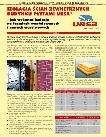 Rozegnij środkową zszywkę, wyjmij wkładkę i włóż do segregatora IZOLACJA ŚCIAN ZEWNĘTRZNYCH BUDYNKU PŁYTAMI URSA® – jak wykonać izolację na fasadach wentylowanych i murach warstwowych www.ursa.pl Efektowne fasady szklane, aluminiowe i kamienne stwarzają niezwykłe możliwości architektoniczne, zachwycając zwłaszcza ogromem i kolorystyką. Pod tak estetyczną osłoną ważną funkcję spełnia izolacja z wełny mineralnej. W wielu przypadkach są to płyty z mineralnej wełny szklanej URSA ®. Płyty izolacyjne URSA®KDP1/ V, URSA®KDP2/ V „Szczelny mur” – wyróżnione nagrodą „PRODUKT PRZYJAZNY ARCHITEKTURZE 2002” – przeznaczone są do izolacji cieplnej i akustycznej: ! fasad wentylowanych pod okładziny z aluminium, kamienia, szkła, sidingu; ! murów warstwowych bez lub ze szczeliną powietrzną. Należy zaznaczyć, że powłoka z welonu nie wpływa zasadniczo na paroprzepuszczalność całej płyty i w żadnym przypadku nie może być traktowana jaka paroizolacja. Jeżeli inwestorowi zależy na ciemnym kolorze powłoki z welonu (przy ciemnej fasadzie kamiennej w szczelinach nie może być widoczny żółty kolor wełny), to proponujemy analogiczne płyty fasadowe URSA ® FDP 1/V, URSA ® FDP 2/V. Na zamówieniu wystarczy podać czarny kolor powłoki z welonu. Płyty URSA ® KDP 1/ V, URSA® KDP 2/V można dostarczać w pakietach typu JUMBO lub opakowaniach luzem. Przy wyborze opakowań JUMBO w pakiecie mieści się więcej wełny szklanej, a materiał zabezpieczony jest dodatkowo przed wpływem warunków atmosferycznych, zanieczyszczeniami i uszkodzeniami mechanicznymi. Wymiary i ilość w opakowaniu Grubość (mm) Zewnętrzną cechą charakterystyczną tych płyt jest jasnożółta lub czarna powłoka z welonu szklanego, która jednostronnie osłania i usztywnia materiał izolacyjny, służąc jednocześnie w fasadach wentylowanych jako wiatroizolacja. Praktyczną funkcją powłoki z welonu jest zabezpieczenie włókien przed ewentualnym wywiewaniem. Problem ten jest szczególnie istotny w budynkach wysokich, przy których szczelina pod fasadą jest swego rodzaju kominem ciągu powietrza. Jako produkt z wełny mineralnej szklanej płyty URSA®KDP1/V oraz URSA®KDP2/V posiadają następujące zalety: ! są materiałem niepalnym, ! cechują się dobrą izolacyjnością cieplną i wysoką paroprzepuszczalnością, ! ich włókna szklane – poddane hydrofobizacji w procesie produkcyjnym – bardziej uodparniają materiał na wilgoć, ! dobrze dopasowują się do nierówności podłoża – praktycznie nie trzeba wyrównywać podłoża, ! są odporne na czynniki chemiczne i wpływ promieniowania UV, ! są lekkie, dzięki czemu łatwe w montażu, ! ich przycinanie nie stanowi problemu. Szerokość (mm) Długość (mm) Pakiet JUMBO (m2) 40 600 1250 18,00 50 600 1250 15,00 60 600 1250 12,00 80 600 1250 9,00 100 600 1250 7,50 120 600 1250 6,00 140 600 1250 4,50 Charakterystyka techniczna produktów Nazwa produktu URSA® KDP1/V URSA® KDP2/ V Współczynnik przewodzenia ciepła λ (W / mK) 0,037 0,035 Opór cieplny (m2 K / W) 1,08– 3,78 1,14– 3,43 Znamionowy opór dyfuzji pary wodnej µ ~1 ~1 Względny opór przepływu powietrza hg k Pas/ m2 >5 >5 ABC budowania 3 (21) 2004 IZOLACJA FASAD WENTYLOWANYCH Ważną rolą płyt z wełny mineralnej URSA® pod fasadami wentylowanymi jest izolowanie obiektu przed hałasem ulicy. Wiele budynków z fasadami jest położonych w sąsiedztwie ruchliwych tras komunikacyjnych, przy których pomierzony poziom hałasu dziennego na zewnątrz budynku sięga nieraz 71 dB. Zastosowanie płyt z wełny URSA ® o grubości 12 cm poprawia izolacyjność ścian zewnętrznych budynków o 2–4 dB. Wyczuwalne ograniczenie poziomu hałasu możliwe jest dzięki strukturze wełny mineralnej z włókien szklanych URSA® – cienkie, sprężyste włókna ułożone są równolegle do powierzchni ściany, a niewielka sztywność takiej płyty sprawia, że ma ona lepsze właściwości akustyczne niż płyty sztywne. Płyty z mineralnej wełny szklanej (alternatywnie) URSA ®FDP 1/V, FDP 2/V „Energooszczędny mur” URSA ®KDP 1/V, KDP 2/V „Szczelny mur” URSA ®KDP 1 „Super panel” PRZYKŁAD ZASTOSOWANIA. Detale przekrojów ściany z zastosowaniem płyt izolacyjnych: URSA ® FDP 1/V, FDP 2/V „Energooszczędny mur”, URSA ® KDP 1/V, KDP 2/V „Szczelny mur”, URSA ®KDP 1 „Super panel”, (alternatywnie). Wartości współczynnika przenikania ciepła U dla fasady wentylowanej URSA ® URSA®KDP 1/V Rozmieszczenie łączników mechanicznych mocujących płyty URSA® KDP (FDP) na ścianach nośnych fasad wentylowanych. Dla ściany betonowej a ≥ 5 cm. Dla ściany murowanej a ≥ 10 cm. Wartości współczynnika przenikania ciepła U W/ (m2 · K) Grubość [mm] 60 Do mocowania płyt URSA ® KDP (FDP) należy stosować łączniki mechaniczne dopuszczone do stosowania na rynku polskim. Mogą one być wbijane lub wkręcane i posiadać plastikowy kołnierz dociskowy o minimalnej średnicy Φ 60 mm. Na krawędziach fasady stosuje się dodatkowe łączniki, a prostopadłe płyty zachodzą na siebie metodą „na wiązanie”. 0,54 URSA® KDP 2/V Grubość [mm] 60 Wartości współczynnika przenikania ciepła U W/ (m2 · K) 0,48 80 0,42 80 0,38 100 0,35 100 0,31 120 0,30 120 0,26 140 0,26 140 0,23 Do obliczeń przyjęto następujące warstwy ścian: tynk wewnętrzny grubość 10 mm, żelbet 200 mm, wełna URSA ®KDP 1/V (KDP 2/V Wyniki przeprowadzonych w Niemczech badań izolacyjności akustycznej ścian zewnętrznych budynków fasadowych Okładzina fasadowa Materiał Wełna mineralna 24 cm pustak 20 cm beton komórkowy Wskaźnik oceny izolacyjności części pełnej ściany RA2 (dB) Format 6 cm Płyta z kompozytu żywicznego 6 mm 2500 × 1100 • Płyta aluminiowa 4 mm 2513 × 1120 Płyta aluminiowa 4 mm 2513 × 1120 • • 62 Płyty ceramiczne 8 mm 592 × 592 • • 60 Płyty ceramiczne 8 mm 592 × 592 • • 63 2500 × 1110 • Płyt