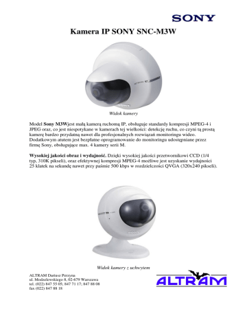 Kamera IP SONY SNC-M3W Widok kamery Model Sony M3Wjest mał kamer ruchom IP, obsługuje standardy kompresji MPEG-4 i JPEG oraz, co jest niespotykane w kamerach tej wielko ci: detekcj ruchu, co czyni t prost kamer bardzo przydatn nawet dla profesjonalnych rozwi za monitoringu wideo. Dodatkowym atutem jest bezpłatne oprogramowanie do monitoringu udost pniane przez firm Sony, obsługuj ce max. 4 kamery serii M. Wysokiej jako ci obraz i wydajno . Dzi ki wysokiej jako ci przetwornikowi CCD (1/4 typ, 310K pikseli), oraz efektywnej kompresji MPEG-4 mo liwe jest uzyskanie wydajno ci 25 klatek na sekund nawet przy pa mie 500 kbps w rozdzielczo ci QVGA (320x240 pikseli). Widok kamery z uchwytem ALTRAM Dariusz Perzyna ul. Modzelewskiego 8, 02-679 Warszawa tel. (022) 847 55 05; 847 71 17; 847 88 08 fax (022) 847 88 18 Sterowanie Pan-Tilt. Serwomechanizm zapewnia kamerze M3W poziomy zasi g do 120°, pionowy do 70°. Dwukierunkowa transmisja audio. Dzi ki dwukierunkowej transmisji audio wyposa ona w zł cze wej ciowe na mikrofon kamera mo e monitorowa obiekt tak e akustycznie. Kamera posiada tak e wyj cie audio na gło niki aktywne, dzi ki czemu operator mo e przekazywa do monitorowanego obiektu komunikaty głosowe, ostrze enia itp. Widok zł cz kamery Funkcje alarmowe. Kamera M3Wposiada wbudowan funkcj detekcji ruchu, przy podł czonym mikrofonie tak e d wi ków. Dane rejestrowane s przesyłane na serwer FTP, lub do bezpłatnej aplikacji zarz dzaj cej Network Camera Recorder Sony. Nieruchome obrazy mog by wysyłane tak e na zdefiniowany adres e-mail (3 obrazy w formacie JPEG). Parametry SNC-M3 Kamera Przetwornik Obrazu Efektywna ilo pikseli Elektroniczna migawka Ogniskowa Obiektywu F Minimalna odległo Detekcja ruchu K t patrzenia Typ soczewki Zasi g Pan Zasi g Tilt ALTRAM Dariusz Perzyna ul. Modzelewskiego 8, 02-679 Warszawa tel. (022) 847 55 05; 847 71 17; 847 88 08 fax (022) 847 88 18 1/4 typu CMOS 652 x 482 1/50 do 1/100 000 s f =3.7 mm 1.0 80 cm Tak 51°0’ (H) 38°9’ (V) Fixed focal lens +60° do -60° +10° do -60° Obraz Rozdzielczo obrazu Rodzaj kompresji Maksymalna liczba klatek na sekunde Audio Rodzaj kompresji Parametry sieciowe Protokół Interfejs Ethernet Wej cie na mikrofon Wyj cie audio (line) WLAN Standard Pr dko transmisji Security Parametry podstawowe Temperatura pracy Temperatura przechowywania Wilgotno pracy Wilgotno przechowywania Zasilanie Pobór mocy Masa Rozmiary Akcesoria Wymagania systemowe System operacyjny Procesor Pami Przegl darka ALTRAM Dariusz Perzyna ul. Modzelewskiego 8, 02-679 Warszawa tel. (022) 847 55 05; 847 71 17; 847 88 08 fax (022) 847 88 18 640 x 480, 320 x 240, 160 x 120 MPEG-4/JPEG (MPEG-4 mode) Max. 30 fps (320 x 240) (JPEG mode) Max. 30 fps (320 x 240) G.726 (40, 32, 24, 16 Kbps) TCP/IP, ARP, ICMP, DHCP, DNS, HTTP, FTP, SMTP, NTP 100Base-TX/10Base-T (RJ-45) Mini-jack, 2.4 V DC plug-in power, 4.7 k Mini-jack IEEE802.11b (2.4 GHz) 11Mbps/5.5Mbps/2Mbps/1Mbps (Auto Switch) WEP (64/128 bits) 0 °C do 40 °C -20 °C do 60 °C 20 do 80% 20 do 95% DC 5 V 7,7 W 390 g 110 x 104 mm Płyta CD-ROM, przewody, instrukcja Microsoft® Windows® 2000/XP Intel® Pentium® III, 1 GHz lub lepszy (Rekomendowany: Pentium IV, 2GHz lub lepszy) 256 MB RAM minimum Microsoft Internet Explorer® version 5.5 or 6.0
