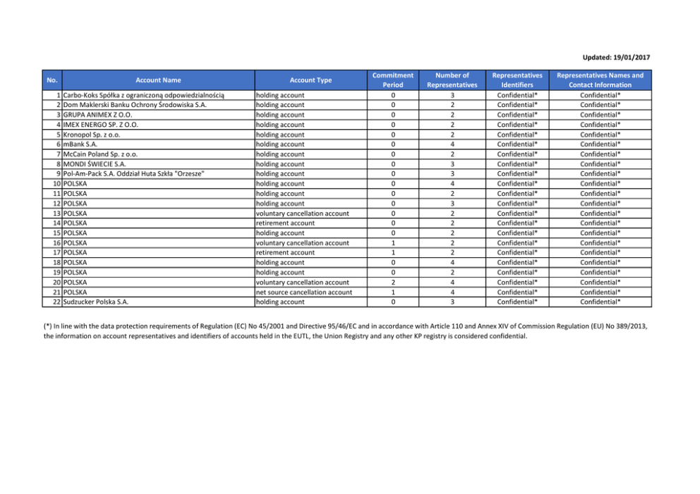 Updated: 19/01/2017 No. 1 2 3 4 5 6 7 8 9 10 11 12 13 14 15 16 17 18 19 20 21 22 Account Name Carbo-Koks Spółka z ograniczoną odpowiedzialnością Dom Maklerski Banku Ochrony Środowiska S.A. GRUPA ANIMEX Z O.O. IMEX ENERGO SP. Z O.O. Kronopol Sp. z o.o. mBank S.A. McCain Poland Sp. z o.o. MONDI ŚWIECIE S.A. Pol-Am-Pack S.A. Oddział Huta Szkła "Orzesze" POLSKA POLSKA POLSKA POLSKA POLSKA POLSKA POLSKA POLSKA POLSKA POLSKA POLSKA POLSKA Sudzucker Polska S.A. Account Type holding account holding account holding account holding account holding account holding account holding account holding account holding account holding account holding account holding account voluntary cancellation account retirement account holding account voluntary cancellation account retirement account holding account holding account voluntary cancellation account net source cancellation account holding account Commitment Period 0 0 0 0 0 0 0 0 0 0 0 0 0 0 0 1 1 0 0 2 1 0 Number of Representatives 3 2 2 2 2 4 2 3 3 4 2 3 2 2 2 2 2 4 2 4 4 3 Representatives Identifiers Confidential* Confidential* Confidential* Confidential* Confidential* Confidential* Confidential* Confidential* Confidential* Confidential* Confidential* Confidential* Confidential* Confidential* Confidential* Confidential* Confidential* Confidential* Confidential* Confidential* Confidential* Confidential* Representatives Names and Contact Information Confidential* Confidential* Confidential* Confidential* Confidential* Confidential* Confidential* Confidential* Confidential* Confidential* Confidential* Confidential* Confidential* Confidential* Confidential* Confidential* Confidential* Confidential* Confidential* Confidential* Confidential* Confidential* (*) In line with the data protection requirements of Regulation (EC) No 45/2001 and Directive 95/46/EC and in accordance with Article 110 and Annex XIV of Commission Regulation (EU) No 389/2013, the information on account representatives and identifiers of accounts held in the EUTL, the Union Registry and any other KP registry is considered confidential.