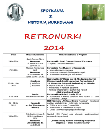 SPOTKANIA Z HISTORIĄ NURKOWANI Data 24.04.2014 17.05.2014 Miejsce Spotkania Santi Concept Store Warszawa ul. Belwederska 19 godz.19.00 Muzeum Nurkowania WKP Warszawa ul.Grzybowska 88 godz. 19.00 – 24.00 30.05 - 1.06. 2014 Czaplinek j. Kaleńskie j. Krzemno 8.06.2014 Łomża Port Łomża na Narwi 21 - 23.06. 2014 30.06.2014 Neustadt an der Weinstrasse Niemcy Sala Konferencyjna & Biblioteka Główna PTTK Warszawa ul.Senatorska 11 godz.19.00 Nazwa Spotkania / Program Retronurki z Santi Concept Store - Warszawa Wykład z historii nurkowania Europejska Noc Muzeów w Warszawie Nowa ekspozycja muzealna Pokazy archiwalnych filmów podwodnych Stanowisko informacyjne HDS Poland Retronurki z KP Mares na 42. Międzynarodowych Mistrzostwach Polski Łowiectwa Podwodnego i 14. Memoriale Fotografii Podwodnej im J.Macke Wykład z historii nurkowania Nurkowania w hełmach otwartych Konkurs fotograficzny o puchar HDS Poland „Retronurek pod wodą” Retronurki na Dniach Łomży 2014 Nurkowanie w hełmie otwartym HDS Poland z CNN „Krokodyle” Olsztyn HDS Germany „Vintage Divers Meeting” – Spotkanie nurków, kolekcjonerów i historyków nurkowania Wykłady historyczne (j. angielski) Nurkowanie w zabytkowym sprzęcie Giełda zabytkowego sprzętu nurkowego Wykład HDS Poland oraz wystawy fotogramów nt : otwarcie okolicznościowej „90 lat Służby Nurków w Polskiej Marynarce Wojennej – okres międzywojenny” 1 4 - 6.07 2014 Anastazewo j. Powidz 12.07.2014 Cerkiewnik k/Olsztyna j. Limajno 12 - 17.08 2014 Hel Zat. Pucka 23 - 24.08. 2014 Jaworzno Szczakowa Zbiornik „Koparki” 30.08.2014 6 - 7.09. 2014 Piechcin k/Inowrocławia Olsztyn j. Ukiel (Krzywe) 10 - 12.09. 2014 Borne Sulinowo j. Pile 13.09.2014 Ińsko j. Ińsko 25.10.2014 22 – 23 .11 2014 Kraków Akademia Górniczo-Hutnicza Poole Wielka Brytania Środy Terminy spotkań www.muzeumnurkowania.pl Warszawa, ul. Grzybowska 88 Retronurki ze Strażakami PSP i OSP Piotrków Tryb. Wykłady z historii nurkowani Nurkowania w zabytkowym sprzęcie Retronurki z AKP „Skorpena” Olsztyn Wykłady z historii nurkowania Nurkowania w hełmach otwartych Retronurki z pokładu „Nurek – Hel” Wykłady z historii nurkowania Nurkowania w hełmach otwartych Retronurki z CN Orka Bielsko-Biała Wykłady z historii nurkowania Nurkowania w hełmie otwartym Retronurki nad Zbiornikiem „Piechcin” Wykłady z historii nurkowania Nurkowania w zabytkowym sprzęcie nurkowym Retronurki z CNN „Krokodyle” Wykłady z historii nurkowania Nurkowania w hełmach otwartych Retronurki ze Strażakami i nie tylko Wręczenie Nagrody HDS Poland na Euroregionalnych Mistrzostwach Strażaków Płetwonurków Wykłady z historii nurkowania Nurkowania w hełmie otwartym Retronurki na „Spotkaniu Ekologicznym Płetwonurków 2014” KP Mares - Koszalin Wykłady z historii nurkowania Nurkowania w hełmie otwartym Spotkanie historyczne w AKP Krab Wykłady z historii nurkowania Międzynarodowa Konferencja Historyczna HDS UK Wykłady z historii nurkowania (w j. angielskim) Uroczyste spotkanie wieczorne Środy z Historią Nurkowania w Muzeum Nurkowania Wykłady z historii nurkowania Pokazy archiwalnych filmów podwodnych Zwiedzanie ekspozycji w muzeum Uwaga: Przedstawiony kalendarz nie jest kompletny – w przygotowaniu są dodatkowe imprezy takie, jak jesienne spotkanie historyczne w Marynarce Wojennej oraz Zakopanem. Wszystkie imprezy organizowane przez HDS Poland i organizowane wspólnie z klubami płetwonurków i centrami nurkowymi są spotkaniami otwartymi i dostępnymi dla wszystkich chętnych. Osoby zainteresowane uczestnictwem w „Retronurkach” lub w imprezach zagranicznych otrzymają dodatkowe szczegółowe informacje kontaktując się z [email protected]. 2