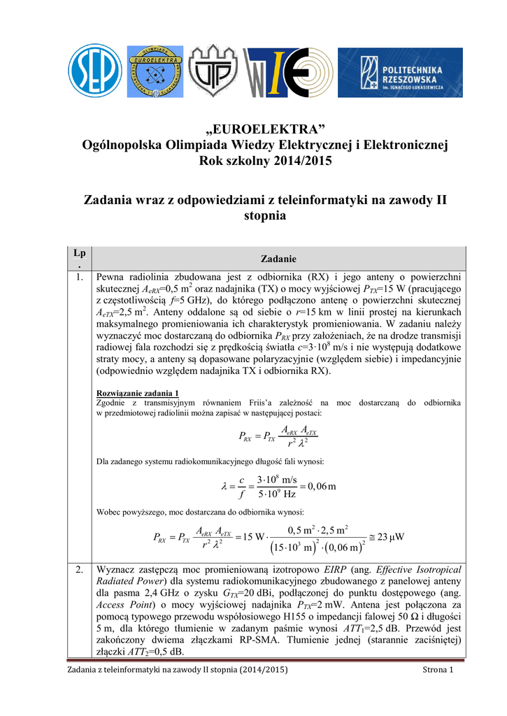 „EUROELEKTRA” Ogólnopolska Olimpiada Wiedzy Elektrycznej i Elektronicznej Rok szkolny 2014/2015 Zadania wraz z odpowiedziami z teleinformatyki na zawody II stopnia Lp . 1. Zadanie Pewna radiolinia zbudowana jest z odbiornika (RX) i jego anteny o powierzchni skutecznej AeRX=0,5 m2 oraz nadajnika (TX) o mocy wyjściowej PTX=15 W (pracującego z częstotliwością f=5 GHz), do którego podłączono antenę o powierzchni skutecznej AeTX=2,5 m2. Anteny oddalone są od siebie o r=15 km w linii prostej na kierunkach maksymalnego promieniowania ich charakterystyk promieniowania. W zadaniu należy wyznaczyć moc dostarczaną do odbiornika PRX przy założeniach, że na drodze transmisji radiowej fala rozchodzi się z prędkością światła c=3·108 m/s i nie występują dodatkowe straty mocy, a anteny są dopasowane polaryzacyjnie (względem siebie) i impedancyjnie (odpowiednio względem nadajnika TX i odbiornika RX). Rozwiązanie zadania 1 Zgodnie z transmisyjnym równaniem Friis’a zależność na moc dostarczaną do odbiornika w przedmiotowej radiolinii można zapisać w następującej postaci: PRX PTX AeRX AeTX r2 2 Dla zadanego systemu radiokomunikacyjnego długość fali wynosi: c 3 108 m/s 0, 06 m f 5 109 Hz Wobec powyższego, moc dostarczana do odbiornika wynosi: PRX PTX 2. AeRX AeTX 0,5 m 2 2,5 m 2 15 W 23 μW 2 2 3 r2 2 15 10 m 0, 06 m Wyznacz zastępczą moc promieniowaną izotropowo EIRP (ang. Effective Isotropical Radiated Power) dla systemu radiokomunikacyjnego zbudowanego z panelowej anteny dla pasma 2,4 GHz o zysku GTX=20 dBi, podłączonej do punktu dostępowego (ang. Access Point) o mocy wyjściowej nadajnika PTX=2 mW. Antena jest połączona za pomocą typowego przewodu współosiowego H155 o impedancji falowej 50 Ω i długości 5 m, dla którego tłumienie w zadanym paśmie wynosi ATT1=2,5 dB. Przewód jest zakończony dwiema złączkami RP-SMA. Tłumienie jednej (starannie zaciśniętej) złączki ATT2=0,5 dB. Zadania z teleinformatyki na zawody II stopnia (2014/2015) Strona 1 Określ również, czy tak wykonana instalacja systemu radiokomunikacyjnego jest zgodna z Rozporządzeniem Ministra Transportu z dnia 3 lipca 2007 r. w sprawie urządzeń radiowych nadawczych lub nadawczo-odbiorczych, które mogą być używane bez pozwolenia radiowego (Dz. U. 2007 nr 138 poz. 972 z późniejszymi zmianami). W przedmiotowym akcie prawnym zakłada się, że maksymalna moc promieniowana izotropowo dla zadanych urządzeń pracujących w paśmie 2400,0-2483,5 MHz nie może przekraczać 100 mW. Rozwiązanie zadania 2 Dla zadanego systemu radiokomunikacyjnego bilans energetyczny (w skali logarytmicznej) można zapisać jako: EIRP= PTX + GTX - ATT1 - 2·ATT2 Rozwiązanie pierwszej części zadania przyjmuje następującą postać: EIRP = 10log(2 mW / 1 mW) dBm + 20 dBi - 2,5 dB - 2·0,5 dB = = 3 dBm + 20 dBi - 2,5 dB - 1 dB = = 19,5 dBm = 1019,5 dBm/10 mW 89 mW Z rozwiązania pierwszej części wynika, że otrzymana wartość mocy promieniowanej izotropowo jest zgodna z obowiązującym prawem, ponieważ 89 mW < 100 mW. 3. Dokonaj podziału pewnej sieci IPv4 o adresie 152.10.0.0 z maską 255.255.0.0 na cztery podsieci, podając w wyniku: adres i maskę, zakres adresów urządzeń oraz adres rozgłoszeniowy każdej z podsieci w formie binarnej i dziesiętnej. Objaśnij tok rozumowania. Rozwiązanie zadania 3 Adres binarny sieci i jej maska mają postać odpowiednio: 10011000.00001010.00000000.00000000 oraz 11111111.11111111.00000000.00000000. Z części adresu przeznaczonego na urządzenia dwa pierwsze bity przeznaczamy na sieć (w zadaniu nie zdefiniowano liczby urządzeń w każdej z podsieci, więc można przyjąć maksymalną dostępną). Nie definiuje się także konieczności zastosowania różnych masek więc można rozszerzyć maskę i zastosować różne adresy podsieci. Jeśli z części przeznaczonej na adres urządzenia wydzielimy dwa bity, będzie można zdefiniować cztery nowe podsieci. Konieczne jest również rozszerzenie maski o dwa bity. Po podziale otrzymujemy zatem: Podsieć 1 Adres Maska Adres rozgłoszeniowy Zakres adresów B 10011000.00001010.00000000.00000000 11111111.11111111.11000000.00000000 10011000.00001010.00111111.11111111 10011000.00001010.00000000.00000001 10011000.00001010.00111111.11111110 D 152.10.0.0 255.255.192.0 152.10.63.255 152.10.0.1 – 152.10.63.254 Podsieć 2 Adres Maska Adres rozgłoszeniowy Zakres adresów B 10011000.00001010.01000000.00000000 11111111.11111111.11000000.00000000 10011000.00001010.01111111.11111111 10011000.00001010.01000000.00000001 10011000.00001010.01111111.11111110 D 152.10.64.0 255.255.192.0 152.10.127.255 152.10.64.1 – 152.10.127.254 Podsieć 3 Adres Maska Adres rozgłoszeniowy Zakres adresów B 10011000.00001010.10000000.00000000 11111111.11111111.11000000.00000000 10011000.00001010.10111111.11111111 10011000.00001010.10000000.00000001 10011000.00001010.10111111.11111110 D 152.10.128.0 255.255.192.0 152.10.191.255 152.10.128.1 – 152.10.191.254 Zadania z teleinformatyki na zawody II stopnia (2014/2015) Strona 2 Podsieć 4 Adres Maska Adres rozgłoszeniowy Zakres adresów 4. B 10011000.00001010.11000000.00000000 11111111.11111111.11000000.00000000 10011000.00001010.11111111.11111111 10011000.00001010.11000000.00000001 10011000.00001010.11111111.11111110 D 152.10.192.0 255.255.192.0 152.10.255.255 152.10.192.1 – 152.10.255.254 Pewna firma postanowiła zbudować własną sieć LAN. W ramach przewidzianego przez administratora zakresu prywatnych adresów IP wydzielono cztery podsieci (jak na rysunku). Niestety, po konfiguracji i uruchomieniu sieci okazało się, że nie działa ona prawidłowo. Wskaż błędy w konfiguracji sieci i zaproponuj sposób ich naprawienia oraz określ zakres adresów IP wybranych do podziału tej sieci na cztery podsieci. Router Przełącznik 50 Urządzeń 192.168.10.240/28 Przełącznik 50 Urządzeń 192.168.10.128/25 Przełącznik 50 Urządzeń 162.198.10.64/26 Przełącznik 50 Urządze