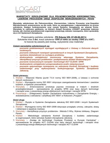 WARSZTATY SZKOLENIOWE DLA PEŁNOMOCNIKÓW, KIEROWNICTWA, LIDERÓW PROCESÓW ORAZ ZESPOŁÓW WDROŻENIOWYCH - PDVIII Warsztaty szkoleniowe dla Pełnomocników, Kierownictwa, Liderów Procesów oraz Zespołów Wdrożeniowych przeznaczone są dla osób, które są zaangażowane i odpowiedzialne za proces wdrożenia, bieżące funkcjonowanie oraz rozwój Systemu Zarządzania we własnej firmie. Warsztaty to cykliczne spotkania, na których Zespół Doradczy LOGART prezentuje wybrane tematy, jak również przedstawiciele organizacji prezentują ciekawe rozwiązania, które sprawdziły się w ich Systemach Zarządzania. Proponujemy państwu szkolenie - PD Edycja VIII: 07-09.06.2011r Szkolenie trwa 3 dni, koszt szkolenia 1500 zł netto za osobę (1845 zł z VAT) /w kwocie tej zawarty jest nocleg, wyżywienie oraz materiały/ Celami warsztatów szkoleniowych są: − poznanie podstawowych wymagań wynikających z Ustawy o Ochronie danych osobowych, − poznanie ciekawych rozwiązań sprawdzonych w innych Systemach Zarządzania, − wymiana doświadczeń na nurtujące problemy, − doskonalenie umiejętności samooceny własnego Systemu Zarządzania, identyfikacji przyczyn problemów i podejmowania działań doskonalących − poznanie nowoczesnych narzędzi i technologii ACT CLEAN i SPIN − doskonalenie umiejętności przeprowadzania analiz statystycznych − poznanie optymalnego rozwiązania na wdrożenie Kontroli Zarządczej i budżetu zadaniowego przy wykorzystaniu funkcjonującego Systemu Zarządzania Jakością. Dzień pierwszy. 1. Wykład – Własność Klienta (punkt 7.5.4 normy ISO 9001:2008), a Ustawa o ochronie danych osobowych. 2. Wykład – Wymagania normy ISO 9001 dotyczące zaangażowania kierownictwa i zasobów ludzkich, a lojalność pracowników. 3. Warsztaty – Zrównoważona produkcja poprzez innowacje w małych i średnich przedsiębiorstwach - wprowadzenie do projektu SPIN oraz bazy danych technologii i narzędzi wraz z prezentacją energo-efektywnych technologii i narzędzi SPIN. 4. Prezentacja – Zintegrowany System Zarządzania rozbudowany o Zarządzanie Energią – doświadczenia z wdrożenia i certyfikacji EN 16001 w Koksowni „Przyjaźń”. Dzień drugi. 1. Wykład – Ryzyko w Systemie Zarządzania Jakością ISO 9001:2008 i innych Systemach Zarządzania. 2. Wykład – Wymagania normy ISO 9001:2008 dotyczące przeglądu umowy, zakupów, skarg i reklamacji w aspekcie mediacji. 3. Warsztaty – Identyfikacja przyczyn problemów - Metoda 5 Why, Wykres Ishikawy, Diagram Pareto. 4. Wykład – Metodologia wdrażania Kontroli Zarządczej i budżetu zadaniowego w organizacjach, które wdrożyły System Zarządzania Jakością. 5. Warsztaty – „Dostęp do technologii Czystszej Produkcji w Europie Centralnej” wprowadzenie do projektu ACT CLEAN oraz bazy danych technologii i narzędzi wraz z prezentacją energo-efektywnych technologii i narzędzi ACT CLEAN 6. Wykład – „e-REMAS – internetowe narzędzie wspierające poprawę efektywności energetycznej w przedsiębiorstwie oraz w regionie poprzez doskonalenie zarządzania środowiskowego” 7. Warsztaty na temat wyboru technologii środowiskowych z zastosowaniem narzędzi zarządzania ryzykiem. Dzień trzeci. 1. Warsztaty – bezkosztowe doskonalenie Systemu zarządzania jakością czyli Kaizen w praktyce na podstawie doświadczeń firmy 3M. 2. Wykład – Najczęstsze problemy z interpretacją zmian w normie ISO 9001:2008 – doświadczenia z auditów. 3. Wykład – Walidacja projektu, walidacja procesu, walidacja metody. W przerwach pomiędzy prezentacjami zachęcamy do dyskusji. Program jest rozbudowany i istnieje możliwość zmiany kolejności lub nie zrealizowanie któregoś z tematów. Ramowy program szkolenia Dzień pierwszy 0800 - 0930 1000 - 1400 1300 - 1400 1500 - 1800 1900 --- Przyjazd Dzień 0800 – 0900 Zajęcia drugi 0900 - 1300 Obiad 1300 - 1400 Zajęcia 1400 - 1830 Kolacja 1900 --- Śniadanie Dzień 0800 - 0830 Zajęcia trzeci 0900 - 1300 Obiad 1300 - 1400 Zajęcia 1400 - 1600 Kolacja 1630 --- Śniadanie Zajęcia Obiad Zajęcia Podsumowanie i pożegnanie Miejsce szkolenia: OŚRODEK PONIWIEC 43-450 Ustroń – Poniwiec, ul. Akacjowa 107 Tel. 033/ 854-32-10 , 033/ 854-11-51 www.poniwiec.pl e-mail: [email protected] Dojazd do Ośrodka Dojazd trasą Katowice – Wisła /droga krajowa nr 93/ W Ustroniu na wysokości skrętu na Równicę, należy skręcić w prawo i jechać lasem około 2 km /Duża tablica reklamowa Ośrodka przy skręcie, a potem bardzo wąska droga, w pewnym momencie zakaz ruchu w połowie drogi – nie dotyczący dojazdu do Ośrodka PONIWIEC, Ośrodek na końcu drogi po lewej stronie/ Termin szkolenia 07-09.06.2011 Ważne - Sprawy organizacyjne: Przyjazd uczestników pierwszego dnia szkolenia w godzinach 8.00 – 9.30. Istnieje możliwość zarezerwowania noclegu z kolacją dzień wcześniej za dodatkową opłatą 150 PLN od osoby. Zakończenie zajęć zaplanowano między godziną 16.00, a 17.00. Istnieje możliwość przedłużenia pobytu o jeden dzień za dodatkową opłatą 150 PLN od osoby. Ośrodek ma ograniczoną ilość miejsc ale za dodatkową dopłatą 200 PLN istnieje możliwość zarezerwowania samodzielnego pokoju ( 100 PLN za jedną noc). Organizator szkolenia Zespół Doradczy LOGART Sp. z o.o. 41-500 Chorzów ul. Poniatowskiego 20/2 NIP 6272714260, REGON 241814457 Tel/Fax. 32/241-95-35 Tel. kom. 600-323-900, 698-858-313 www.logart.pl [email protected]
