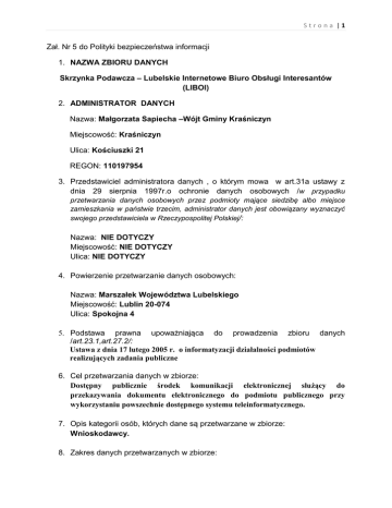 Strona |1 Zał. Nr 5 do Polityki bezpieczeństwa informacji 1. NAZWA ZBIORU DANYCH Skrzynka Podawcza – Lubelskie Internetowe Biuro Obsługi Interesantów (LIBOI) 2. ADMINISTRATOR DANYCH Nazwa: Małgorzata Sapiecha –Wójt Gminy Kraśniczyn Miejscowość: Kraśniczyn Ulica: Kościuszki 21 REGON: 110197954 3. Przedstawiciel administratora danych , o którym mowa w art.31a ustawy z dnia 29 sierpnia 1997r.o ochronie danych osobowych /w przypadku przetwarzania danych osobowych przez podmioty mające siedzibę albo miejsce zamieszkania w państwie trzecim, administrator danych jest obowiązany wyznaczyć swojego przedstawiciela w Rzeczypospolitej Polskiej/: Nazwa: NIE DOTYCZY Miejscowość: NIE DOTYCZY Ulica: NIE DOTYCZY 4. Powierzenie przetwarzanie danych osobowych: Nazwa: Marszałek Województwa Lubelskiego Miejscowość: Lublin 20-074 Ulica: Spokojna 4 5. Podstawa prawna upoważniająca do prowadzenia zbioru danych /art.23.1,art.27.2/: Ustawa z dnia 17 lutego 2005 r. o informatyzacji działalności podmiotów realizujących zadania publiczne 6. Cel przetwarzania danych w zbiorze: Dostępny publicznie środek komunikacji elektronicznej służący do przekazywania dokumentu elektronicznego do podmiotu publicznego przy wykorzystaniu powszechnie dostępnego systemu teleinformatycznego. 7. Opis kategorii osób, których dane są przetwarzane w zbiorze: Wnioskodawcy. 8. Zakres danych przetwarzanych w zbiorze: Strona |2 Nazwiska i imiona, Adres zamieszkania lub pobytu, Numer ewidencyjny PESEL, Numer telefonu 9. Sposób zbierania danych do zbioru: Od osób których dotyczą. 10. Sposób udostępniania danych ze zbioru: NIE DOTYCZY 11. Oznaczenie odbiorcy danych lub kategorii odbiorców , którym dane mogą być przekazywane: NIE DOTYCZY 12. Informacja dotycząca ewentualnego przekazywania danych do państwa trzeciego- rozumie się przez to państwo nienależące do Europejskiego Obszaru Gospodarczego : NIE DOTYCZY Uwaga : Administrator bezpieczeństwa informacji w ramach prowadzenia rejestru dokonuje: wpisania zbioru danych w przypadku rozpoczęciu przetwarzania w nim danych osobowych- wpisu dokonuje się niezwłocznie po rozpoczęciu przetwarzania danych w zbiorze; aktualizacji informacji dotyczących zbioru danych w przypadku zmiany informacji objętych wpisem; wykreślenia zbioru danych w przypadku zaprzestania przetwarzania w nim danych osobowych. Wszystkie zmiany związane z prowadzonym zbiorem są odnotowywane w wykazie zmian.