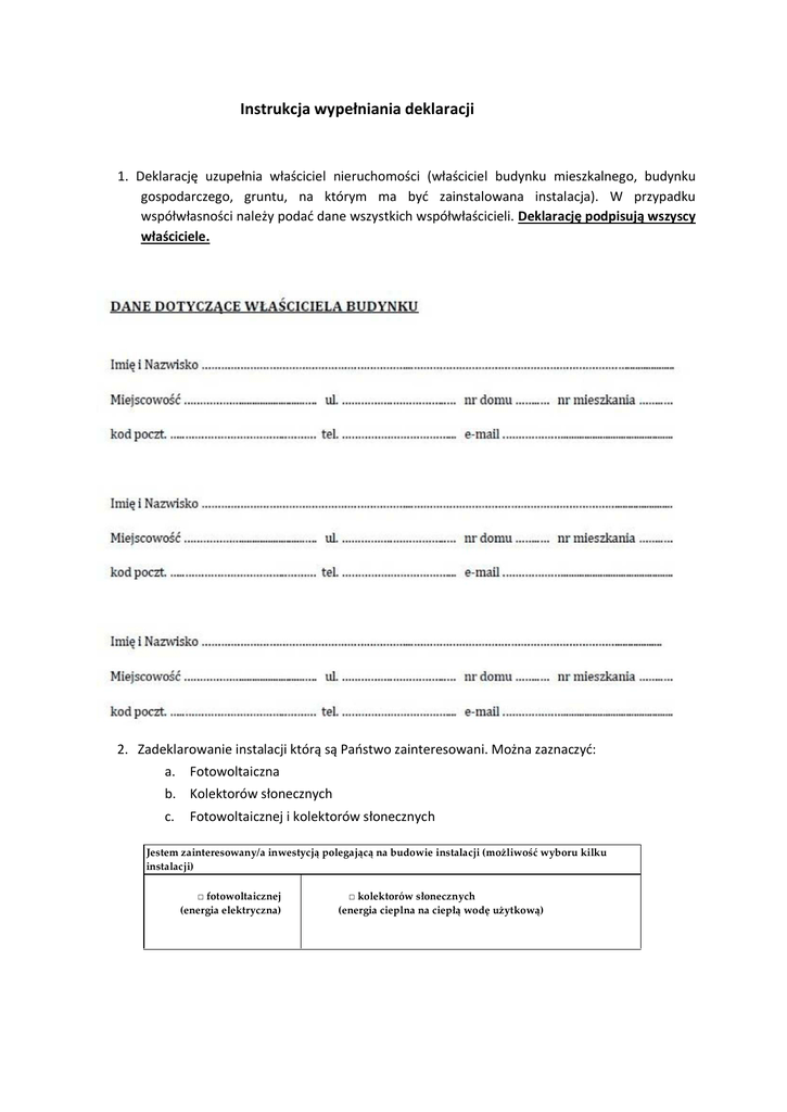 Instrukcja wype niania deklaracji 1. Deklaracj uzupe nia w ciciel nieruchomo ci (w ciciel budynku mieszkalnego, budynku gospodarczego, gruntu, na którym ma by zainstalowana instalacja). W przypadku wspó asno ci nale y poda dane wszystkich wspó cicieli. Deklaracj podpisuj wszyscy ciciele. 2. Zadeklarowanie instalacji któr s Pa stwo zainteresowani. Mo na zaznaczy : a. Fotowoltaiczna b. Kolektorów s onecznych c. Fotowoltaicznej i kolektorów s onecznych Jestem zainteresowany/a inwestycj polegaj instalacji) fotowoltaicznej (energia elektryczna) na budowie instalacji (mo liwo wyboru kilku kolektorów s onecznych (energia cieplna na ciep wod u ytkow ) Do deklaracji nale y za czy mapk ewidencyjn . Mapka, któr nale y do czy do deklaracji powinna pokazywa numer dzia ki, na której znajduj si nieruchomo ci i budynki. Mo na tak mapk wydrukowa z portalu: http://mapy.geoportal.gov.pl/imap/?gpmap=gp1 lub http://latowicz.e-mapa.net/ Prosimy o do czenie zdj cia powierzchni, gdzie ma by zainstalowana instalacja (zdj cie budynku z wyeksponowanym dachem od strony po udniowej lub zdj cie elewacji) Mile widziane podanie wymiarów budynku, dachu. 3. Wskazanie dwóch mo liwych lokalizacji instalacji. Nale y w tabeli wpisa mo liwe lokalizacje instalacji (budynek mieszkalny, budynek gospodarczy, grunt) w kolumnie o nazwie „obiekt A" i „Obiekt B". Na przyk ad w kolumnie „Obiekt A" we wskazane miejsce wpisa „Budynek mieszkalny" ,a w kolumnie „Obiekt B" wpisa „Grunt" lub „Budynek gospodarczy". I. Charakterystyka obiektów budowlanych wchodz cych w sk ad gospodarstwa domowego Wyszczególnienie Obiekt A Obiekt B 4. Podanie numeru dzia ek na której znajduj si nieruchomo ci. Je eli obiekt le y na wi cej ni jednej dzia ce nale y poda wszystkie numery dzia ek, na których po ony jest obiekt. W tabele nale y równie wpisa adres lokalizacji nieruchomo ci. Numer dzia ki/-ek (na której mie ci si obiekt) Adres nieruchomo ci 5. Nale y poda rok budowy obiektu oraz wskaza czy w ciciele uzupe nieni na pierwszej stronie deklaracji maj tytu prawny do obiektu jak równie wskaza czy budynki maj powy ej czy poni ej 300 m2 - informacja o powierzchni b dzie weryfikowana. Rok budowy Posiadany tytu prawny do obiektu (1) tak / nie * tak / nie * Powierzchnia u ytkowa budynku poni ej 300 m2 (2) tak / nie * tak / nie * 6. Dla instalacji kolektorów s onecznych oraz fotowoltaicznej nale y wskaza powierzchni na obiekcie do zainstalowania instalacji. Je eli powierzchni jest dach, na którym ma by zainstalowana instalacja fotowoltaiczna lub kolektorów s onecznych, to powinien by skierowany na po udnie z dopuszczalnym odchyleniem od po udnia o 2O0 (nie myli ze spadem dachu) na wschód lub na zachód. W przypadku wi kszych odchyle nale y wskaza , lokalizacj (w pozycji Obiekt B) dogodniejsz , b wskaza czy jest mo liwo zainstalowania instalacji na gruncie. Rekomendowanym miejscem instalacji kolektorów s onecznych jest dom mieszkalny. Instalacj fotowoltaiczn mo na zamontowa na domu mieszkalnym, budynku gospodarczym, na gruncie. Podaj c powierzchni na dachu spadowym lub p askim podajemy tak cz dachu stanowi zwart powierzchni bez przeszkód w postaci: okien, kominów itp. W przypadku monta u instalacji na dachach nale y poda rodzaj pokrycia dachowego (eternit, blacha, itd.). W przypadku monta u instalacji fotowoltaicznych na elewacji, prosimy pami ta , i w takich miejscach potrzeba dwa razy wi cej miejsca na 1 kW (potrzeba 12 m2 a nie 6 m2). Miejsca, gdzie b dzie instalacja (dach, grunt) nie powinny w ci gu dnia by zacieniane przez obiekty (drzewa, budynki). W przypadku instalacji na elewacji oraz w przypadku gdy W ciciel nieruchomo ci nie jest pewien czy si uda j zlokalizowa na obiekcie, prosimy o do czenie zdj cia wydrukowanego (czarnobia e jest wystarczaj ce) nieruchomo ci od strony po udniowej (dachu lub elewacji) lub przes anie zdj cia na adres e-mail: [email protected] z podaniem nr dzia ki oraz danych osoby zainteresowanej. Powierzchnia po udniowej ekspozycji dachu na instalacj wykorzystuj energi s ca w [m2] Lub Elewacji (gdy nie ma miejsca na dachu) Rodzaj pokrycia dachowego(3] 7. W przypadku wnioskowania o instalacj kolektorów s onecznych nale y poda ilo osób zamieszkuj cych dom mieszkalny na sta e. W przypadku, gdy cze rodziny (np. studiuj cy poza miejscem zamieszkania cz onkowie rodziny) przebywa w obiekcie tymczasowo nale y nie wlicza tych osób. Rodzaj pokrycia dachowego (3) Liczba osób Rodzaj ogrzewania 8. Nale y wskaza w jaki sposób jest wytwarzana ciep a woda u ytkowa (woda ciep a w bateriach umywalkowych) dla potrzeb wyliczenia efektu ekologicznego. W przypadku korzystania w zimie z kot owni a latem z bojlera elektrycznego mo na zaznaczy dwie opcje. Rodzaj ogrzewania Kocio - drewno/w giel Kocio gazowy Kocio olejowy Kocio na pelet Instalacja solaraa c.w.u. Bojler elektryczny c.w.u. Inny, wskaza jaki..................................................... tak / nie • tak / nie * tak / nie * tak / nie • tak / nie * tak / nie • tak / nie * tak / nie * tak / nie * tak / nie * tak / nie * tak / nie * 9. Nale y wskaza sytuacj jaka wyst puje u Pa stwa Czy pod jeden licznik jest przy czony*: a) Budynek/-ki mieszkalne bez dzia alno ci gospodarczej lub rolnej b) Budynek mieszkalny i dzia alno *-w gospodarcza lub rolna. ciwe zaznaczy 10. Nale y wskaza urz dzenia wykorzystywane w budynku mieszkalnym tylko i wy cznie. Osoby posiadaj ce gospodarstwo rolne, dzia alno gospodarcz dzia aj ce pod jednym wspólnym licznikiem z budynkiem mieszkalnym, musz t cz obowi zkowo wype ni . II. Wykaz energoch onnych urz dze elektrycznych w gospodarstwie domowym Rodzaj urz dzenia Lodówka Szt. Moc w [kW] Rodzaj urz dzenia elazko Zamra alka Odkurzacz Pralka Hydrofor Zmywarka Czajnik elektryczny Kuchenka elektryczna Grzejnik elektryczny Szt. Moc w [kW] 11. Nale y poda zu ycie energii elektrycznej w rozbiciu na okresy wskazane na fakturze (jednomiesi czne, dwumiesi czne lub pó roczne - tak jak otrzymywane s faktury) lub poda sumaryczne zu 