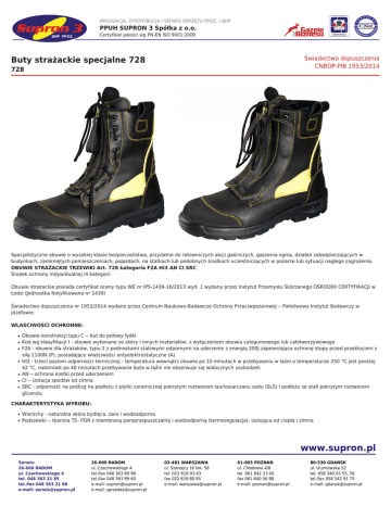 PRODUKCJA, DYSTRYBUCJA I SERWIS SPRZĘTU PPOŻ. I BHP PPUH SUPRON 3 Spółka z o.o. Certyfikat jakości wg PN-EN ISO 9001:2009 Świadectwo dopuszczenia CNBOP-PIB 1953/2014 Buty strażackie specjalne 728 728 Specjalistyczne obuwie o wysokiej klasie bezpieczeństwa, przydatne do ratowniczych akcji gaśniczych, gaszenia ognia, działań zabezpieczających w budynkach, zamkniętych pomieszczeniach, pojazdach, na statkach lub podobnych środkach uczestniczących w pożarze lub sytuacji nagłego zagrożenia. OBUWIE STRAŻACKIE TRZEWIKI Art. 728 kategoria F2A HI3 AN CI SRC Środek ochrony indywidualnej III kategorii Obuwie strażackie posiada certyfikat oceny typu WE nr IPS-1439-16/2013 wyd. 1 wydany przez Instytut Przemysłu Skórzanego OŚRODEK CERTYFIKACJI w Łodzi (Jednostka Notyfikowana nr 1439) Świadectwo dopuszczenia nr 1953/2014 wydane przez Centrum Naukowo-Badawcze Ochrony Przeciwpożarowej – Państwowy Instytut Badawczy w Józefowie. WLAŚCIWOŚCI OCHRONNE: ● ● ● ● ● ● ● Obuwie konstrukcji typu C – but do połowy łydki Kod wg klasyfikacji I - obuwie wykonane ze skóry i innych materiałów, z wyłączeniem obuwia całogumowego lub całotworzywowego F2A - obuwie dla strażaków, typu 2 z podnoskami stalowymi odpornymi na uderzenie z energią 200J zapewniające ochronę stopy przed przekłuciem z siłą 1100N (P), posiadające właściwości antyelektrostatyczne (A) HI3 - trzeci poziom odporności termicznej - temperatura wewnątrz obuwia po 10 minutach w przebywaniu w łaźni o temperaturze 250 °C jest poniżej 42 °C, natomiast po 40 minutach przebywania buta w łaźni nie obserwuje się widocznych uszkodzeń AN – ochrona kostki przed uderzeniem CI – izolacja spodów od zimna SRC - odporność na poślizg na podłożu z płytki ceramicznej pokrytym roztworem laurlosiarczanu sodu (SLS) i podłożu ze stali pokrytym roztworem glicerolu CHARAKTERYSTYKA WYROBU: ● ● Wierzchy - naturalna skóra bydlęca, żaro i wodoodporna Podszewki – tkanina TE- POR z membraną paroprzepuszczalną i wodoodporną (termoregulacja); izolująca od ciepła i zimna www.supron.pl Serwis: 26-600 RADOM ul. Czachowskiego 4 tel. 048 363 21 85 tel./fax 048 363 21 86 e-mail: [email protected] 26-600 RADOM ul. Czachowskiego 4 tel./fax 048 363 89 98 tel./fax 048 363 99 65 e-mail: [email protected] e-mail: [email protected] 03-481 WARSZAWA ul. Szanajcy 16 lok. 56 tel. 022 618 93 63 fax 022 619 80 05 e-mail: [email protected] 61-003 POZNAŃ ul. Chlebowa 4/8 tel. 061 842 23 00 fax 061 840 06 88 e-mail: [email protected] 80-530 GDAŃSK ul. Uczniowska 52 tel. 058 340 03 55, 56 tel./fax 058 342 91 75 e-mail: [email protected] PRODUKCJA, DYSTRYBUCJA I SERWIS SPRZĘTU PPOŻ. I BHP PPUH SUPRON 3 Spółka z o.o. Certyfikat jakości wg PN-EN ISO 9001:2009 ● ● ● ● ● ● ● ● Podnoski - stalowe odporne na uderzenie z energią 200 J oraz ściśnięcie z siłą 15 kN Wyściółka - włóknina wyściółkowa przeszywana nicią antyelektrostatyczną Wkładka kevlarowa antyprzebiciowa – elastyczna, chroniącą stopę przed przebiciem z siłą 1100 N Spody - gumowe, żaroodporne, olejoodporne Podwójny system zapinania - sznurowadła z włókna + zamek błyskawiczny System montażu – klejony Obuwie dostępne w wariancie z ochrona sznurowadeł lub bez Dostępna numeracja od 40 do 46 Zastosowane materiały, system montażu obuwia oraz wdrożony w firmie System Zarządzania Jakością wg norm PN-EN ISO 9001:2009 «Systemy zarządzania jakością. Wymagania.», oraz AQAP 2110:2009 «Wymagania NATO dotyczące zapewnienia jakości w projektowaniu, pracach rozwojowych i produkcji.», zapewniają obuwiu bardzo wysoką jakość oraz doskonałe walory użytkowe i funkcjonalne. ZASTOSOWANIE: Obuwie specjalne art. 728 zostały zaprojektowane z myślą o maksymalnym bezpieczeństwie i wygodzie użytkownika. Skomponowana z żaroodpornych i wodoodpornych naturalnych skór cholewka została wyposażona w komponenty chroniące kostkę przed uderzeniem oraz pianki stabilizujące kostkę. Każdy umieszczony element został dobrany w sposób przemyślany. ● ● ● ● ● ● ● ● ● ● ● Amortyzator w tylniku chroni ścięgno Achillesa; Pikowanie języka umożliwia swobodne zginanie nogi; Specjalnie ukształtowany język oraz uchwyty w górnej części obłożyny ułatwiają zakładanie obuwia; Materiały odblaskowe specjalnie wkomponowane w konstrukcje cholewki, zapewniają widoczność użytkownika podnoszą jego bezpieczeństwo; Żaroodporny nadnosek oraz wzmocnienie w części przyśrodkowej obuwia to dodatkowy element ochrony podnoszący odporność na mechaniczne uszkodzenia skóry; Podnoski stalowe maksymalnie szerokie i dokładnie dobrane, chronią palce stopy ; Elastyczna, lekka wkładka kevlarowa chroni stopę przed przebiciem ; System wielofunkcyjnych, anatomicznie i stabilnie uformowanych podopdeszew oraz spodu obuwia, zapewniają maksymalny komfort użytkowania. Spody - gumowe, żaroodporne, olejoodporne, o podwyższonej wytrzymałości na uszkodzenia mechaniczne. Specjalna konstrukcja bieżnika zawierająca system szczelin doskonale odprowadzających płyny zwiększający przyczepność do podłoża. Dodatkowe ustępy w konstrukcji tylnej części podeszwy ułatwiają zdjęcie obuwia oraz elementy w części śródstopia podeszwy wspomagające przyczepność (np. wchodzenia po drabinie); System absorpcji energii w części pięty, łagodzenie wstrząsów podczas poruszania się; Miejsce w wewnętrznej części cholewki pozwalające na umieszczenie personaliów użytkownika obuwia Ochrona sznurowadeł (nr katalogowy 111-728) PRZECHOWYWANIE: Obuwie pakowano w pudełka jednostkowe, a następnie w kartony 5-cio parowe. Na bocznej stronie pudełek jednostkowych oraz kartonu umieszczono winietkę zawierającą podstawowe dane dotyczące producenta i obuwia np. nazwa i adres producenta, numer wzoru, kolor itp. Kartony powinny być przechowywane na regałach lub paletach ustawionych na podestac