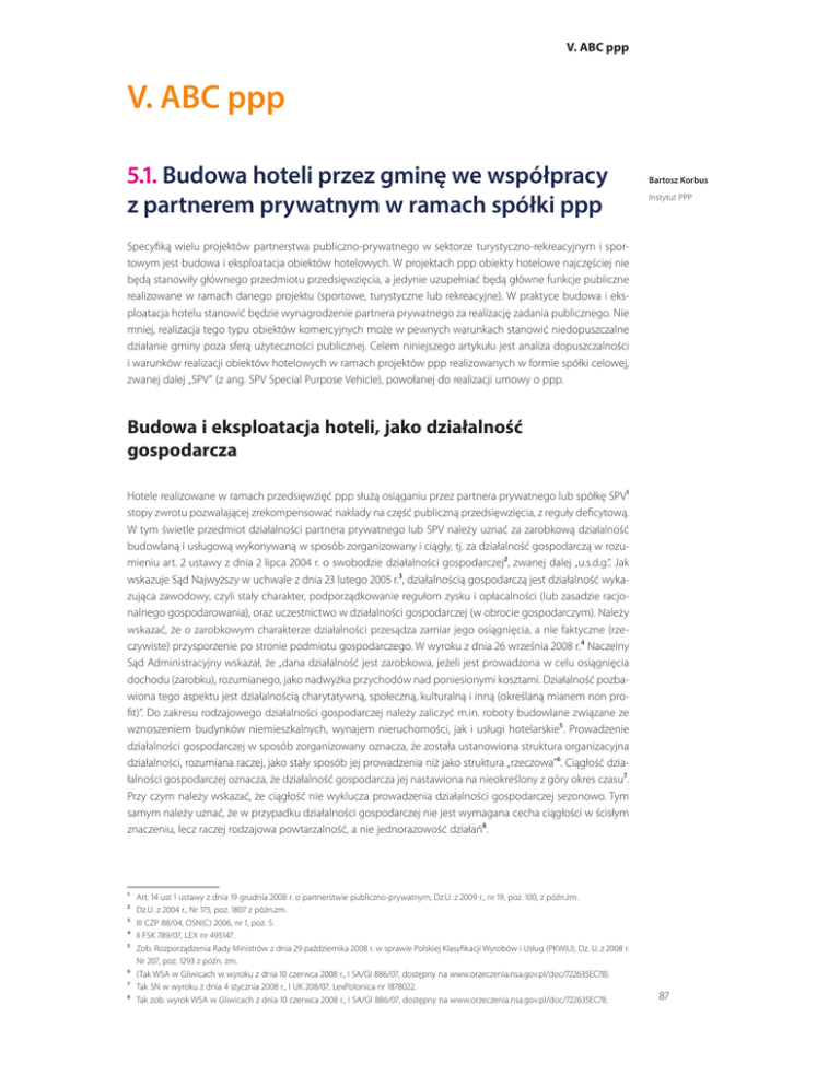 V. ABC ppp V. ABC ppp 5.1. Budowa hoteli przez gminę we współpracy z partnerem prywatnym w ramach spółki ppp Bartosz Korbus Instytut PPP Specyfiką wielu projektów partnerstwa publiczno-prywatnego w sektorze turystyczno-rekreacyjnym i sportowym jest budowa i eksploatacja obiektów hotelowych. W projektach ppp obiekty hotelowe najczęściej nie będą stanowiły głównego przedmiotu przedsięwzięcia, a jedynie uzupełniać będą główne funkcje publiczne realizowane w ramach danego projektu (sportowe, turystyczne lub rekreacyjne). W praktyce budowa i eksploatacja hotelu stanowić będzie wynagrodzenie partnera prywatnego za realizację zadania publicznego. Nie mniej, realizacja tego typu obiektów komercyjnych może w pewnych warunkach stanowić niedopuszczalne działanie gminy poza sferą użyteczności publicznej. Celem niniejszego artykułu jest analiza dopuszczalności i warunków realizacji obiektów hotelowych w ramach projektów ppp realizowanych w formie spółki celowej, zwanej dalej „SPV” (z ang. SPV Special Purpose Vehicle), powołanej do realizacji umowy o ppp. Budowa i eksploatacja hoteli, jako działalność gospodarcza Hotele realizowane w ramach przedsięwzięć ppp służą osiąganiu przez partnera prywatnego lub spółkę SPV1 stopy zwrotu pozwalającej zrekompensować nakłady na część publiczną przedsięwzięcia, z reguły deficytową. W tym świetle przedmiot działalności partnera prywatnego lub SPV należy uznać za zarobkową działalność budowlaną i usługową wykonywaną w sposób zorganizowany i ciągły, tj. za działalność gospodarczą w rozumieniu art. 2 ustawy z dnia 2 lipca 2004 r. o swobodzie działalności gospodarczej2, zwanej dalej „u.s.d.g.”. Jak wskazuje Sąd Najwyższy w uchwale z dnia 23 lutego 2005 r.3, działalnością gospodarczą jest działalność wykazująca zawodowy, czyli stały charakter, podporządkowanie regułom zysku i opłacalności (lub zasadzie racjonalnego gospodarowania), oraz uczestnictwo w działalności gospodarczej (w obrocie gospodarczym). Należy wskazać, że o zarobkowym charakterze działalności przesądza zamiar jego osiągnięcia, a nie faktyczne (rzeczywiste) przysporzenie po stronie podmiotu gospodarczego. W wyroku z dnia 26 września 2008 r.4 Naczelny Sąd Administracyjny wskazał, że „dana działalność jest zarobkowa, jeżeli jest prowadzona w celu osiągnięcia dochodu (zarobku), rozumianego, jako nadwyżka przychodów nad poniesionymi kosztami. Działalność pozbawiona tego aspektu jest działalnością charytatywną, społeczną, kulturalną i inną (określaną mianem non profit)”. Do zakresu rodzajowego działalności gospodarczej należy zaliczyć m.in. roboty budowlane związane ze wznoszeniem budynków niemieszkalnych, wynajem nieruchomości, jak i usługi hotelarskie5. Prowadzenie działalności gospodarczej w sposób zorganizowany oznacza, że została ustanowiona struktura organizacyjna działalności, rozumiana raczej, jako stały sposób jej prowadzenia niż jako struktura „rzeczowa”6. Ciągłość działalności gospodarczej oznacza, że działalność gospodarcza jej nastawiona na nieokreślony z góry okres czasu7. Przy czym należy wskazać, że ciągłość nie wyklucza prowadzenia działalności gospodarczej sezonowo. Tym samym należy uznać, że w przypadku działalności gospodarczej nie jest wymagana cecha ciągłości w ścisłym znaczeniu, lecz raczej rodzajowa powtarzalność, a nie jednorazowość działań8. 1 2 3 4 5 Art. 14 ust 1 ustawy z dnia 19 grudnia 2008 r. o partnerstwie publiczno-prywatnym, Dz.U. z 2009 r., nr 19, poz. 100, z późn.zm. Dz.U. z 2004 r., Nr 173, poz. 1807 z póżn.zm. III CZP 88/04, OSN(C) 2006, nr 1, poz. 5. II FSK 789/07, LEX nr 495147. Zob. Rozporządzenia Rady Ministrów z dnia 29 października 2008 r. w sprawie Polskiej Klasyfikacji Wyrobów i Usług (PKWiU), Dz. U. z 2008 r. Nr 207, poz. 1293 z późn. zm. 6 (Tak WSA w Gliwicach w wyroku z dnia 10 czerwca 2008 r., I SA/GI 886/07, dostępny na www.orzeczenia.nsa.gov.pl/doc/722635EC78). 7 Tak SN w wyroku z dnia 4 stycznia 2008 r., I UK 208/07, LexPolonica nr 1878022. 8 Tak zob. wyrok WSA w Gliwicach z dnia 10 czerwca 2008 r., I SA/Gl 886/07, dostępny na www.orzeczenia.nsa.gov.pl/doc/722635EC78. 87 V. ABC ppp Budowa i eksploatacja hoteli, a zadania własne gminy. Ze względu na to, że budowa hoteli służyć ma w ramach umowy o ppp wykonywaniu działalności gospodarczej, należy rozstrzygnąć, czy gmina może podejmować się działalności gospodarczej w zakresie budowy i wynajmu obiektów hotelowych (zlecając je partnerowi prywatnemu lub SPV). Nadmienić należy, że zgodnie z art. 20 Konstytucji Rzeczypospolitej Polskiej podstawą ustroju gospodarczego w naszym kraju jest społeczna gospodarka rynkowa oparta na wolności działalności gospodarczej, własności prywatnej oraz solidarności, dialogu i współpracy partnerów społecznych. Ograniczenie wolności działalności gospodarczej jest dopuszczalne tylko w drodze ustawy i tylko ze względu na ważny interes publiczny (art. 22 Konstytucji RP). Wolność gospodarczą gminy ograniczają przepisy ustawy z dnia 20 grudnia 1996 r. o gospodarce komunalnej9, zwanej dalej „u.g.k.”. Przedmiotowa ustawa określa zasady i formy gospodarki komunalnej jednostek samorządu terytorialnego (JST). Gospodarka komunalna JST polega na wykonywaniu przez te jednostki zadań własnych w celu zaspokojenia zbiorowych potrzeb wspólnoty samorządowej (art. 1 ust. 1 u.g.k.). Z powyższego przepisu wynikają jednoznacznie dwie normy: działalność gospodarczą gmina może wykonywać jedynie w zakresie zadań własnych i jedynie w celu zaspakajania zbiorowych potrzeb wspólnoty samorządowej10. Nie będzie a contrario dopuszczalne wykonywanie przez gminę działalności gospodarczej poza zakresem zadań własnych lub w innym celu niż zaspokajanie zbiorowych potrzeb wspólnoty lokalnej. Zasadnicza odmienność między gospodarką