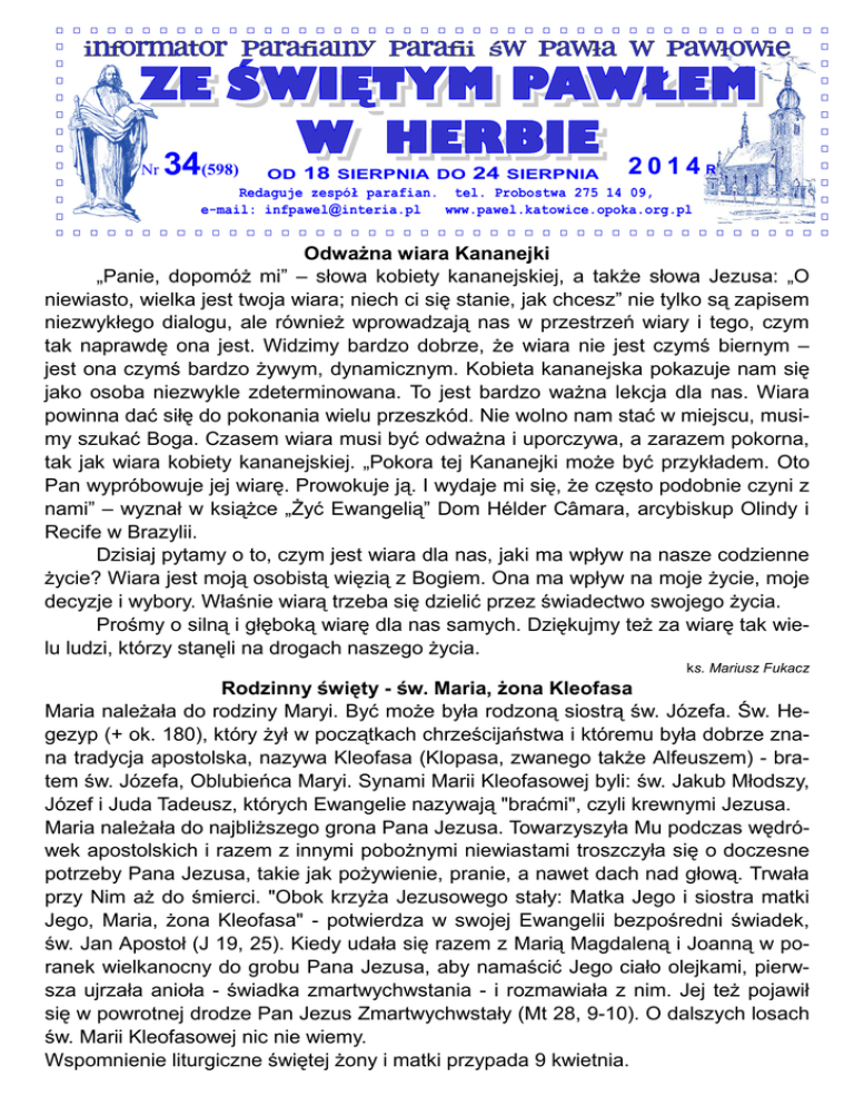 Nr 34(598) 2014 R. OD 18 SIERPNIA DO 24 SIERPNIA Redaguje zespół parafian. tel. Probostwa 275 14 09, e-mail: [email protected] www.pawel.katowice.opoka.org.pl Odważna wiara Kananejki „Panie, dopomóż mi” – słowa kobiety kananejskiej, a także słowa Jezusa: „O niewiasto, wielka jest twoja wiara; niech ci się stanie, jak chcesz” nie tylko są zapisem niezwykłego dialogu, ale również wprowadzają nas w przestrzeń wiary i tego, czym tak naprawdę ona jest. Widzimy bardzo dobrze, że wiara nie jest czymś biernym – jest ona czymś bardzo żywym, dynamicznym. Kobieta kananejska pokazuje nam się jako osoba niezwykle zdeterminowana. To jest bardzo ważna lekcja dla nas. Wiara powinna dać siłę do pokonania wielu przeszkód. Nie wolno nam stać w miejscu, musimy szukać Boga. Czasem wiara musi być odważna i uporczywa, a zarazem pokorna, tak jak wiara kobiety kananejskiej. „Pokora tej Kananejki może być przykładem. Oto Pan wypróbowuje jej wiarę. Prowokuje ją. I wydaje mi się, że często podobnie czyni z nami” – wyznał w książce „Żyć Ewangelią” Dom Hélder Câmara, arcybiskup Olindy i Recife w Brazylii. Dzisiaj pytamy o to, czym jest wiara dla nas, jaki ma wpływ na nasze codzienne życie? Wiara jest moją osobistą więzią z Bogiem. Ona ma wpływ na moje życie, moje decyzje i wybory. Właśnie wiarą trzeba się dzielić przez świadectwo swojego życia. Prośmy o silną i głęboką wiarę dla nas samych. Dziękujmy też za wiarę tak wielu ludzi, którzy stanęli na drogach naszego życia. ks. Mariusz Fukacz Rodzinny święty - św. Maria, żona Kleofasa Maria należała do rodziny Maryi. Być może była rodzoną siostrą św. Józefa. Św. Hegezyp (+ ok. 180), który żył w początkach chrześcijaństwa i któremu była dobrze znana tradycja apostolska, nazywa Kleofasa (Klopasa, zwanego także Alfeuszem) - bratem św. Józefa, Oblubieńca Maryi. Synami Marii Kleofasowej byli: św. Jakub Młodszy, Józef i Juda Tadeusz, których Ewangelie nazywają "braćmi", czyli krewnymi Jezusa. Maria należała do najbliższego grona Pana Jezusa. Towarzyszyła Mu podczas wędrówek apostolskich i razem z innymi pobożnymi niewiastami troszczyła się o doczesne potrzeby Pana Jezusa, takie jak pożywienie, pranie, a nawet dach nad głową. Trwała przy Nim aż do śmierci. "Obok krzyża Jezusowego stały: Matka Jego i siostra matki Jego, Maria, żona Kleofasa" - potwierdza w swojej Ewangelii bezpośredni świadek, św. Jan Apostoł (J 19, 25). Kiedy udała się razem z Marią Magdaleną i Joanną w poranek wielkanocny do grobu Pana Jezusa, aby namaścić Jego ciało olejkami, pierwsza ujrzała anioła - świadka zmartwychwstania - i rozmawiała z nim. Jej też pojawił się w powrotnej drodze Pan Jezus Zmartwychwstały (Mt 28, 9-10). O dalszych losach św. Marii Kleofasowej nic nie wiemy. Wspomnienie liturgiczne świętej żony i matki przypada 9 kwietnia. Dobra wiadomość Robert De Vincenzo, słynny argentyński gracz w golfa, wygrał kiedyś turniej, otrzymał stosowny czek, po czym obdzielił uśmiechami fotoreporterów i zaczął szykować się do odejścia. Kiedy samotnie kierował się w stronę ustawionego na parkingu samochodu, podeszła do niego młoda kobieta, która pogratulowała mu zwycięstwa i powiedziała, że jej dziecko cierpi na śmiertelną chorobę. Rzecz jasna, nie miała środków na zapłacenie rachunków za usługi lekarskie i szpital. Poruszony jej opowieścią De Vincenzo wyjął pióro i wypisał swój będący nagrodą czek na nazwisko tej kobiety. Niech pani zapewni dziecku wszystko, co najlepsze - powiedział, wsuwając do w jej dłoń. W następnym tygodniu podczas lunchu w klubie podszedł do niego członek władz Zrzeszenia Profesjonalnych Graczy w Golfa i powiedział: W zeszłym tygodniu chłopcy z parkingu mówili mi, że po turnieju spotkał pan młodą kobietę. - De Vincenzo przytaknął. - Cóż! - westchnął mężczyzna. - Mam dla pana kiepską wiadomość. To wariatka. Ona nie ma żadnego dziecka. Nawet nie jest mężatką. Zwyczajnie pana nabrała, przyjacielu. Chce pan powiedzieć, że nie ma żadnego umierającego dziecka? - spytał De Vincenzo. Właśnie. Ależ to najwspanialsza wiadomość, jaką usłyszałem w tym tygodniu! Ogłoszenie! 24.08.2014 r., odbędzie się akcja rejestracji potencjalnych dawców pod nazwą "Pomóż Ewelinie i innym". Podczas Dnia Dawcy Szpiku wszystkie zdrowe osoby, w wieku 18-55 lat mogą bezpłatnie zarejestrować się w bazie potencjalnych dawców szpiku i komórek macierzystych Fundacji DKMS Polska. Zajmuje to tylko chwilę, polega na przeprowadzeniu wstępnego wywiadu medycznego, wypełnieniu formularza z danymi osobowymi oraz pobraniu wymazu z wewnętrznej strony błony śluzowej policzka. Gorąco zachęcamy do zapoznania się z szczegółami bycia potencjalnym dawcą szpiku oraz ewentualnej rejestracji. godz. 10:00 - 16:00, Szkoła Podstawowa nr 25 im. Jana Pawła II, ul. Kotarbińskiego 18, Zabrze godz. 9:00 - 15:00, Dom Parafialny przy kościele pw. św. Anny, ul. 3 maja 18, Zabrze godz. 9:00 - 15:00, Rzymsko-Katolicka Parafia NMP Matki Kościoła w ZabrzuHelence, ul. Dr Jordana 84, Zabrze godz. 9:00 - 13:00; 17:00 - 19:00 Kościół św. Wojciecha, ul. Jana Heweliusza 4, Zabrze Fundacja DKMS Baza Dawców Komórek Macierzystych Polska ul. Altowa 6 lok. 9, 02-386 Warszawa, T +48228829400, F +48228829402, e-mail: [email protected], www.dkms.pl KRS: 0000318602, REGON: 141667781, NIP: 522-29°-86-59, nr konta: PEKAO SA 78124059181111001022253391 OGŁOSZENIA DUSZPASTERSKIE • Dziś odbywa się pielgrzymka kobiet i panien do Matki Boskiej Piekarskiej. Łączymy się w modlitwie z pielgrzymującymi do piekarskiego Sanktuarium. • Zapraszam na Nieszpory w niedzielę o godz. 1630. • W czwartek po rannej Mszy św. zapraszam na Adorację Najświętszego Sakramentu. • Okazja do Spowiedzi św. codziennie przed każdą Mszą św. • Trwają urlopy i wakacje. Bogu powierzajmy n